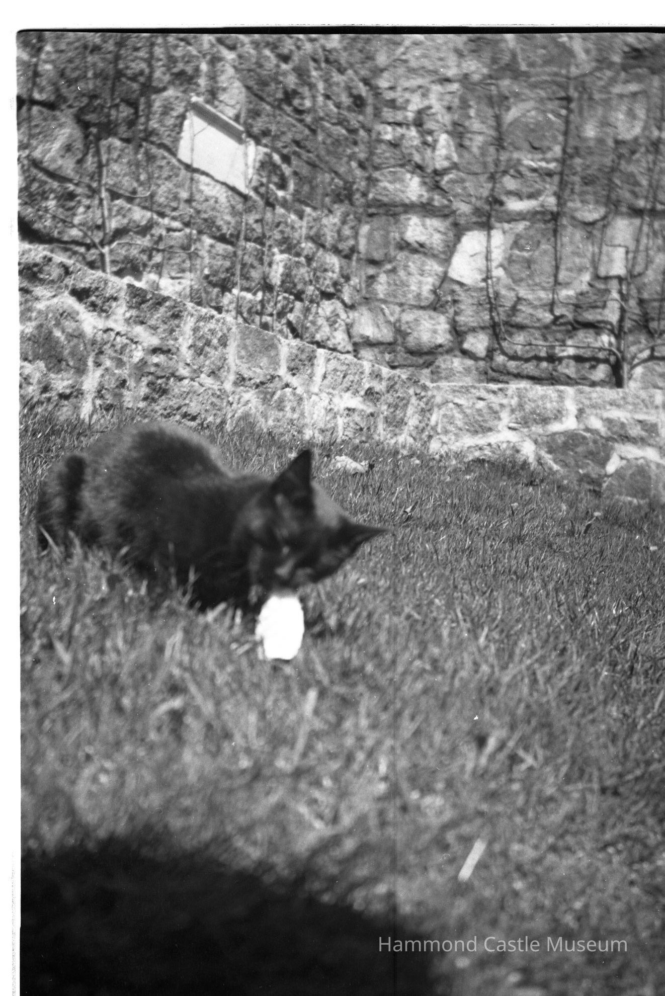 Negative of black cat in cat garden