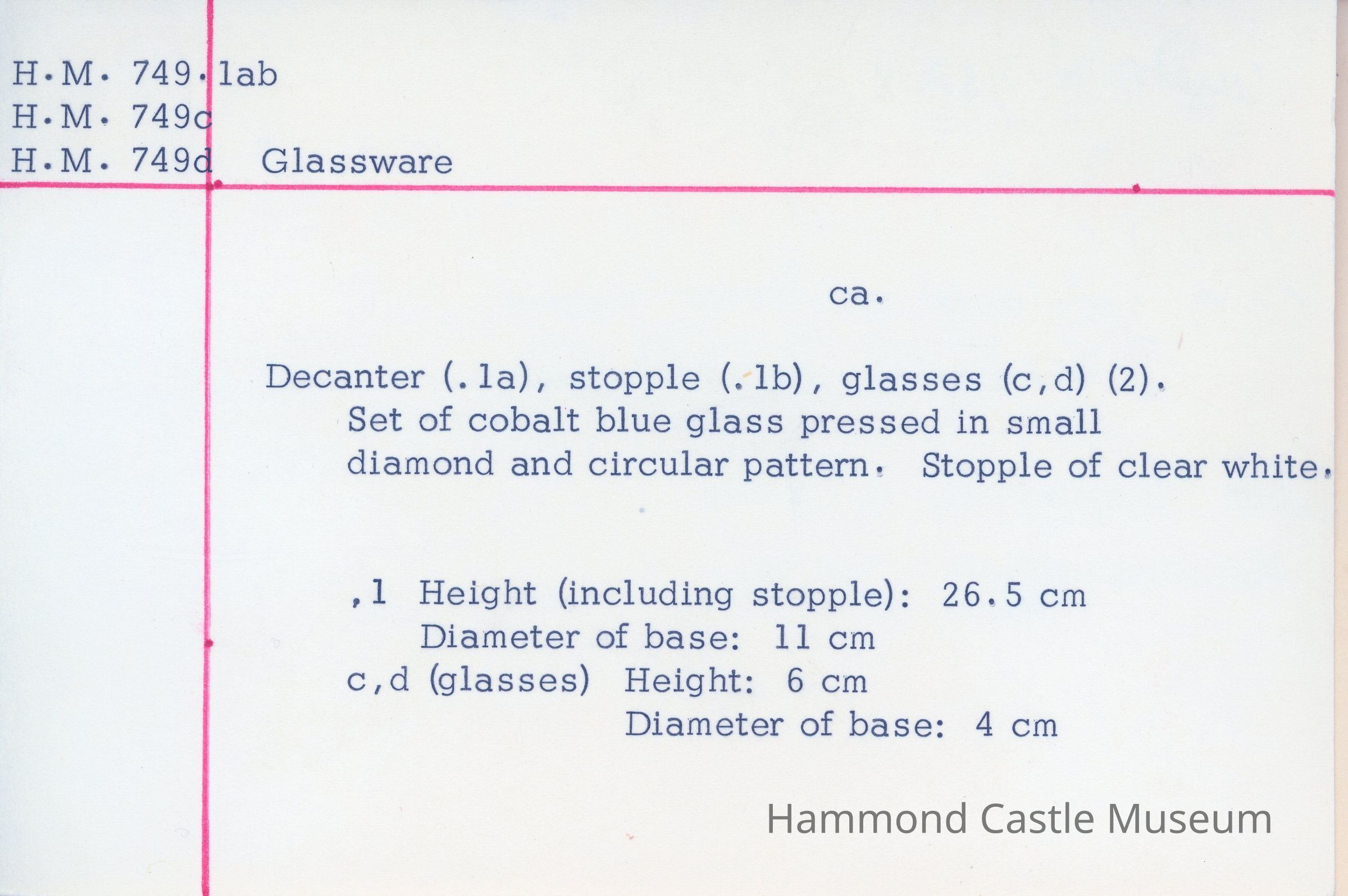 Blue glass decater set .1 a&b bottle & stopper c, d glasses Deaccessioned 1991