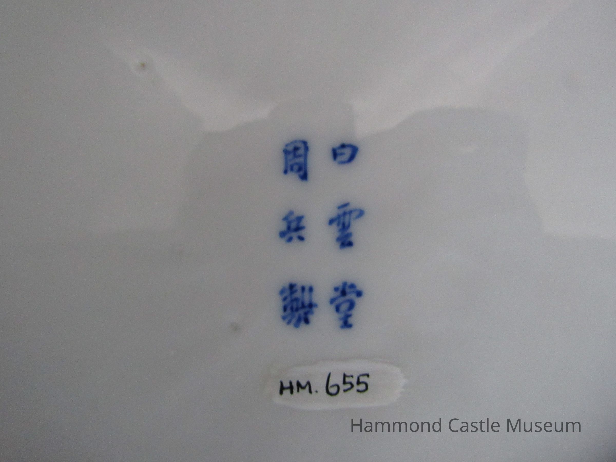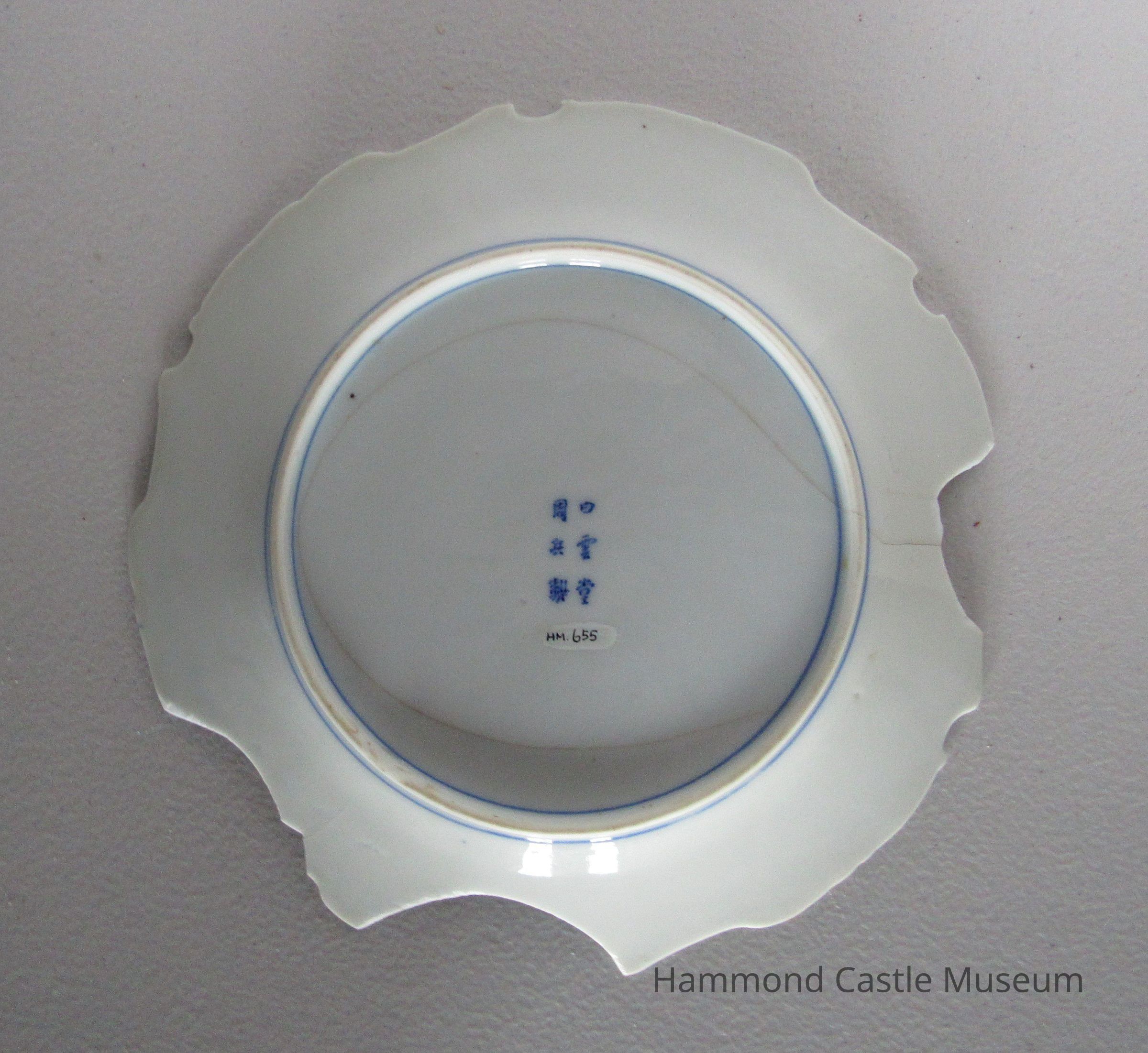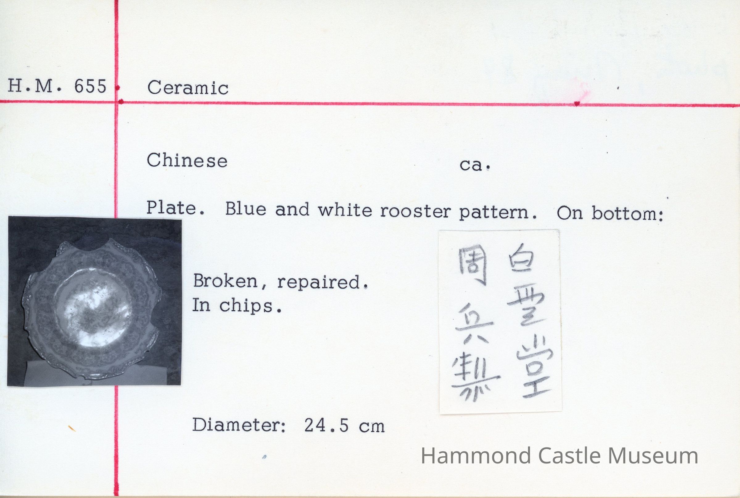 Chinese plate. Blue and rooster pattern. Broken, repaired, in chips. Markings on bottom. Six chinese symbols.