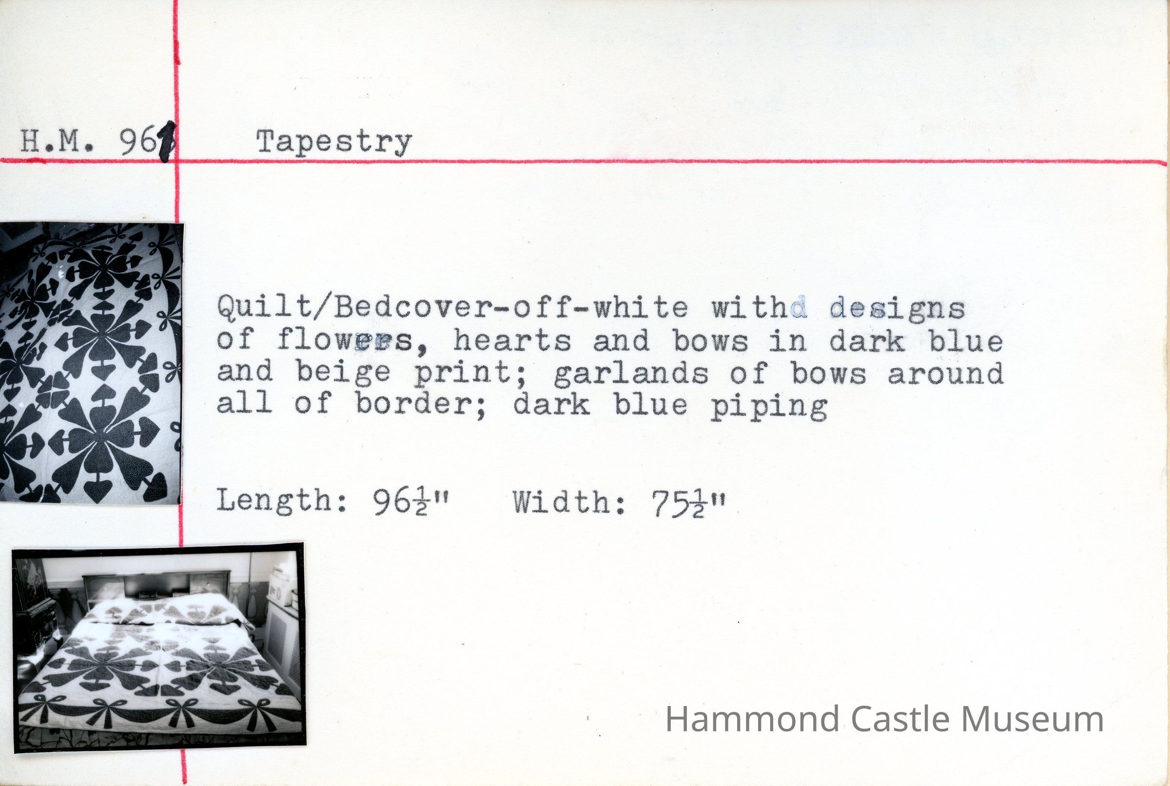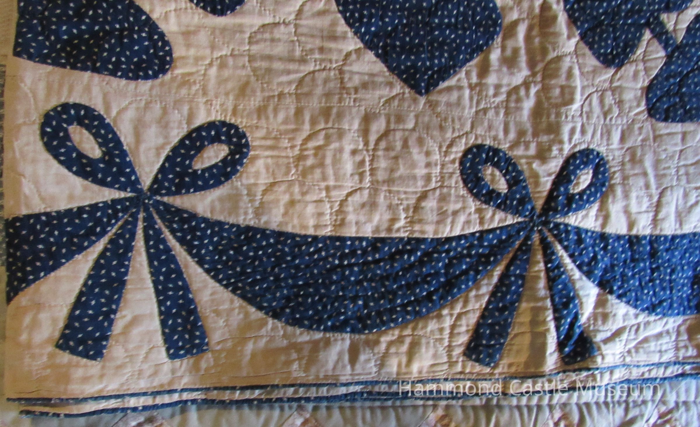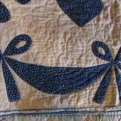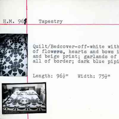 Quilt/bedcover, off-white, with designs of flowers, hearts and bows in dark blue and beige print; garlands of bows around all of border; dark blue piping as decoration. At one point in Upper American Guestroom on twin beds.