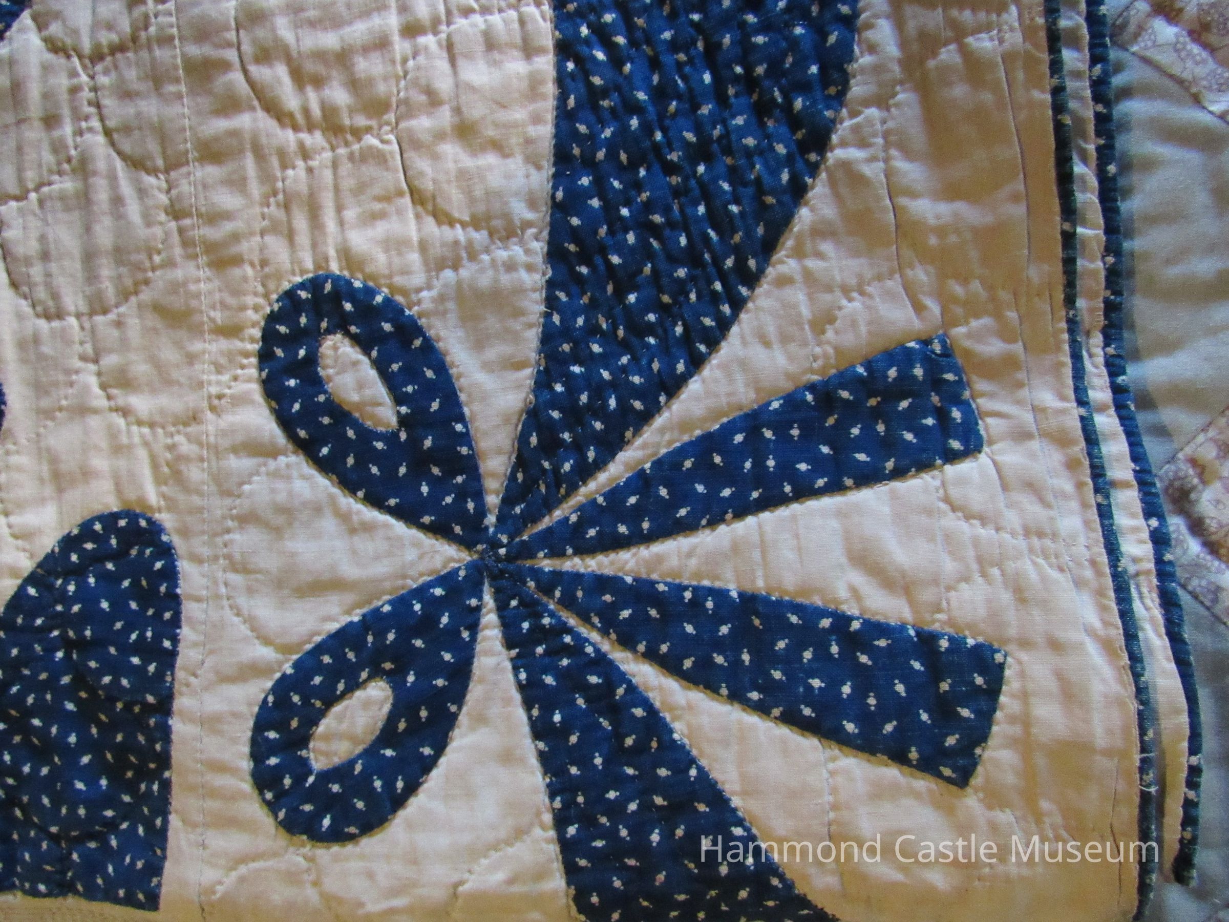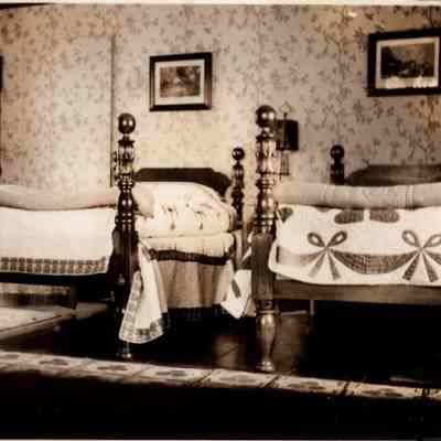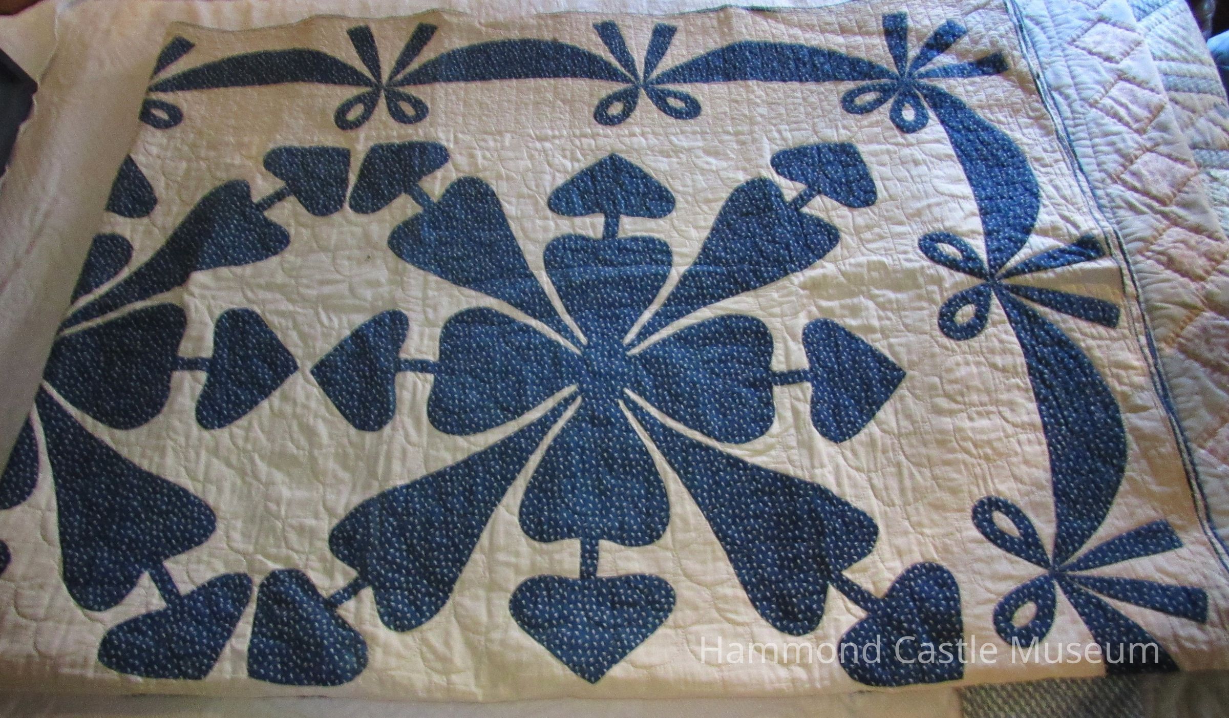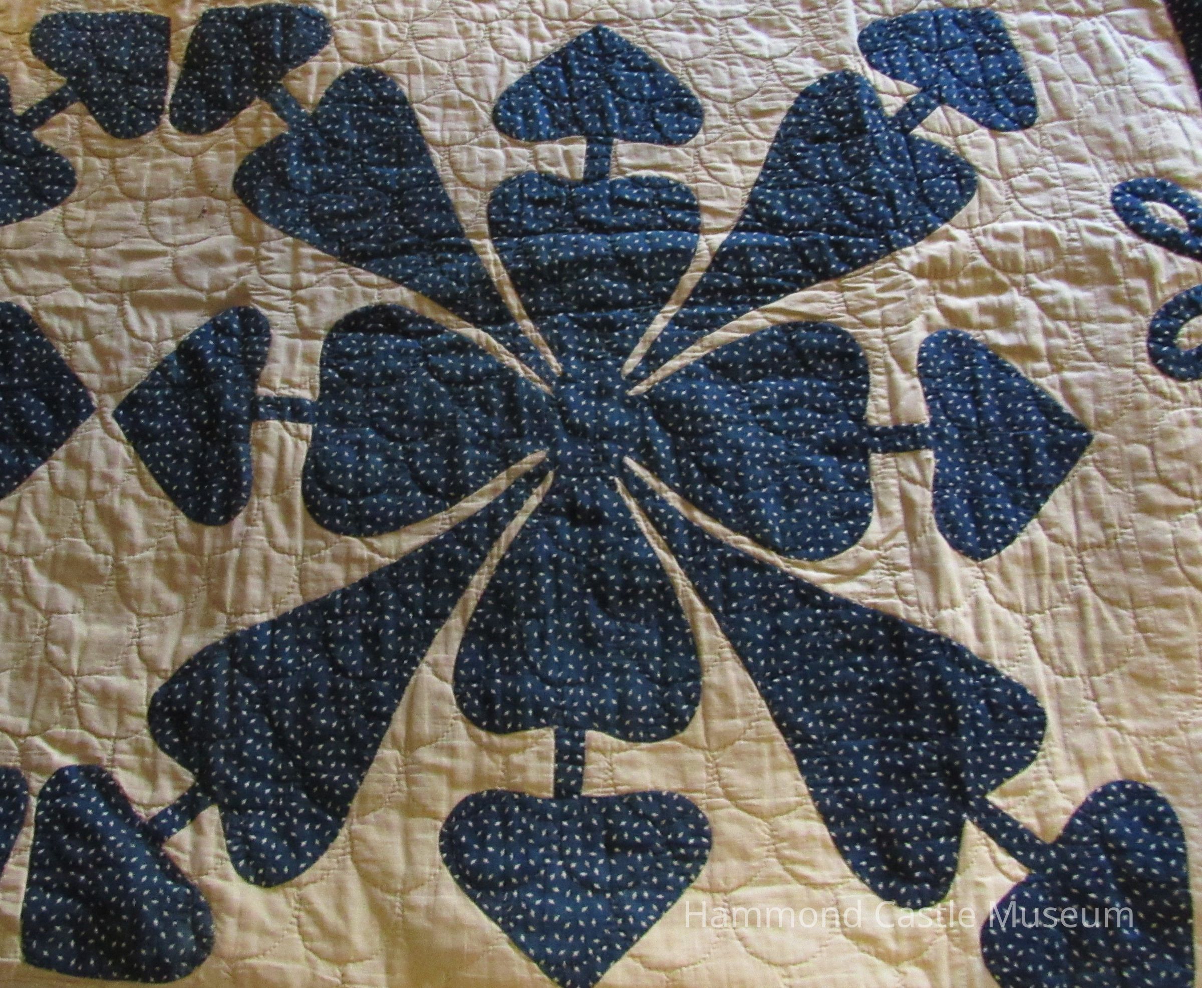 Quilt/bedcover, off-white, with designs of flowers, hearts and bows in dark blue and beige print; garlands of bows around all of border; dark blue piping as decoration. At one point in Upper American Guestroom on twin beds.