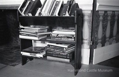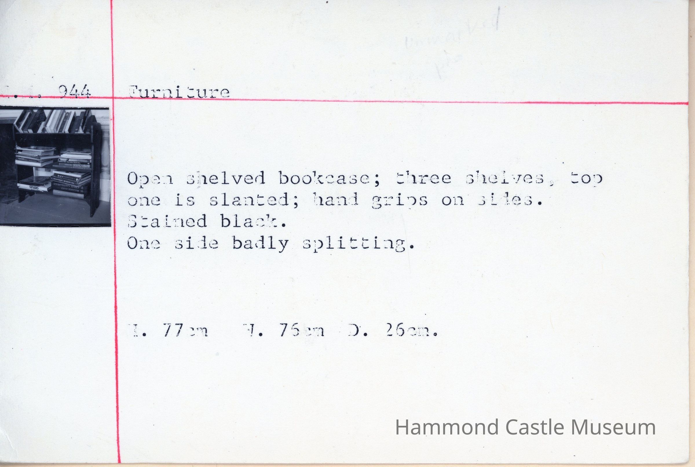 Open shelved bookcase; three shelves, top one is slanted; hand grips on sides. Stained black.