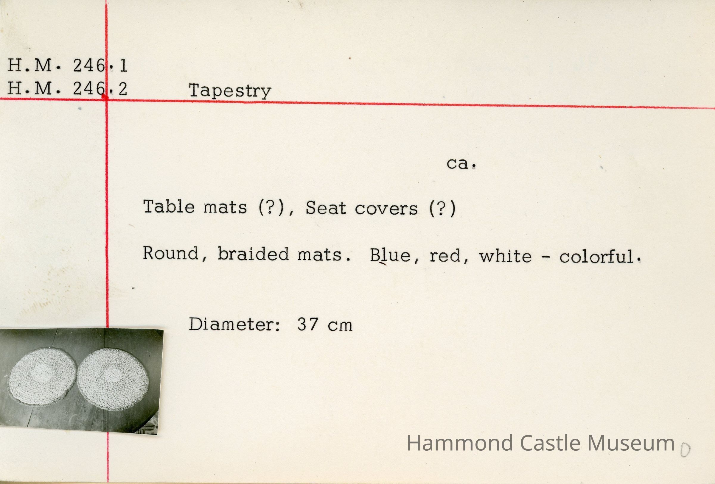 Pair of either two table mats or seat covers. Round, braided mats are blue, red, and white (colorful).