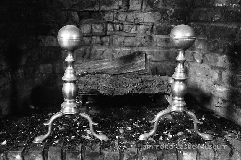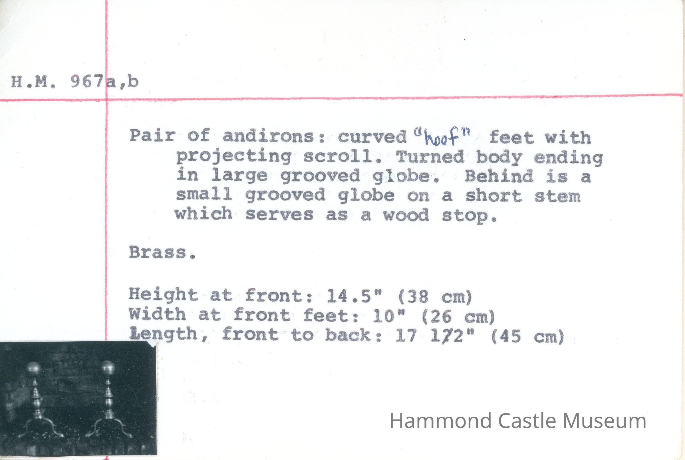 Pair of andirons: curved "hoof" feet with projecting scroll. Turned body ending in large grooved globe. Behind is a small grooved globe on a short stem which serves as a wood stop.