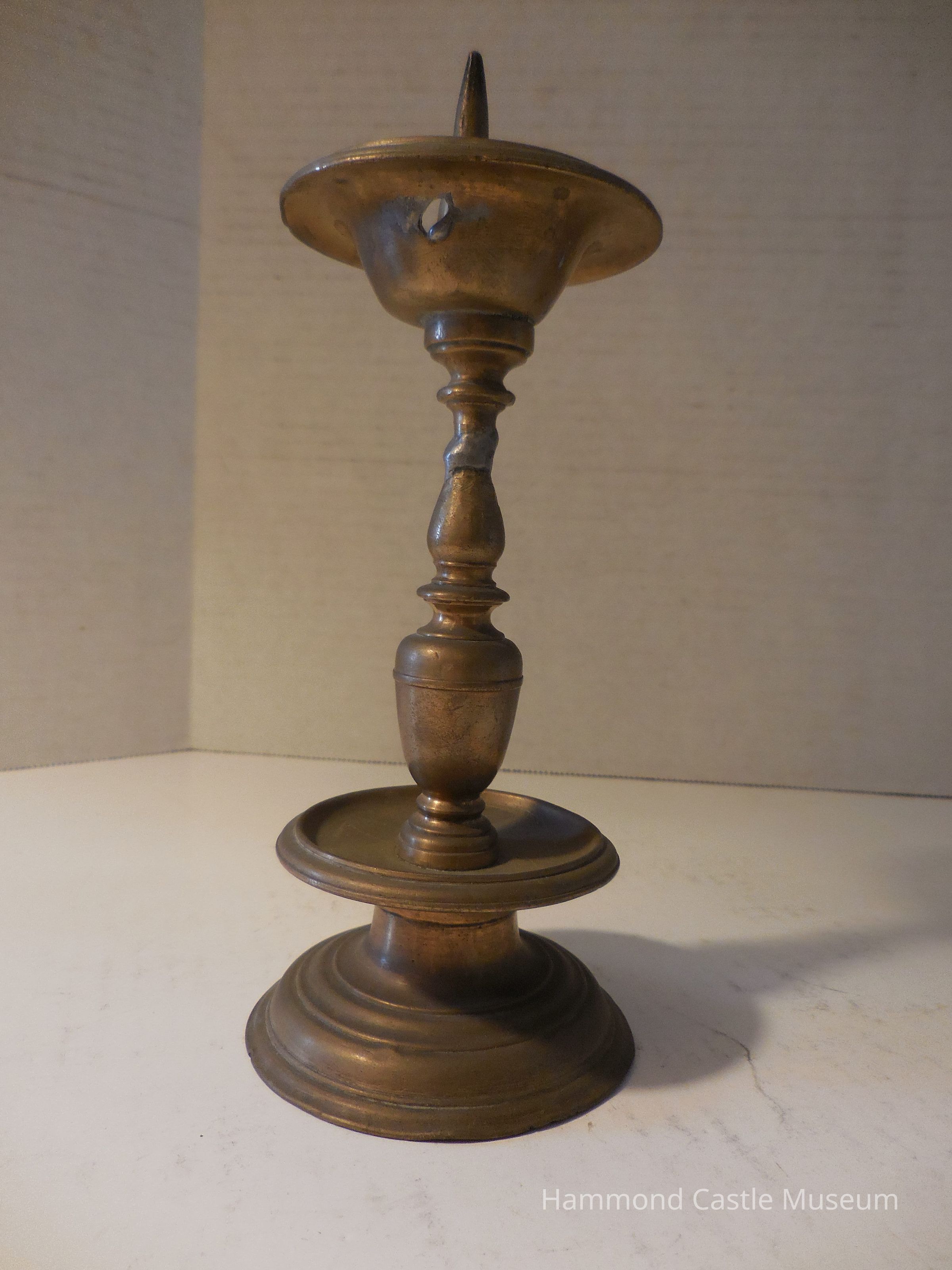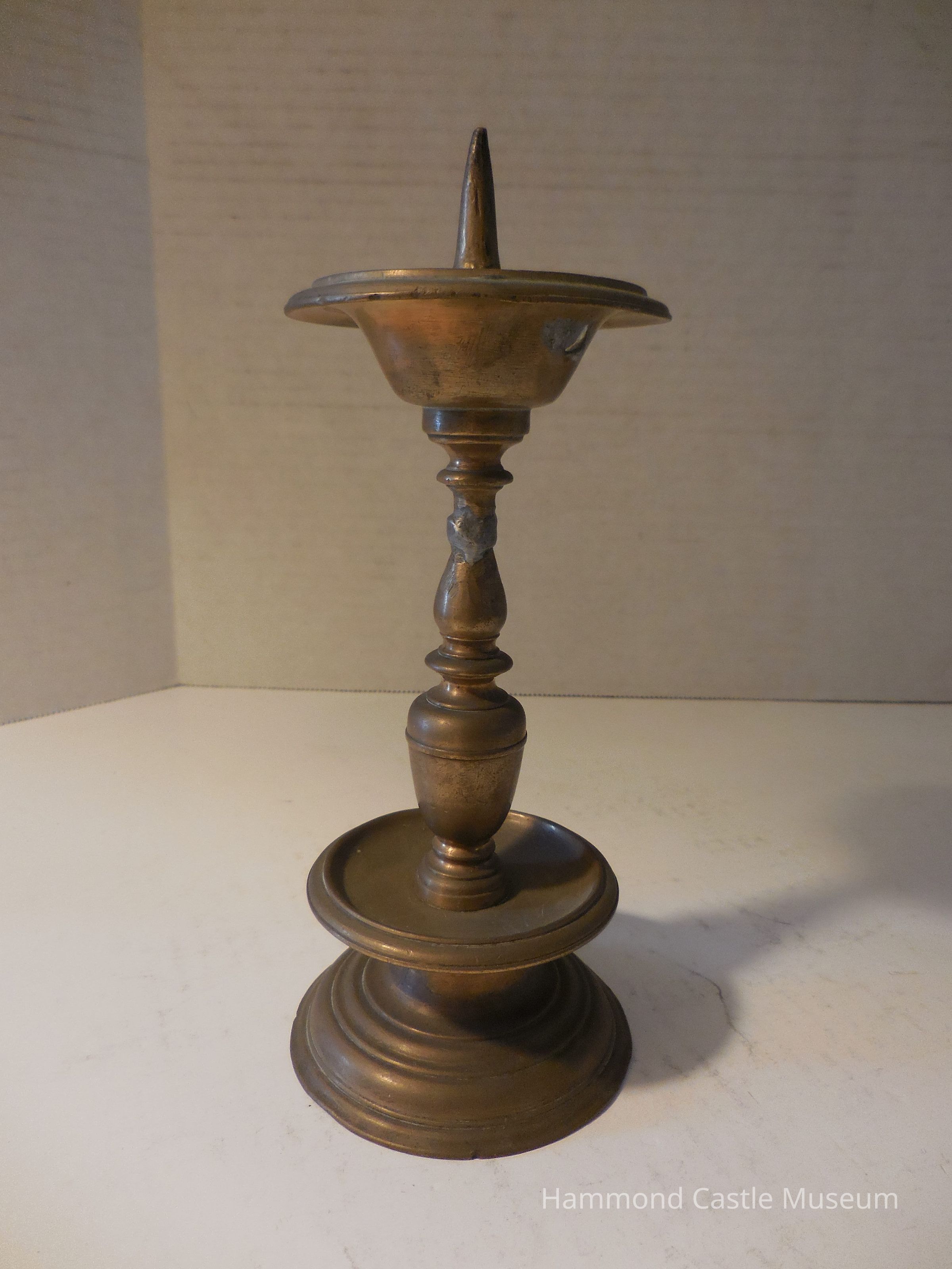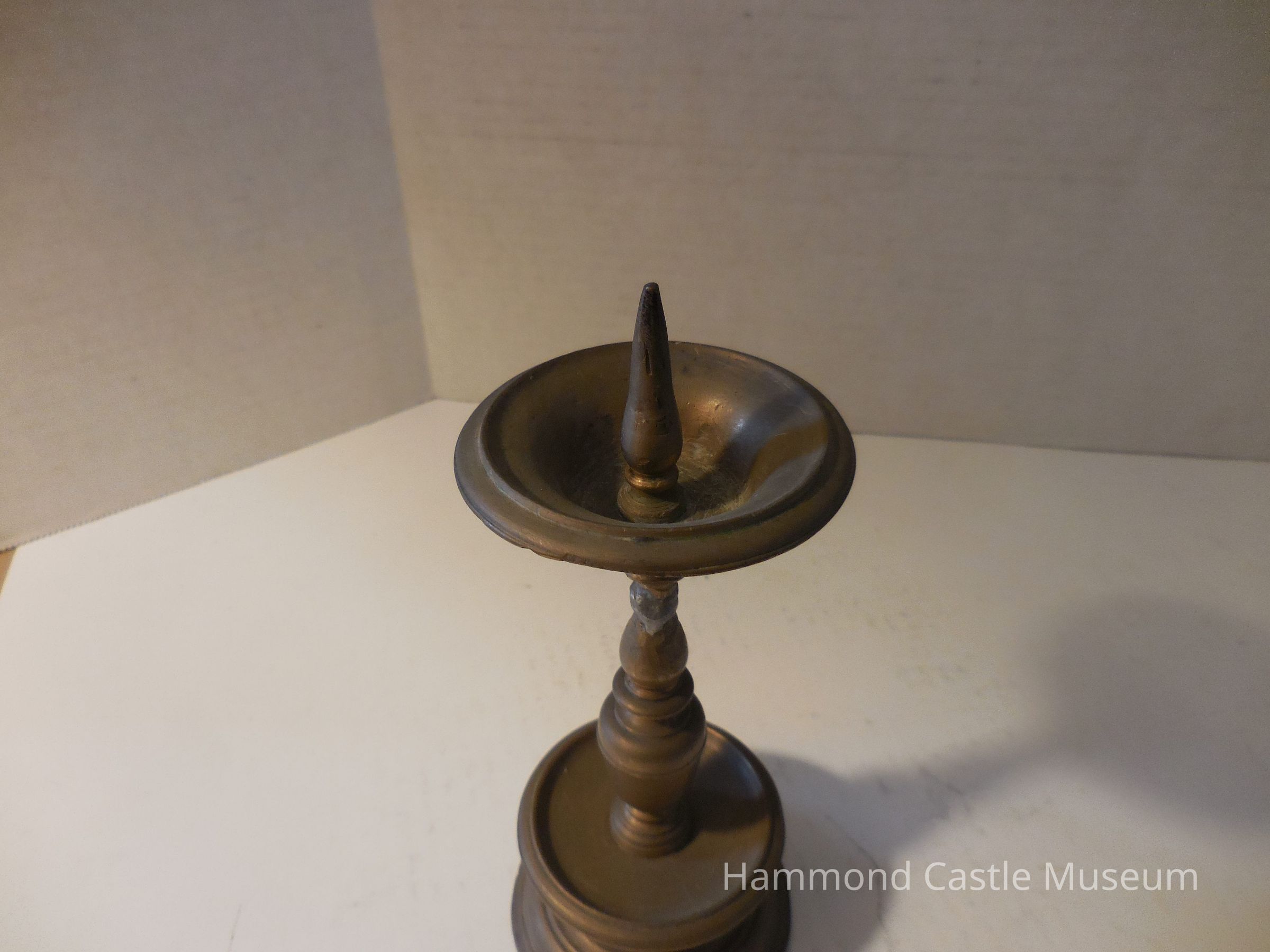 First of a set of 2 candlesticks; circular base, brass. Appears to have been repaired around stem of candlestick with another type of metal. Cup of candlestick is off center, unsure if this is due to repairs or original.