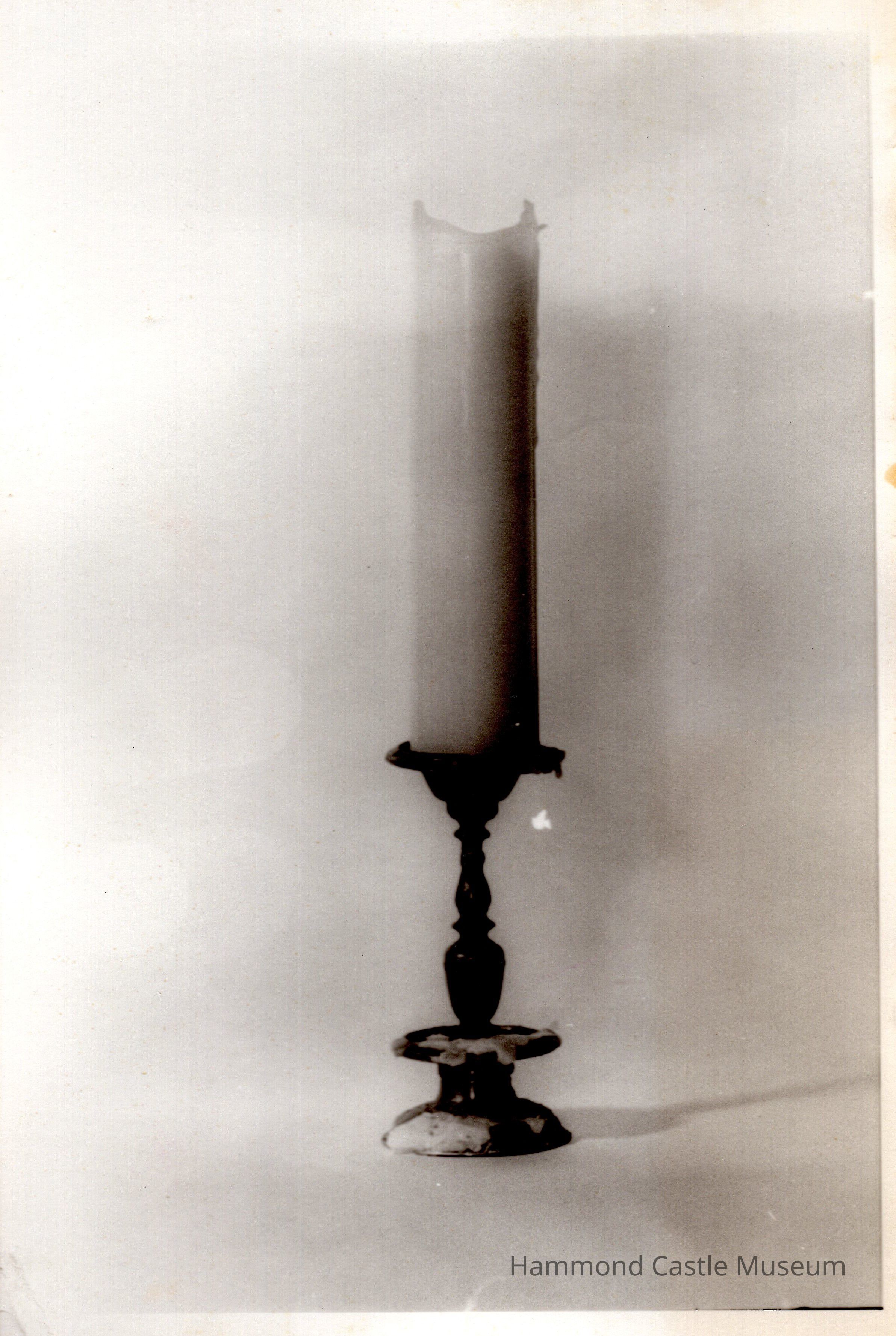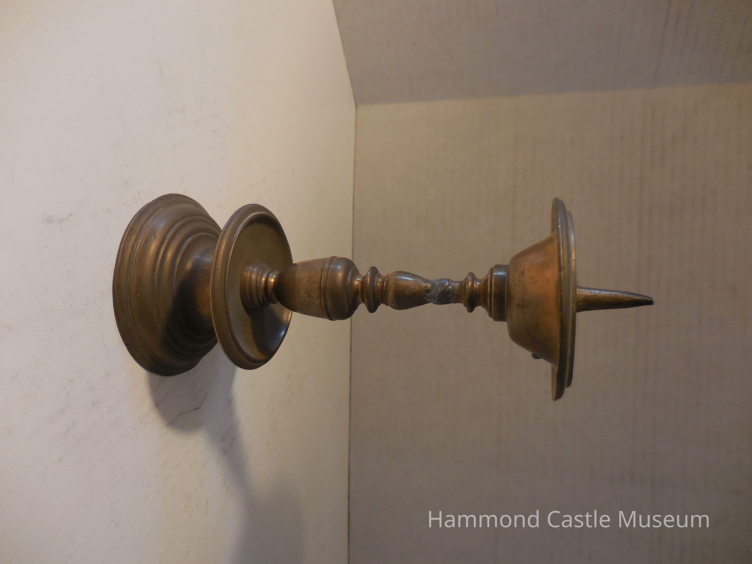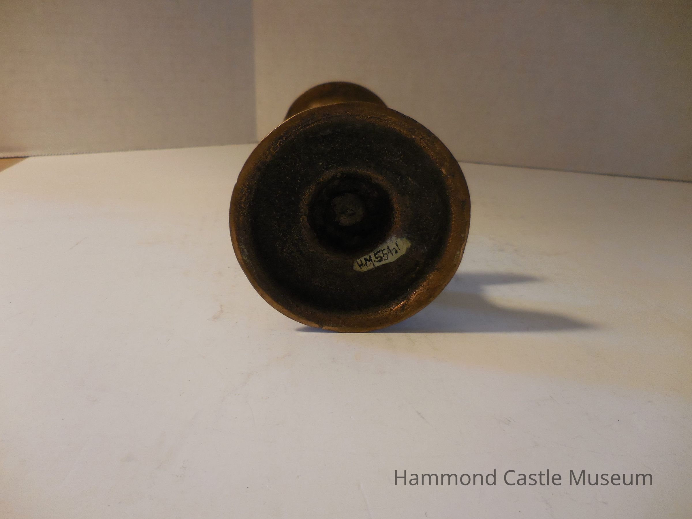 First of a set of 2 candlesticks; circular base, brass. Appears to have been repaired around stem of candlestick with another type of metal. Cup of candlestick is off center, unsure if this is due to repairs or original.