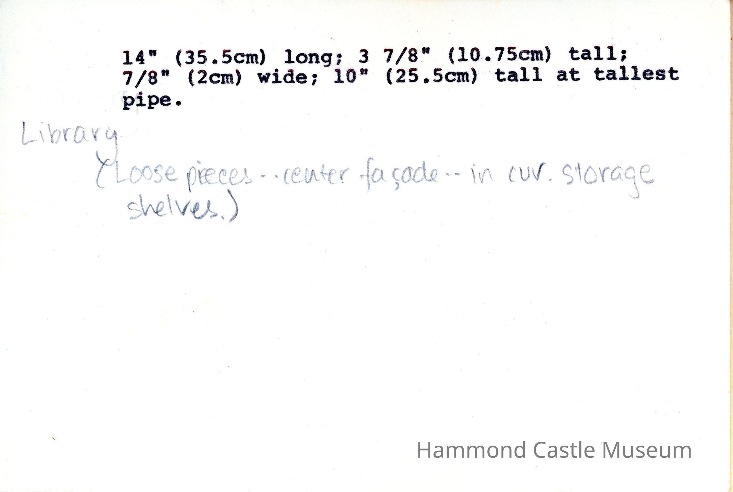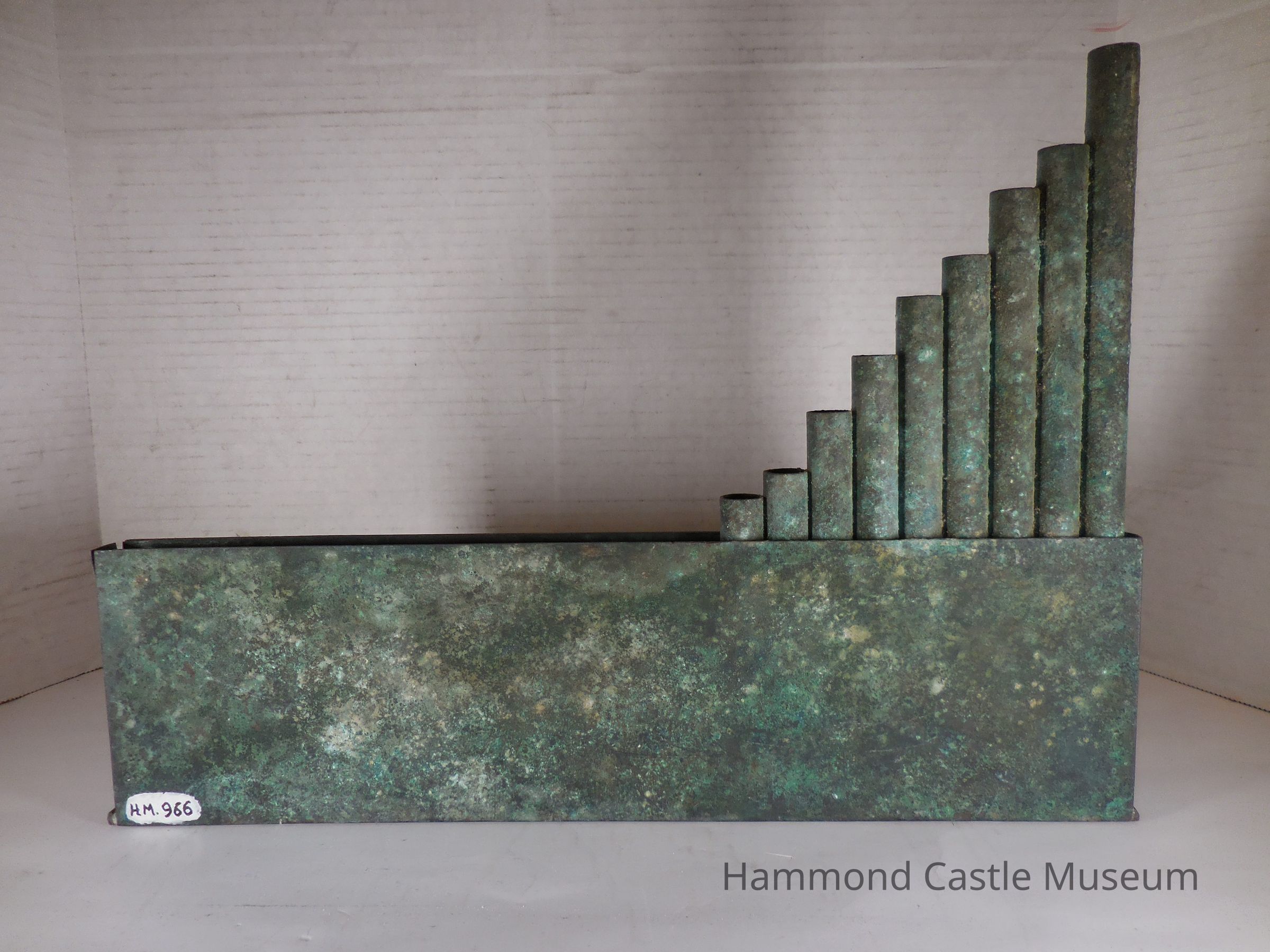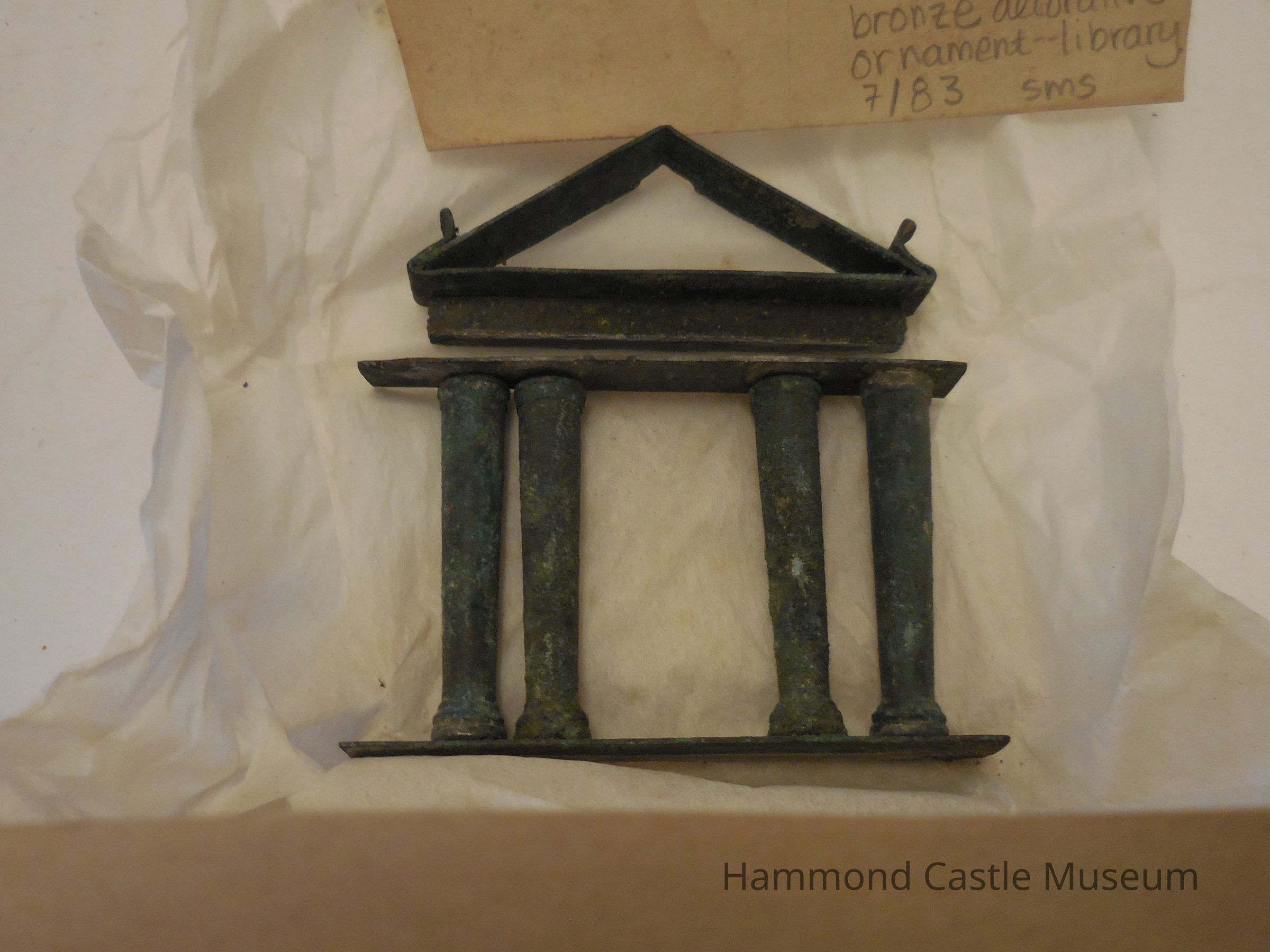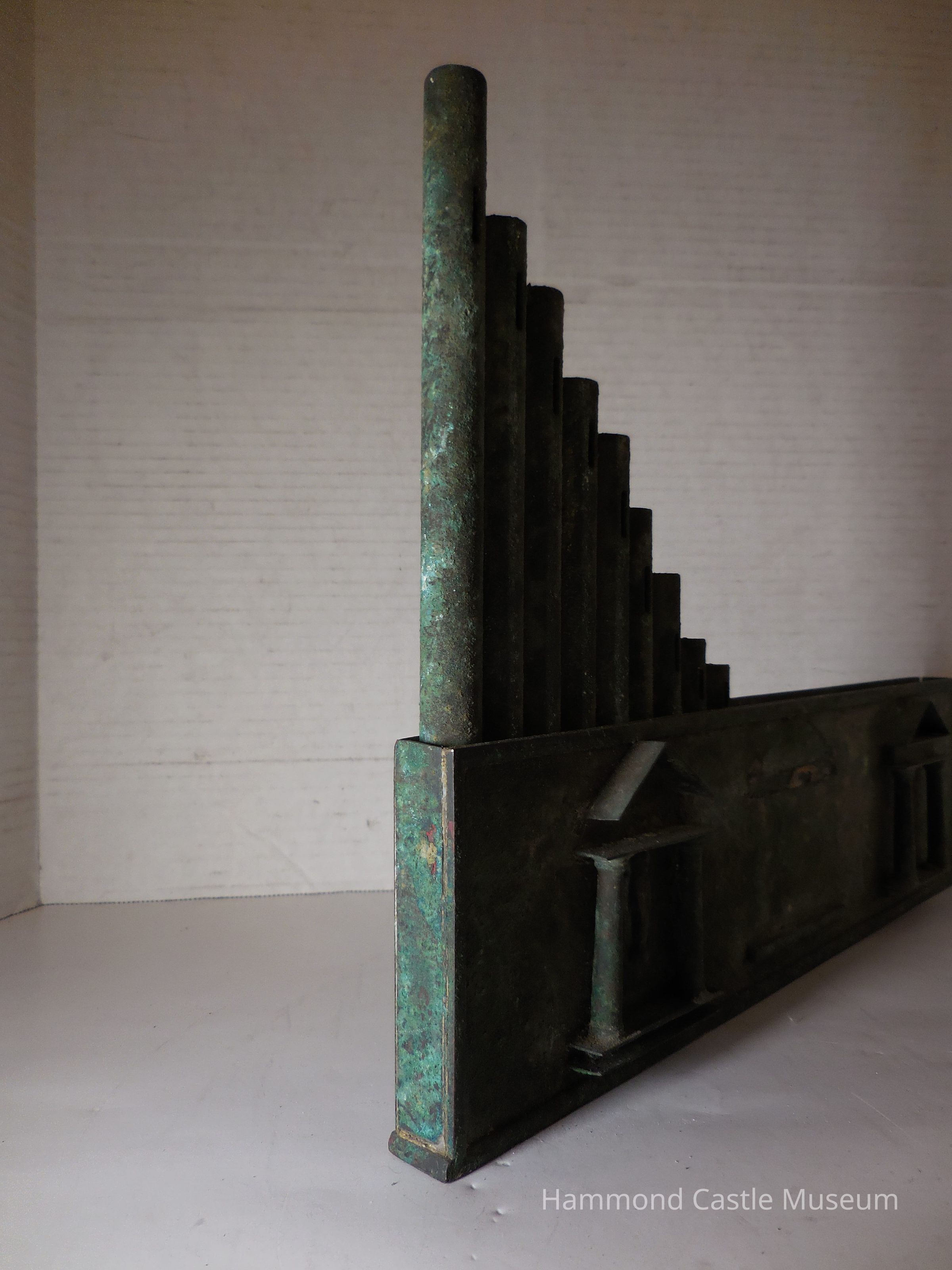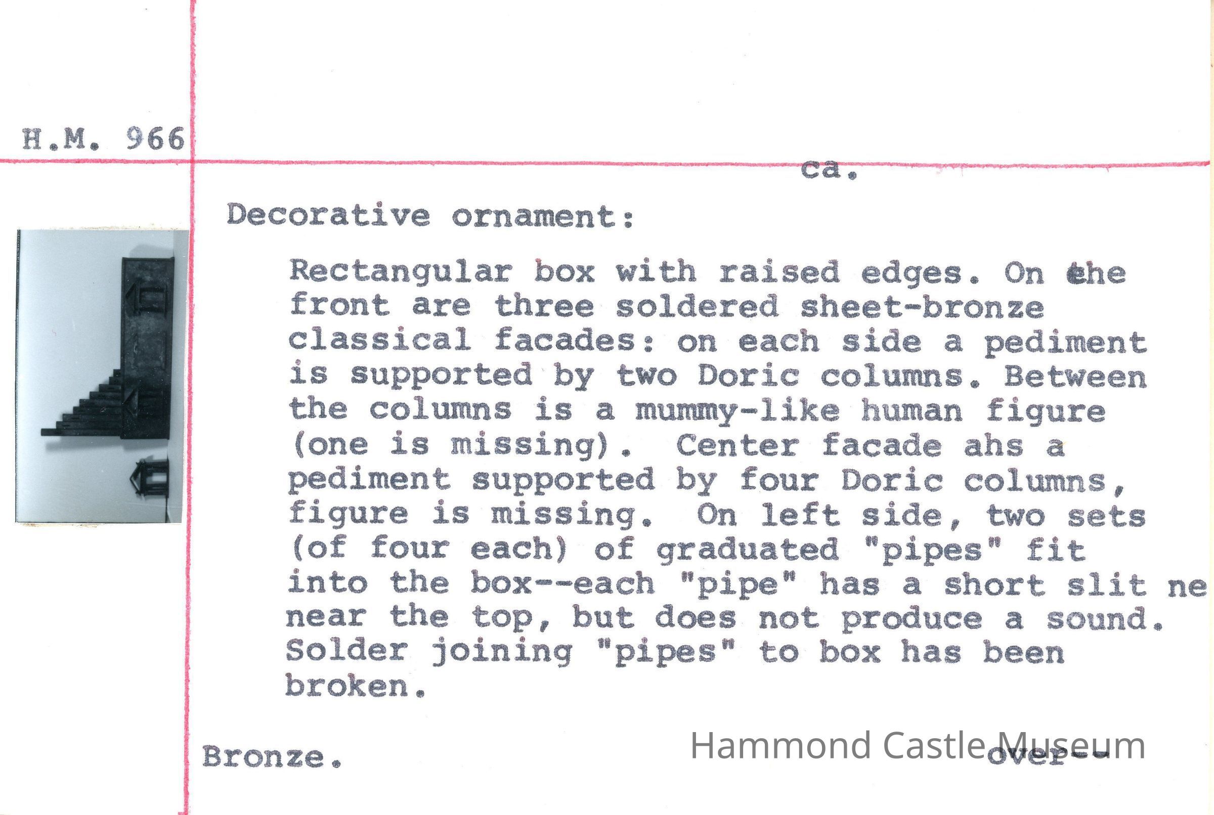 Decorative ornament: rectangular box with raised edges. On the front are three soldered sheet-bronze classical facades: on each side a pediment is supported by two Doric columns. Between the columns is a mummy-like human figure (one is missing). Center facade has a pediment supported by four Doric columns, figure is missing. On left side, two sets (of four each) of graduated "pipes" fit into the box--each "pipe" has a short slit near the top, but does not produce a sound. Solder joining "pipes" to box has been broken.