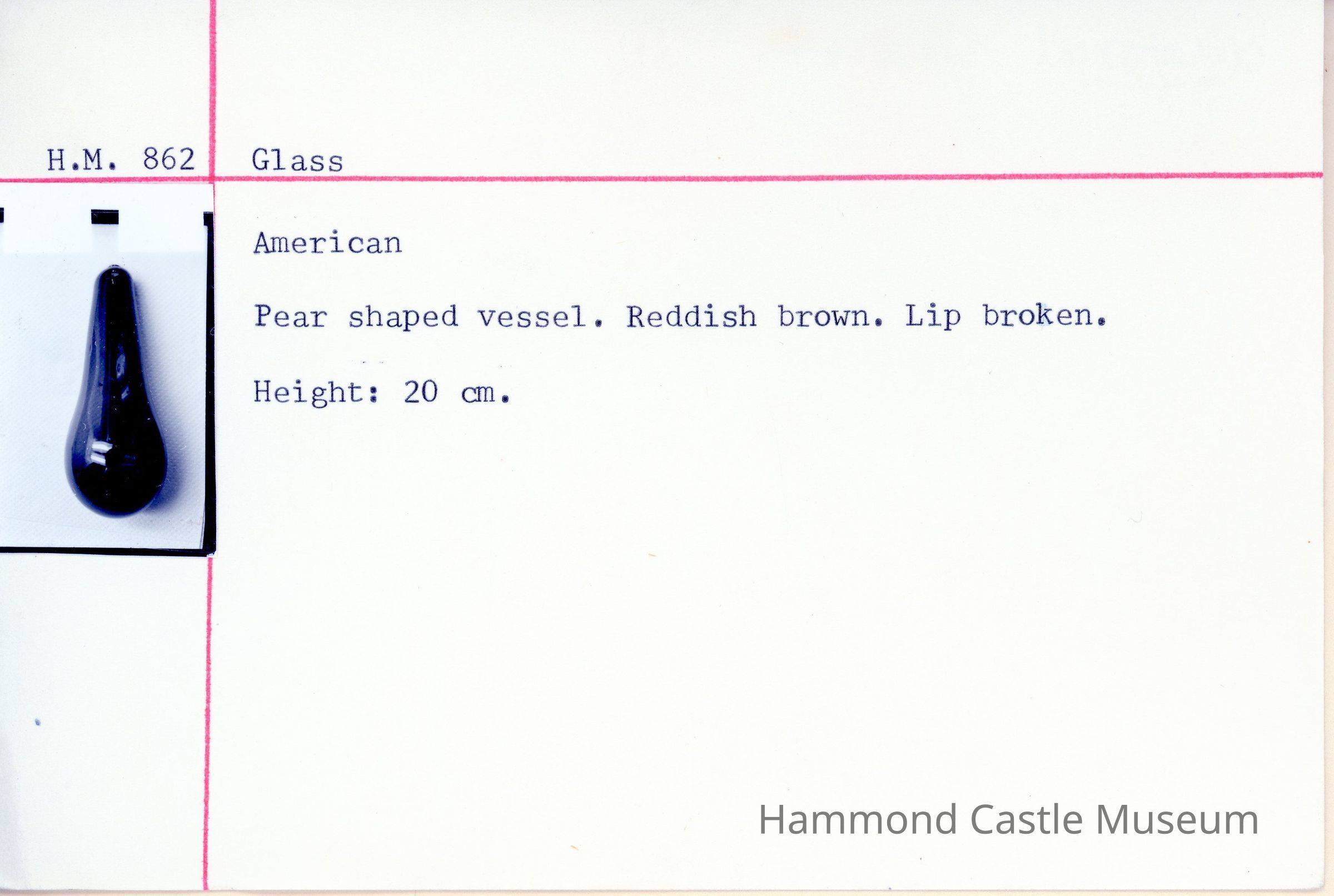 Pear-shaped glass bottle. Reddish brown. Lip broken.