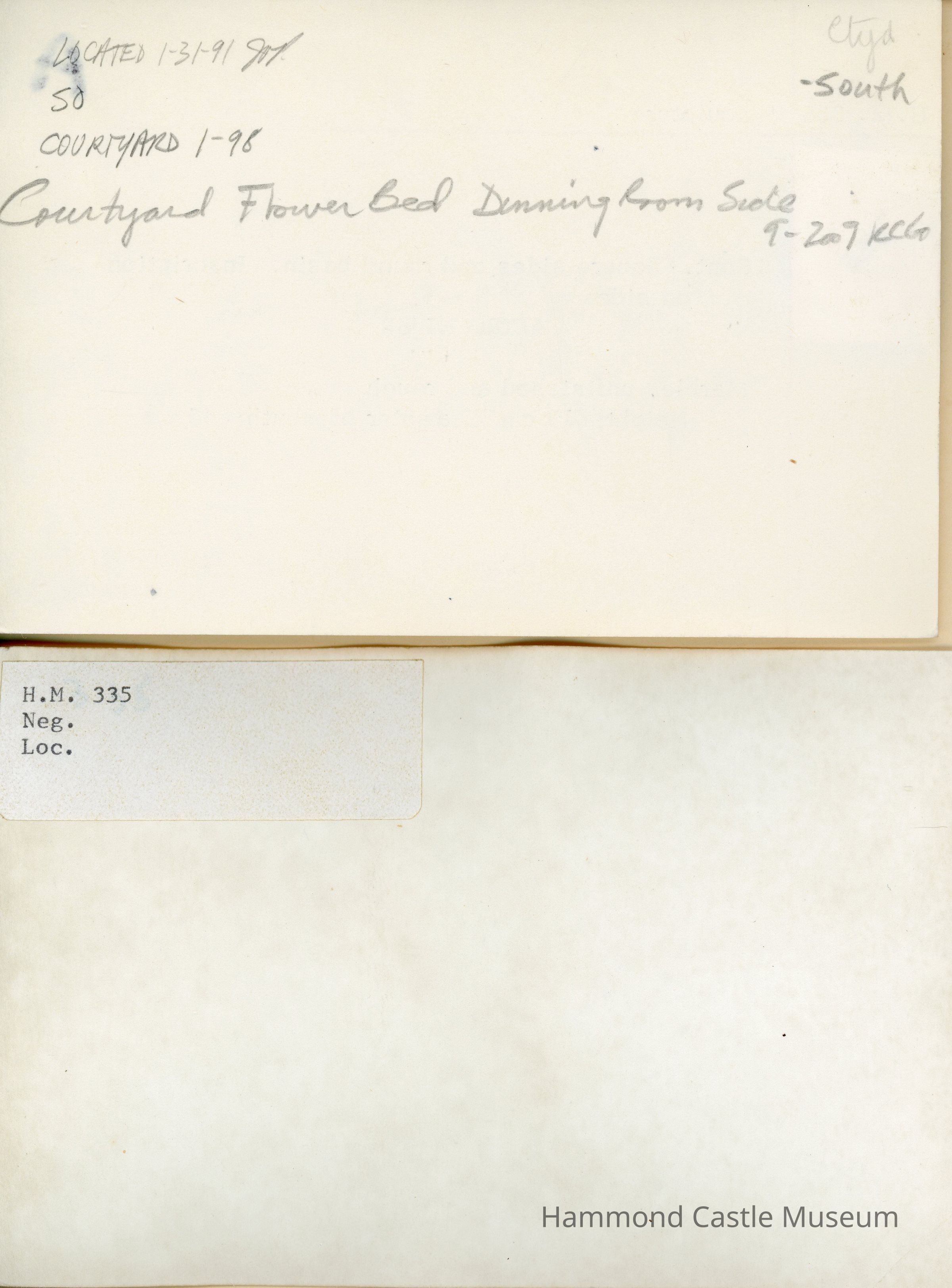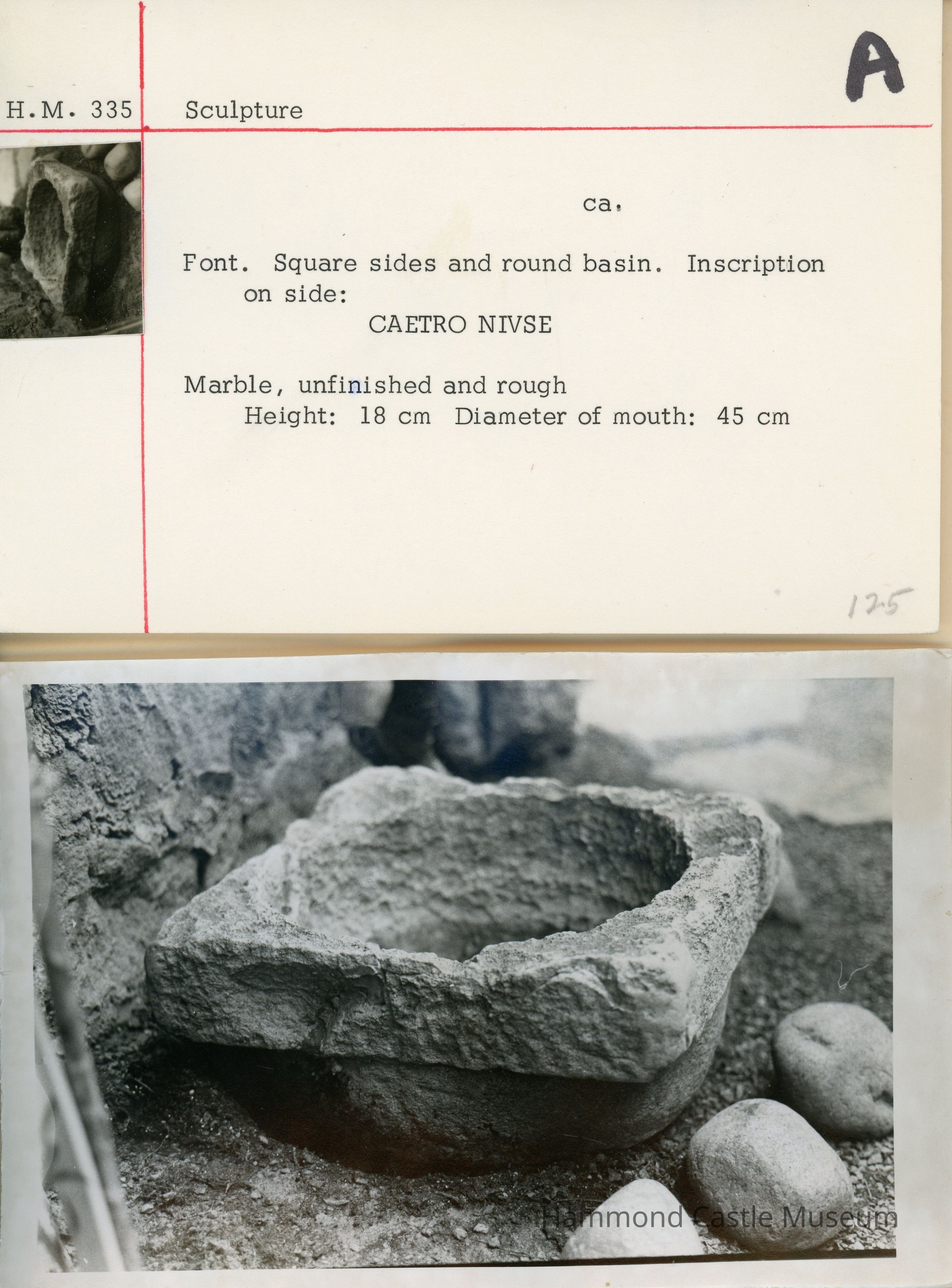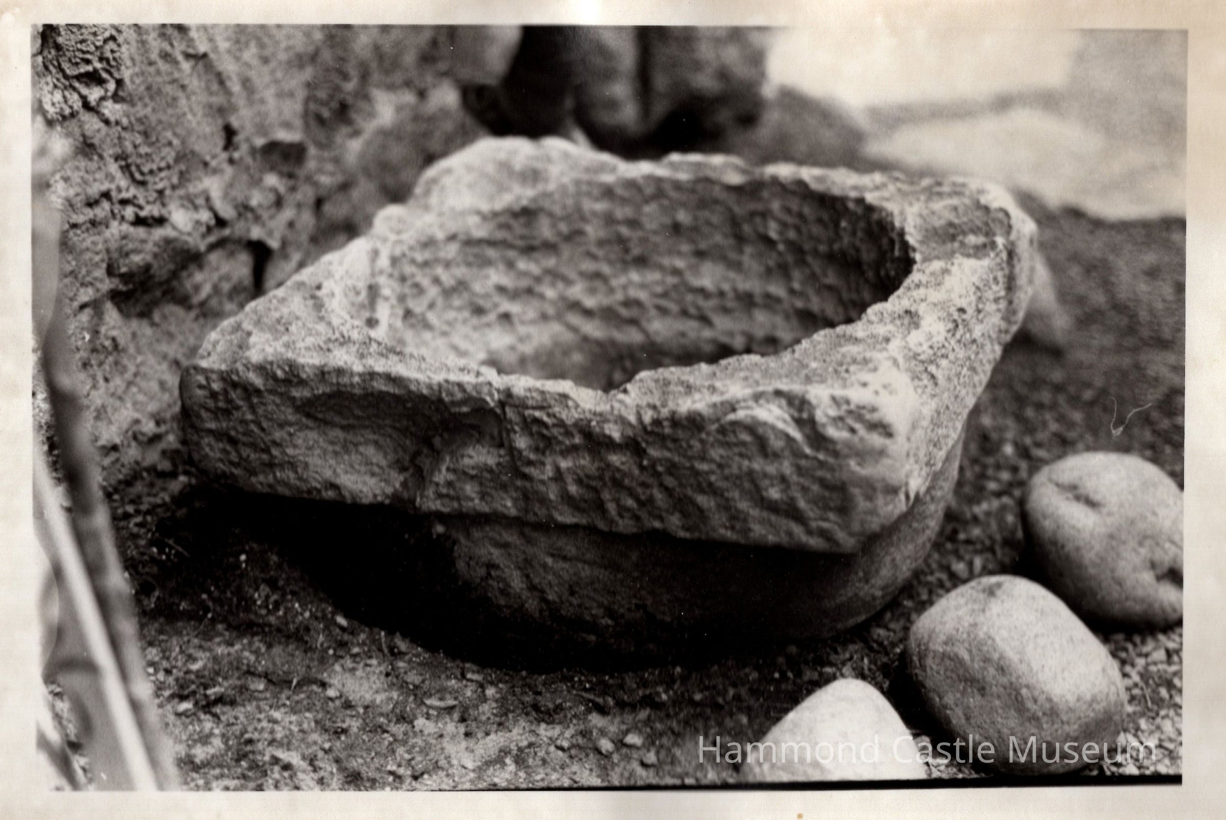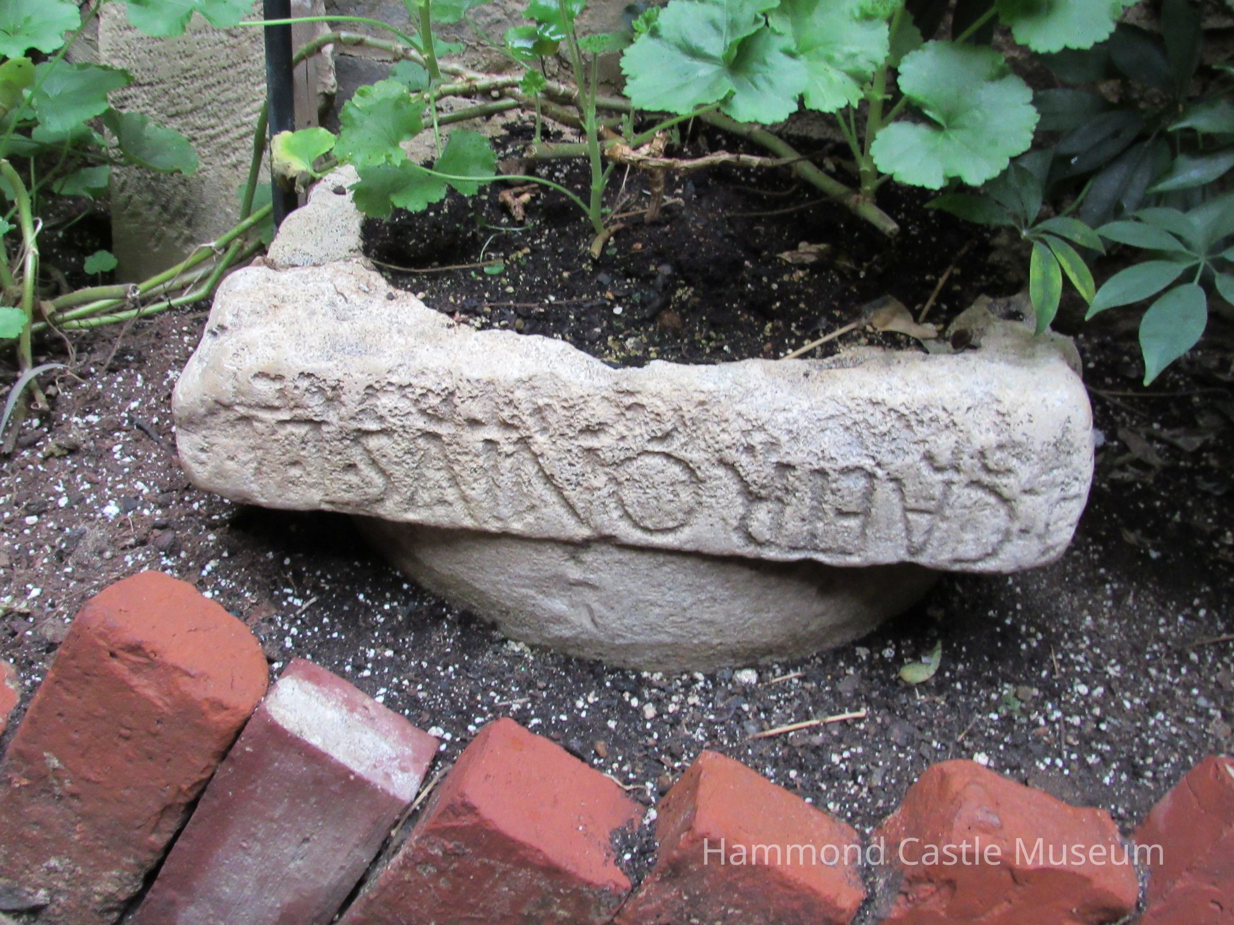 Basin or possible capital or base for column. Square sides and round basin. Inscription on side is upside down in current usage which suggests different original purpose - possibly a capital with building name.