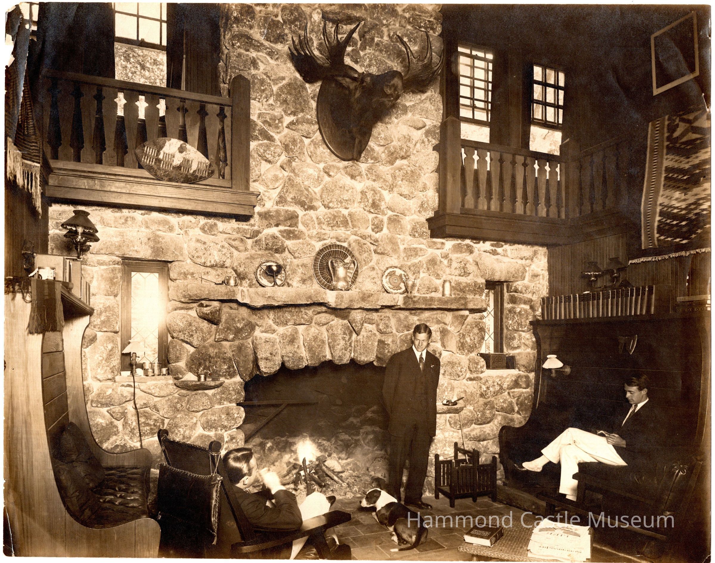 "1908 view of the Bungalow Living Room with JHHJr (seated. right) and 2 unknown men (left & standing).