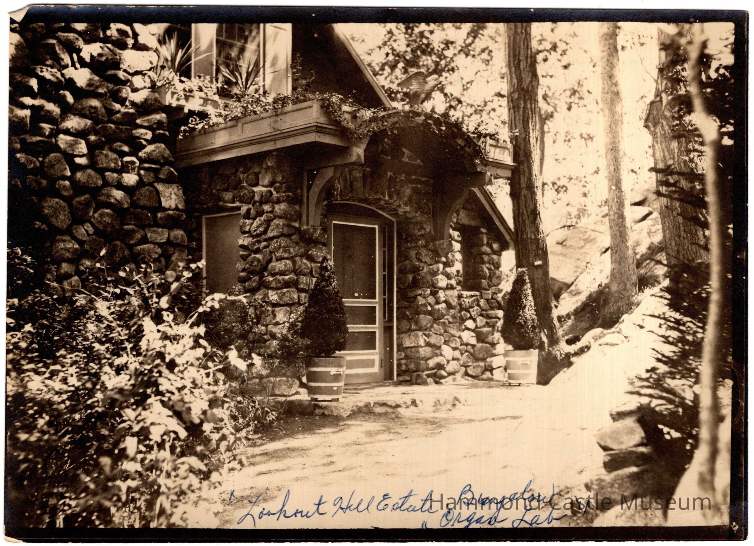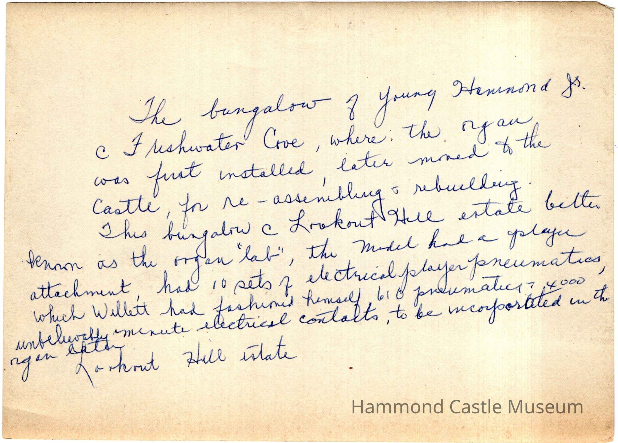 "The bungalow of young Hammond Jr. @ Freshwater Cove, where the organ was first installed, later moved to the castle, for re-assembling & rebuilding. This bungalow @ Lookout Hill estate better known as the organ "lab", the model had a player attachment, had 10 sets of electrical player pneumatics, which WIllett had fashioned himself, 610 pneumatics, 4000 unbelievably minute electrical contacts, to be incorporated with the organ later. Lookout Hill estate. "