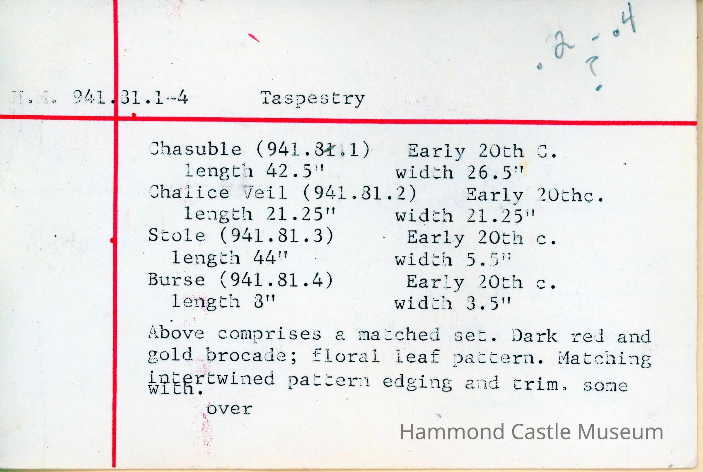 Part of a matched ecclesiastical set. Dark red and gold brocade; floral leaf pattern. Matching intertwined pattern edging and trim. some with red and gold fringe and raised embroidery. Dark red linings. Loaned by Rev. Ronald Gagne M.S. LaSalette Shrine Ipswich, MA 01938 June, 1981