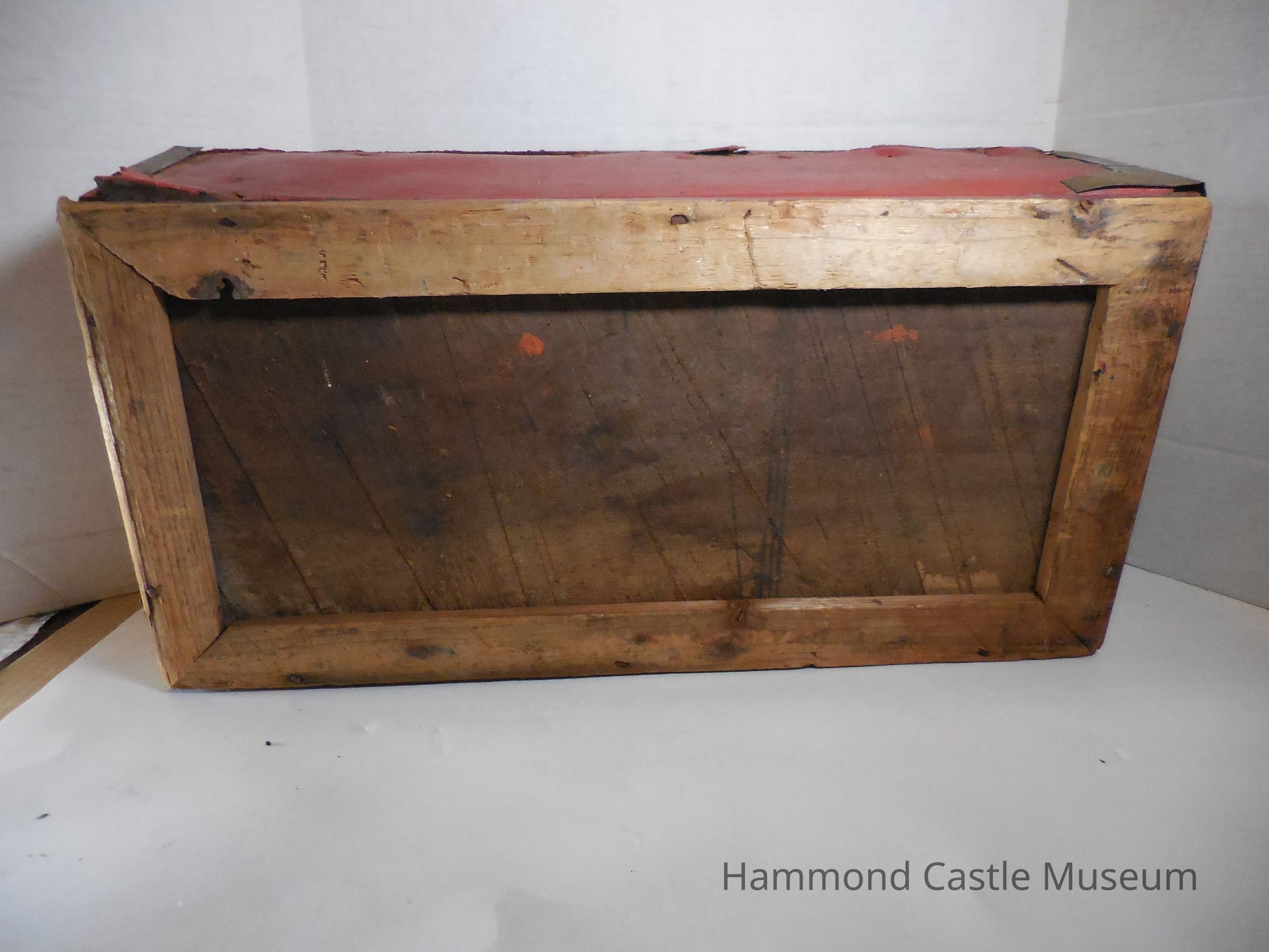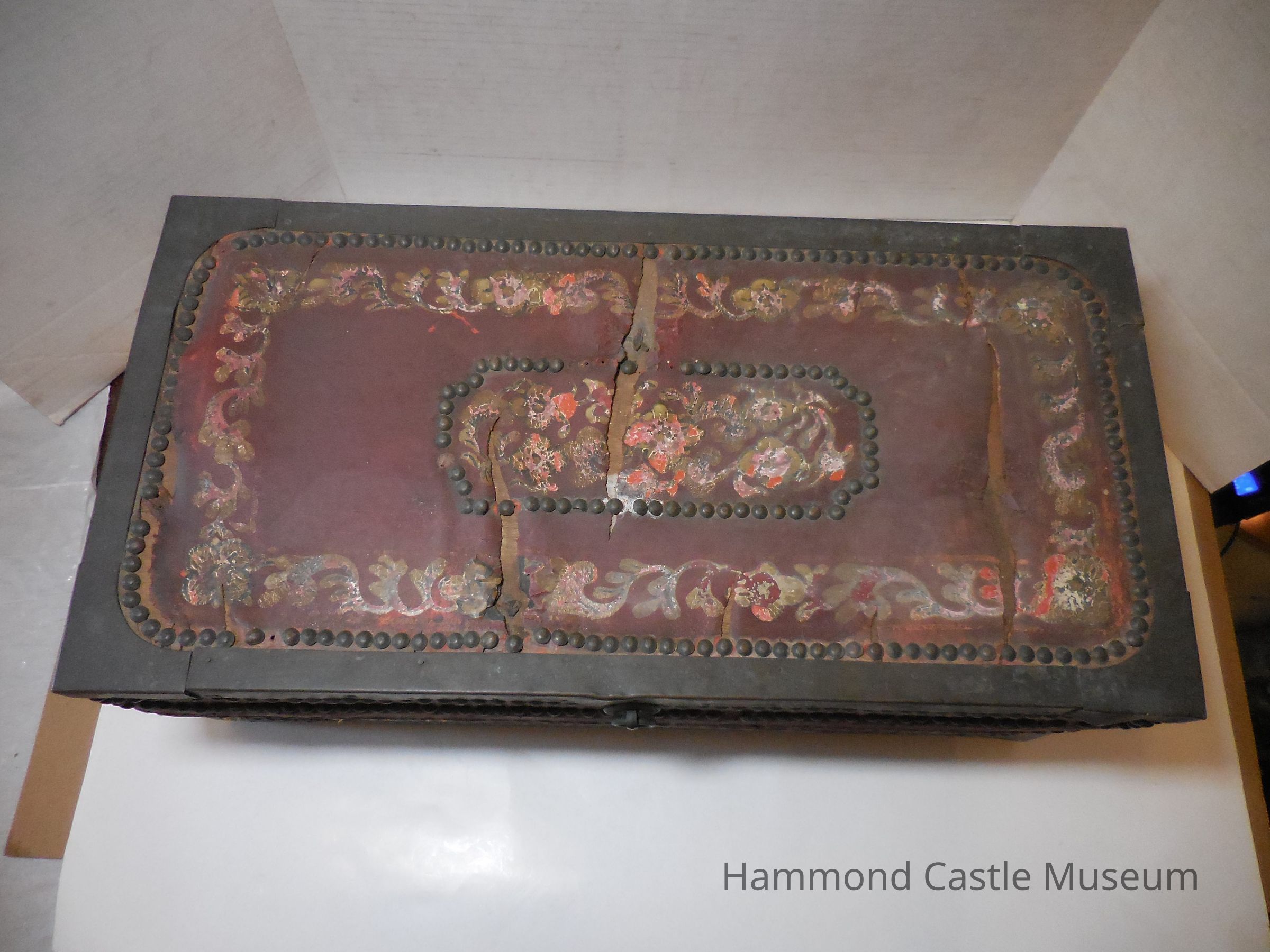 Leather document chest, pink and deep red floral design with black border. Studded with nails as trim and on cover. Uncovered wood inside. Corner bracket damaged, leather buckling on top. Two side handles.