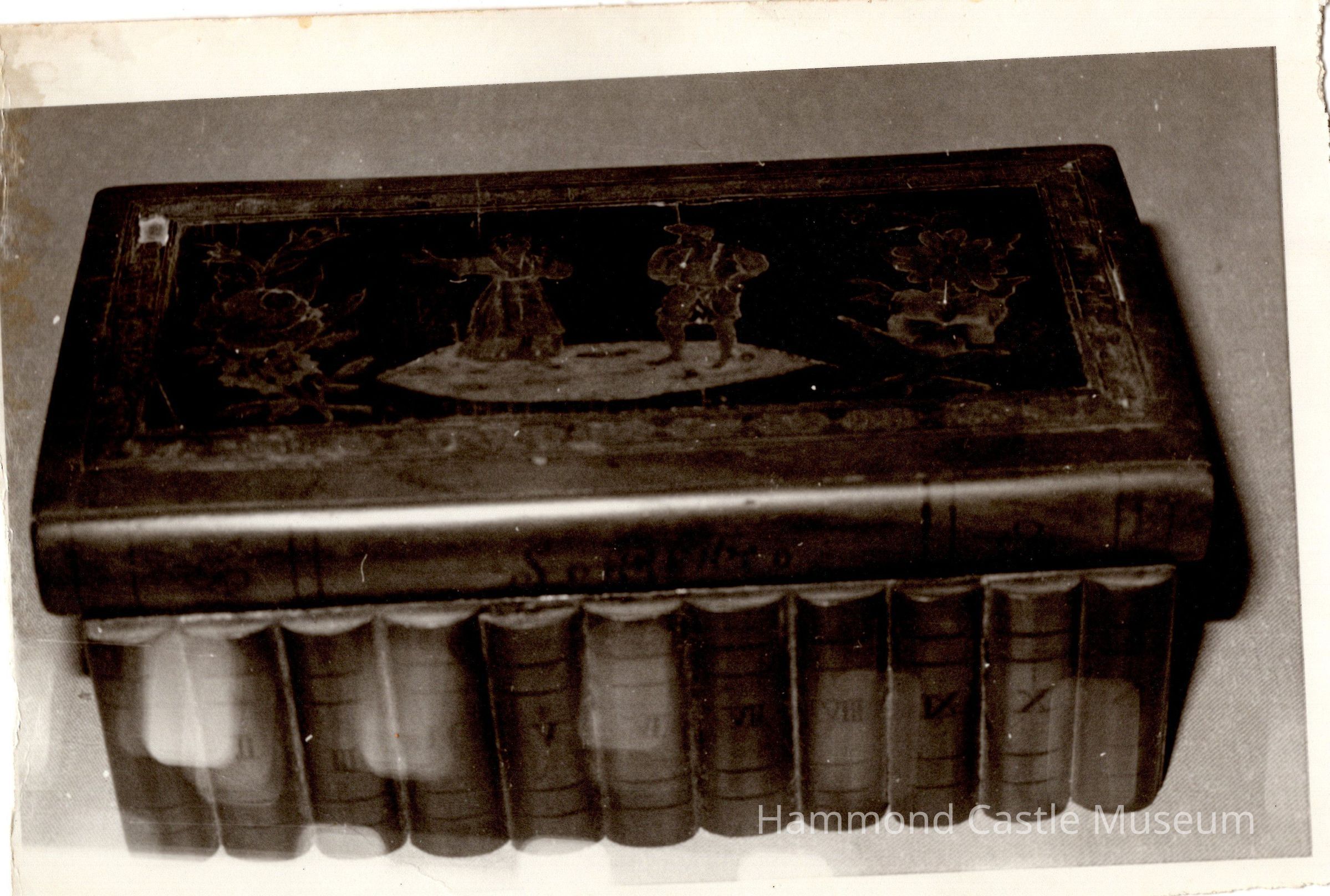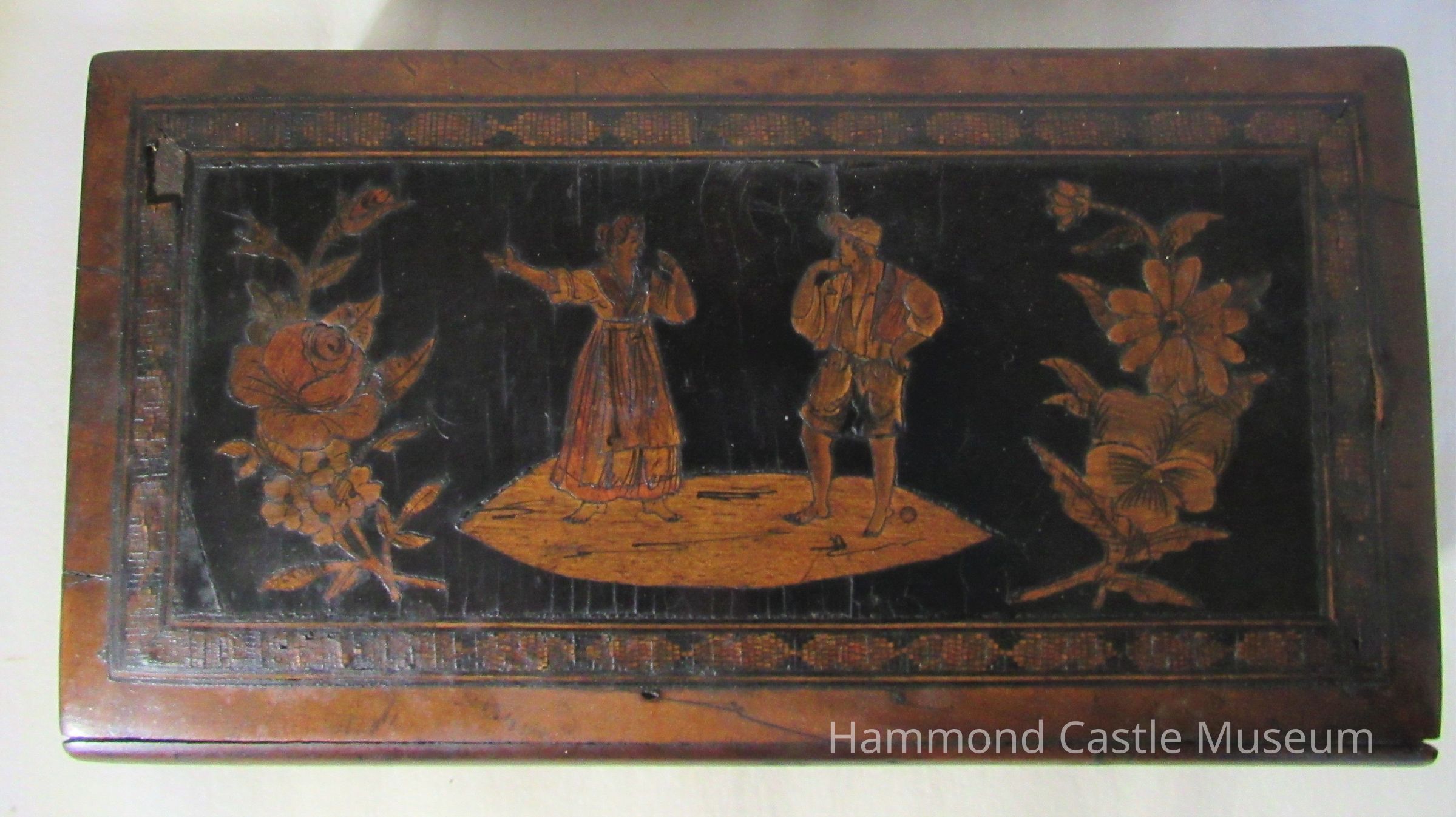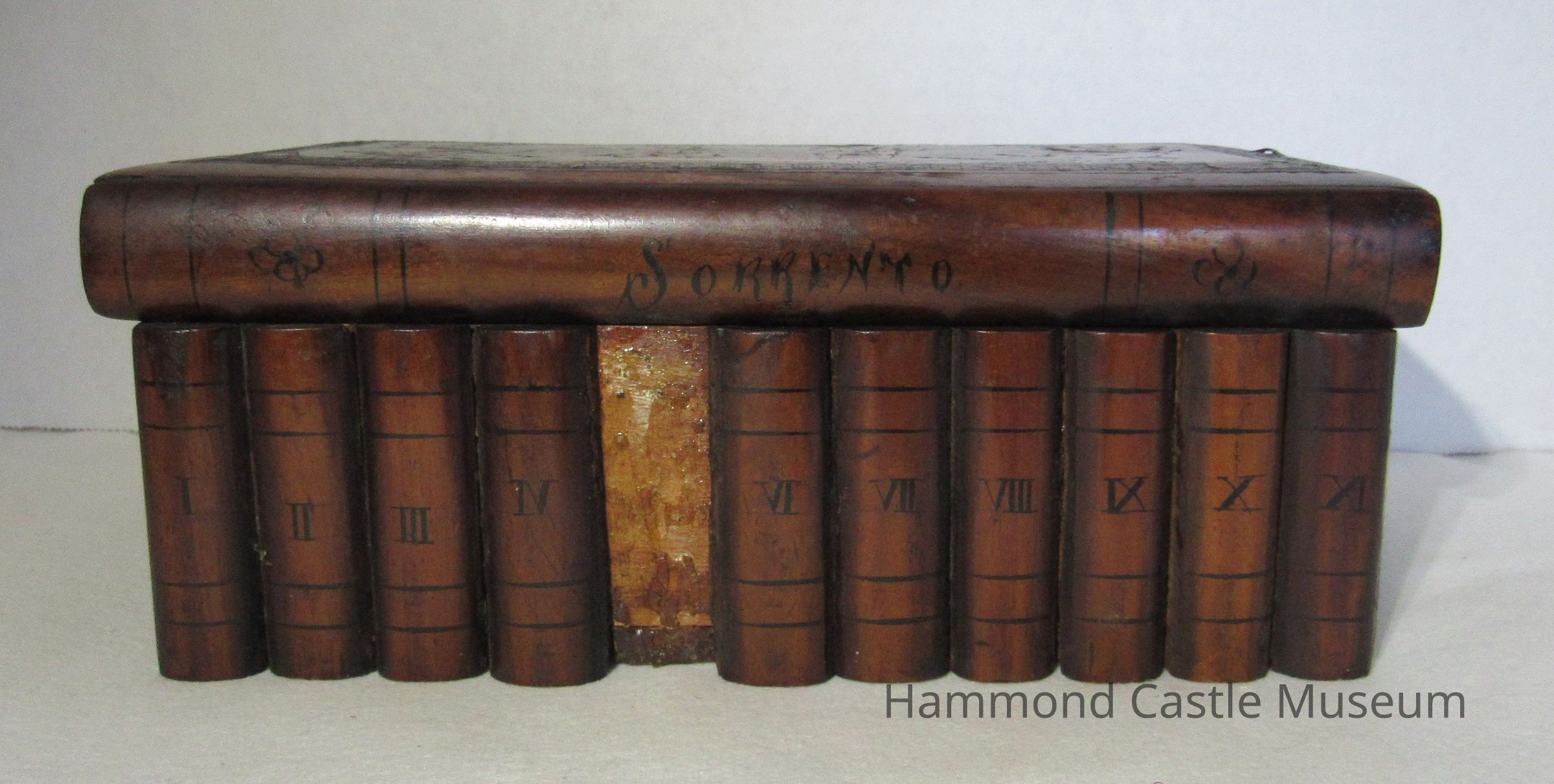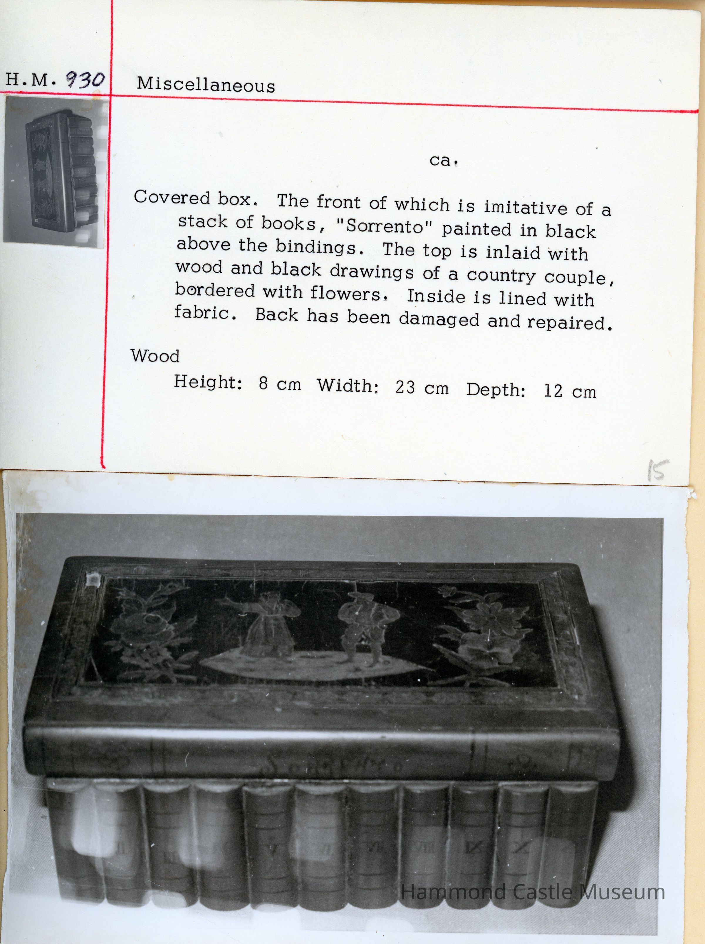 Covered box. The front of which is imitative of a stack of books, "Sorrento" painted in black above the bindings. The top is inlaid with wood and black drawings of a country coupe, bordered with flowers. Inside is lined with fabric. Back has been damaged and repaired.Collection