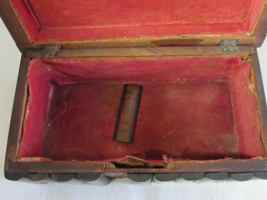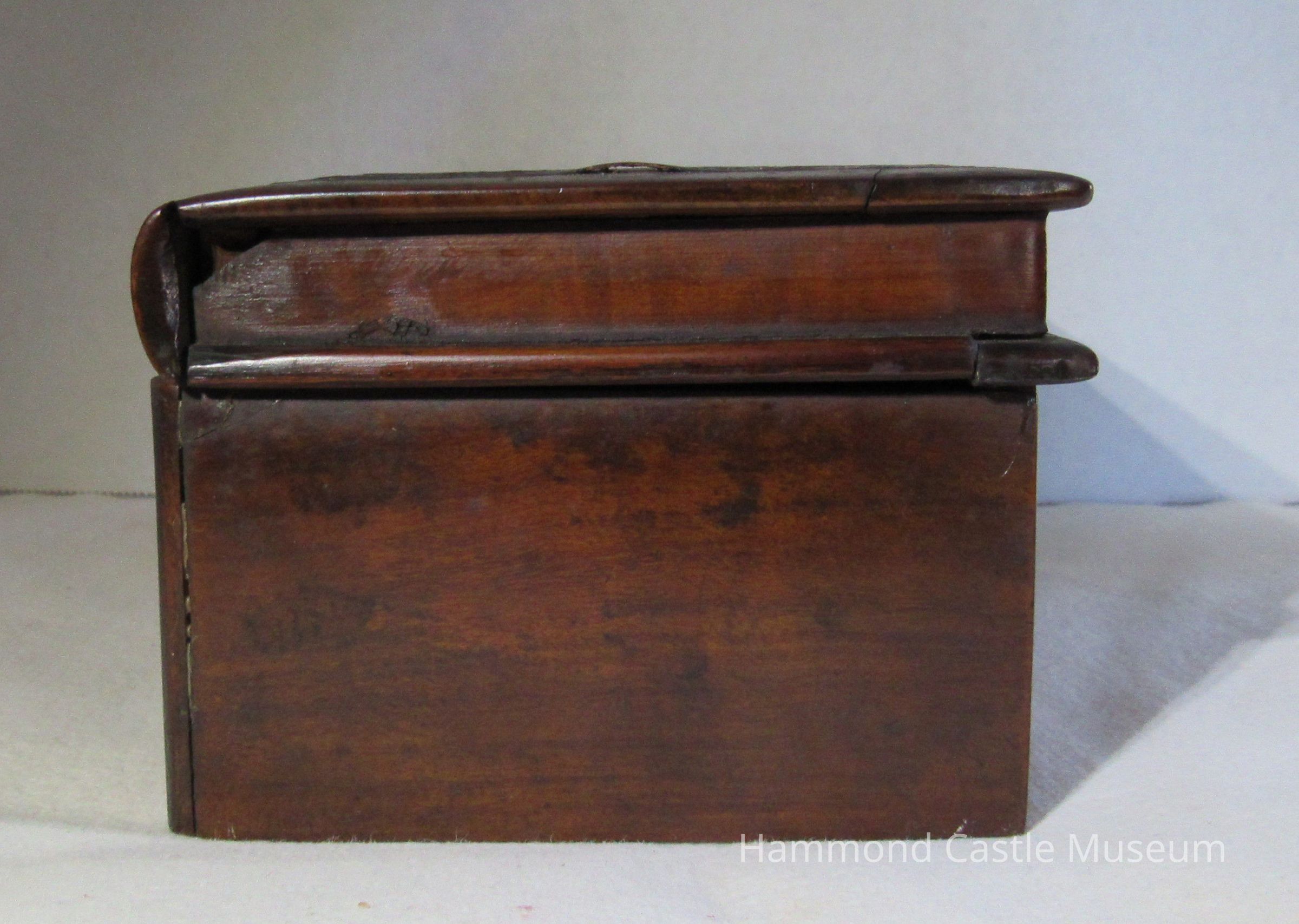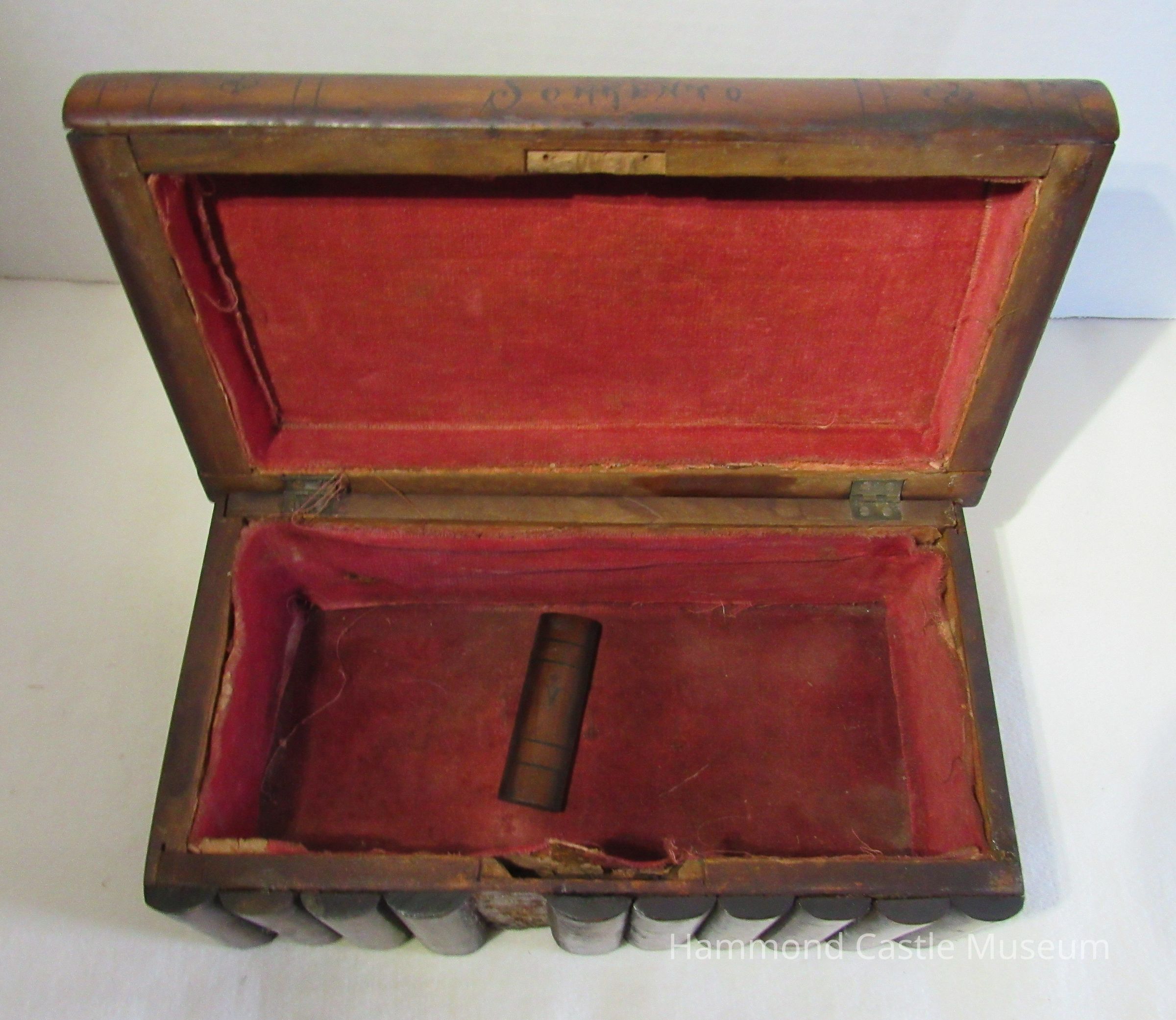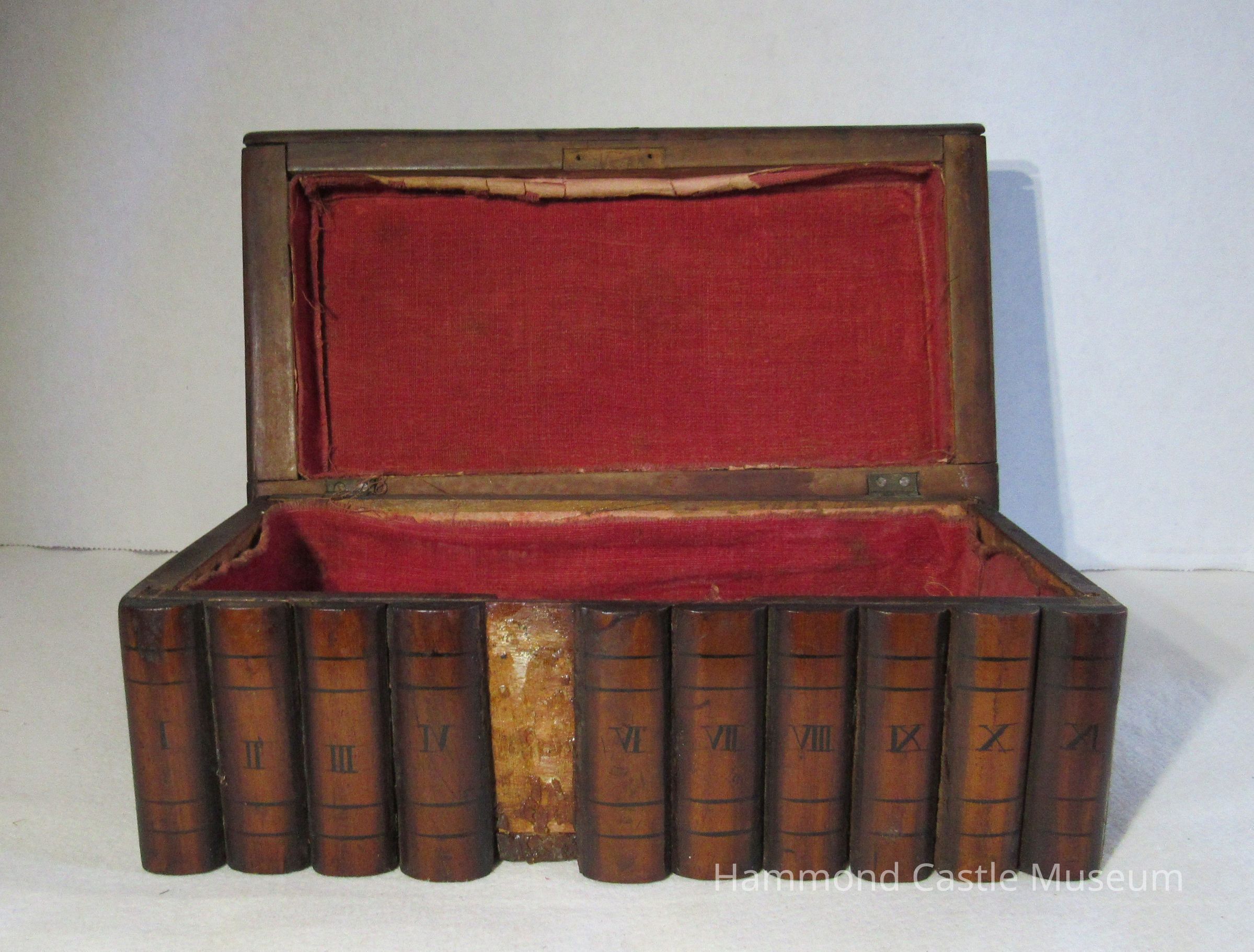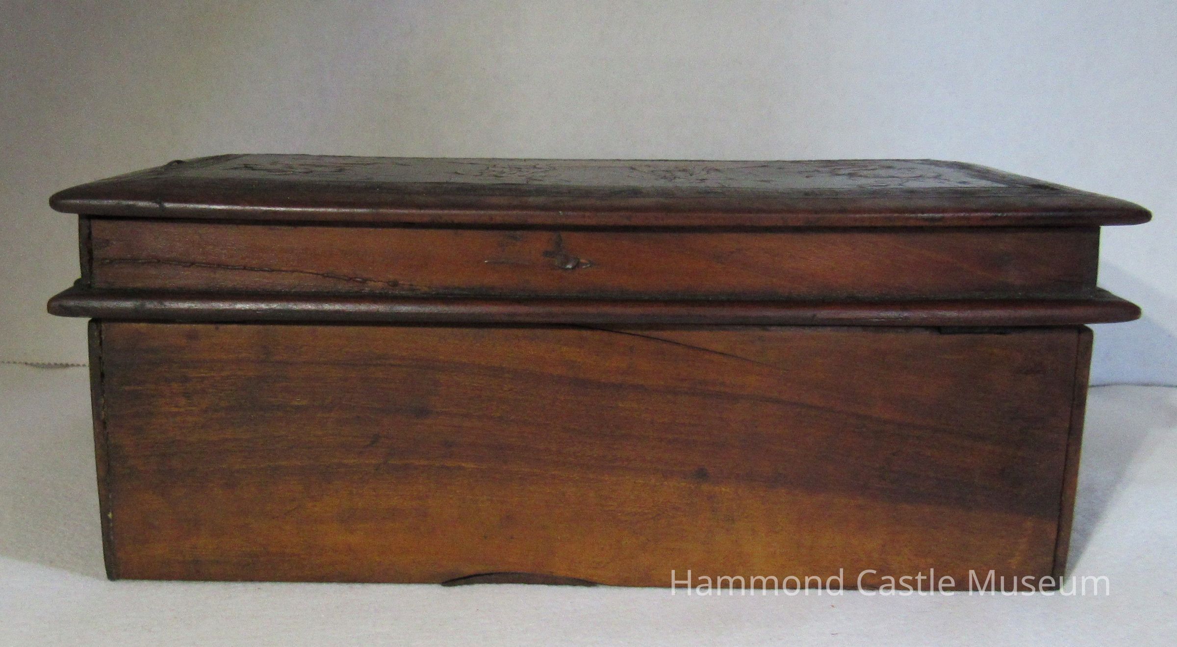 Covered box. The front of which is imitative of a stack of books, "Sorrento" painted in black above the bindings. The top is inlaid with wood and black drawings of a country coupe, bordered with flowers. Inside is lined with fabric. Back has been damaged and repaired.Collection