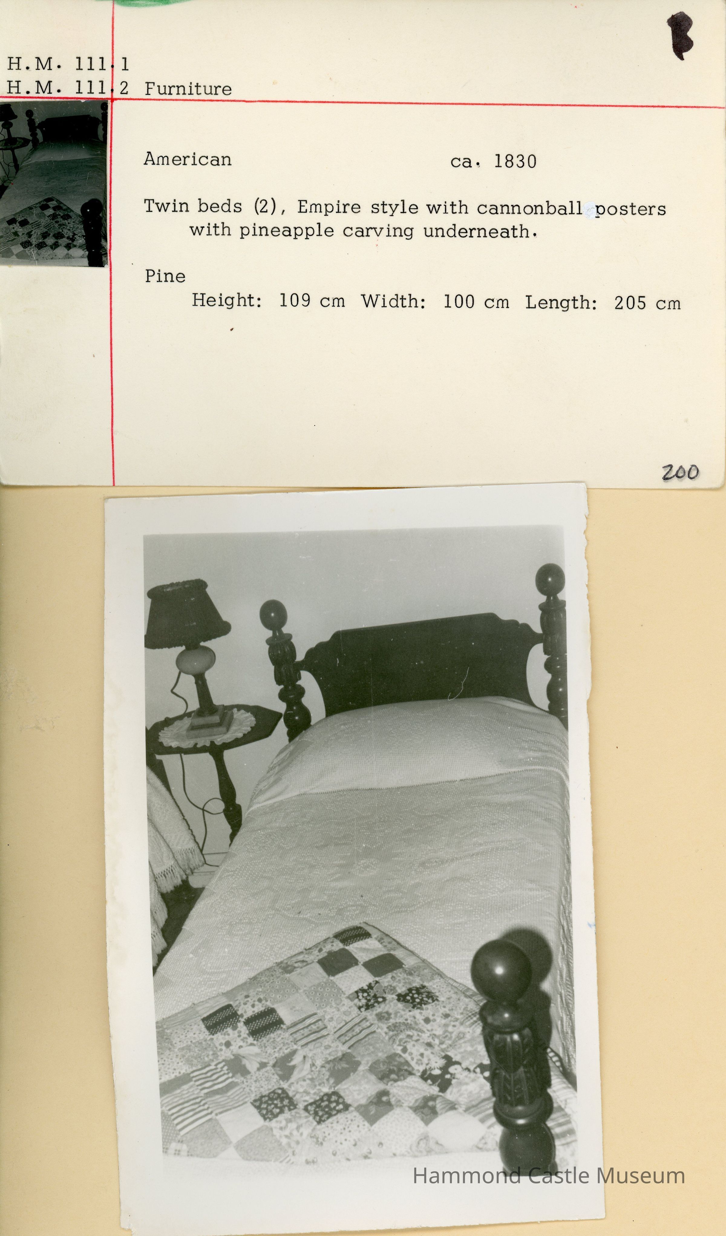 Set of 2 twin maple 4 post beds with headboards and footboards. Empire style with cannonball posters with pineapple carving underneath. 1965 Probate Inventory - Lower Guestroom
