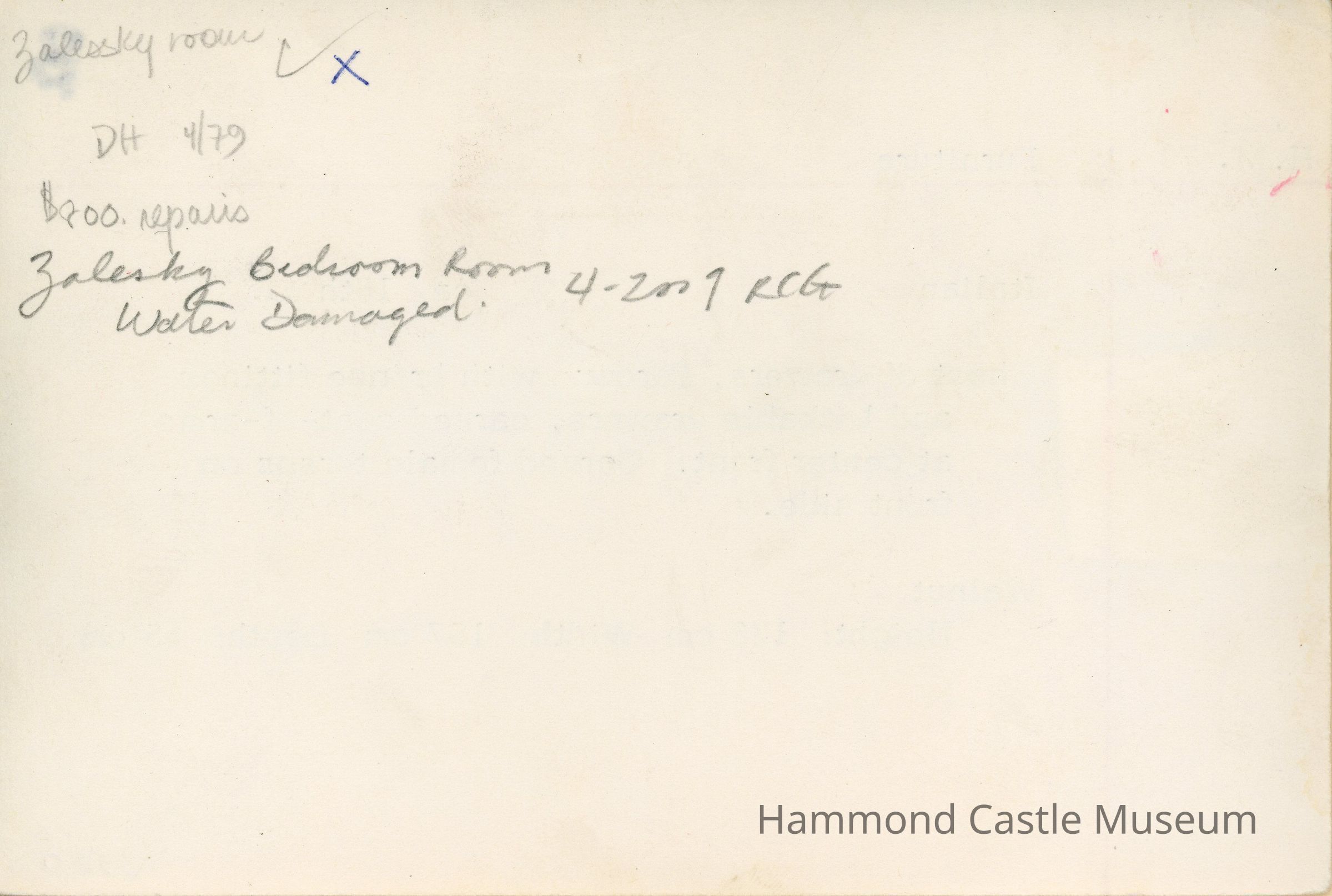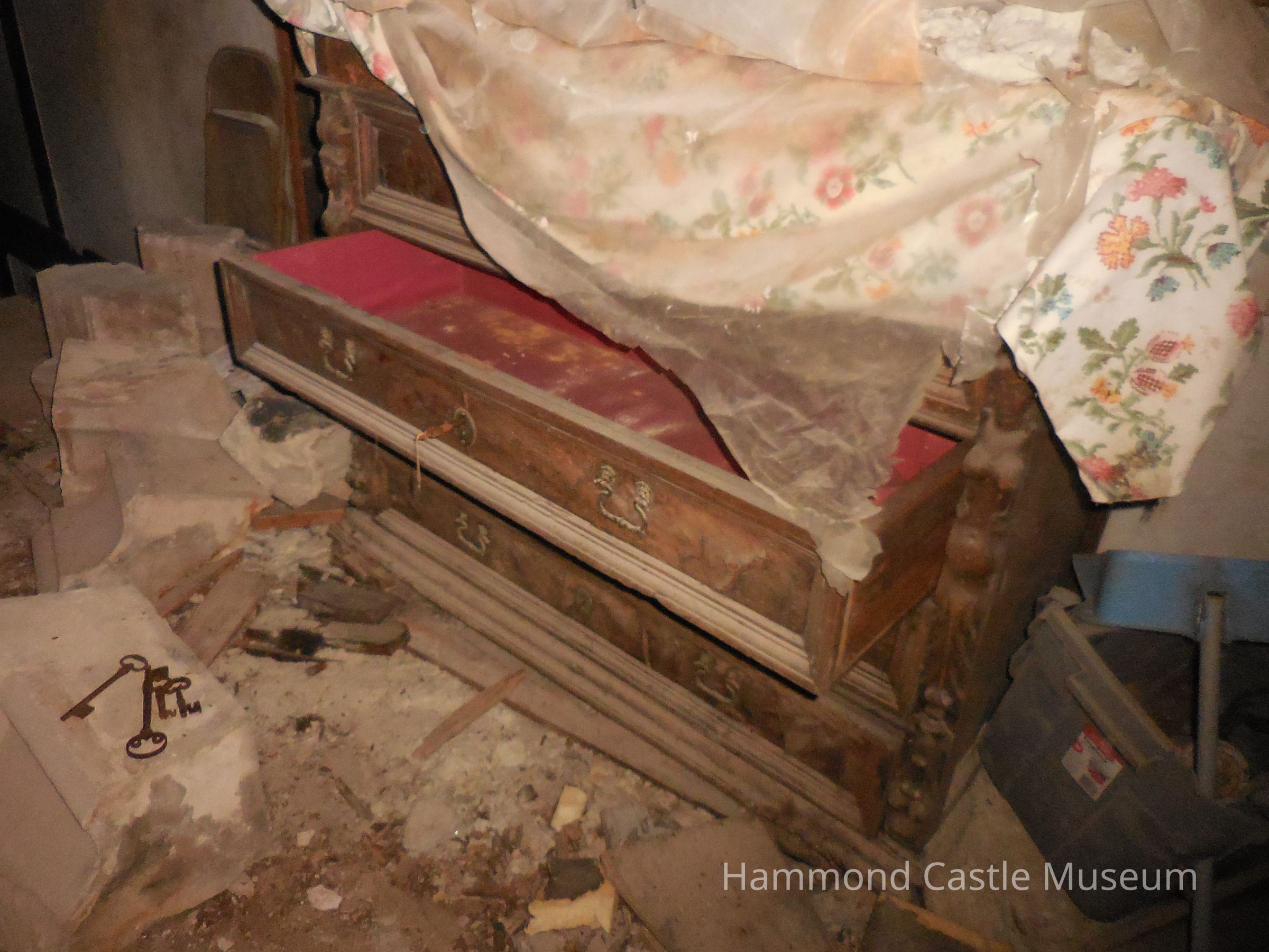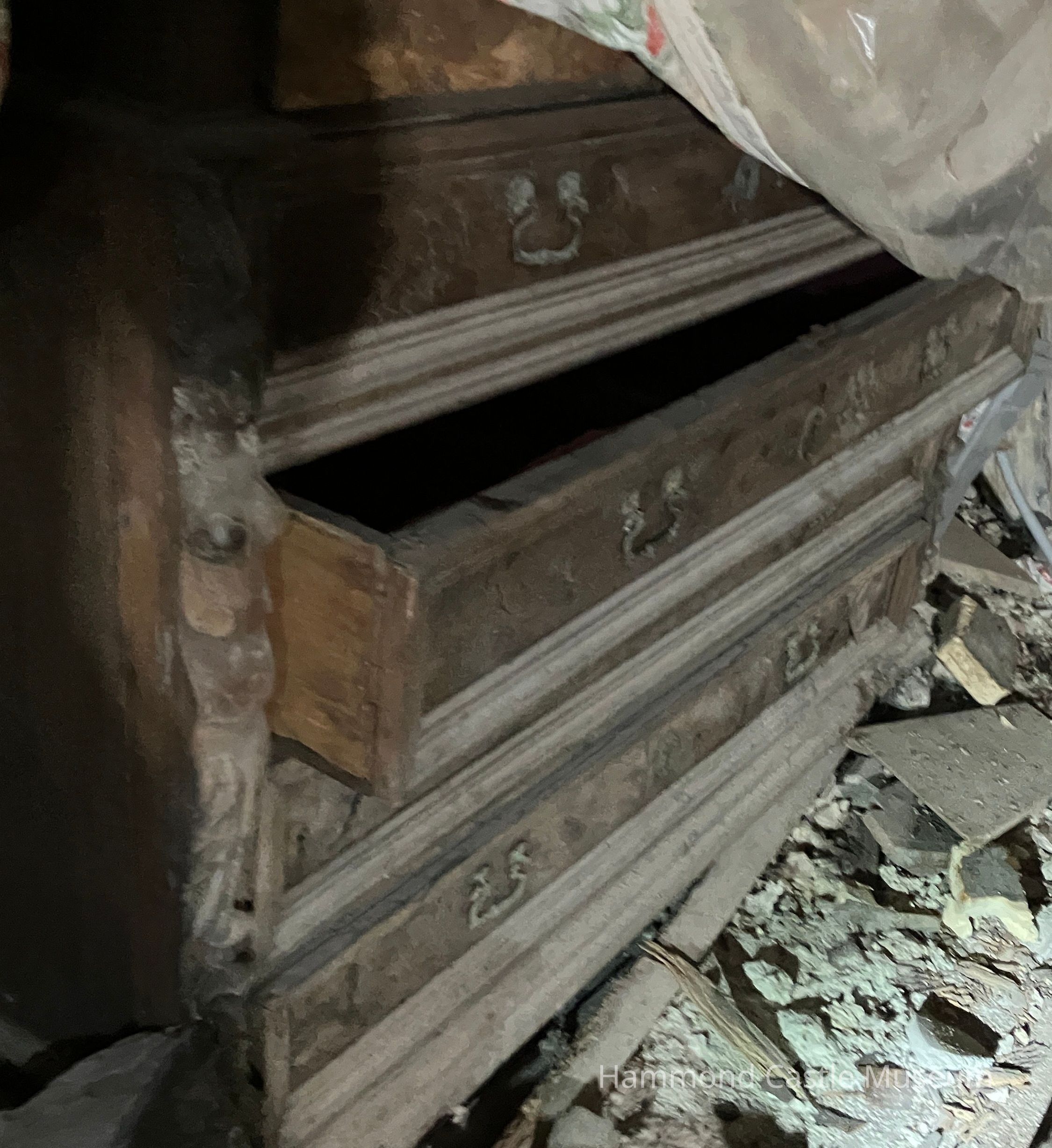 Located in Zalessky room. Water damaged and slightly moldy in drawers, covered in plastic sheeting to protect from environmental conditions. Wood is still holding up. - 4/26/2024, RSH