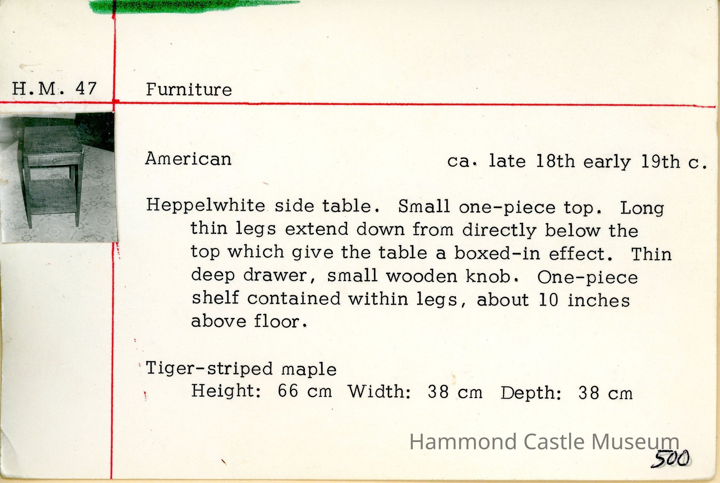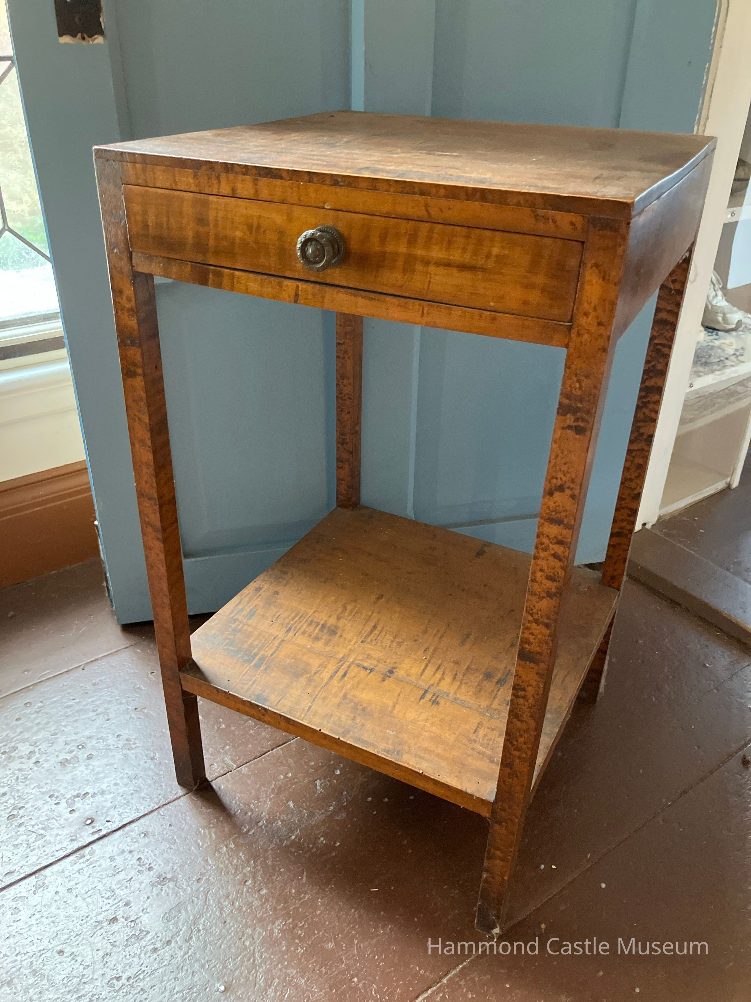 Heppelwhite side table. Small one-piece top. Long thin legs extend down from directly below the top which give the table a boxed-in effect. Thin deep drawer, small wooden knob. One-piece shelf contained within legs, about 10 inches above floor. Tiger-striped maple.