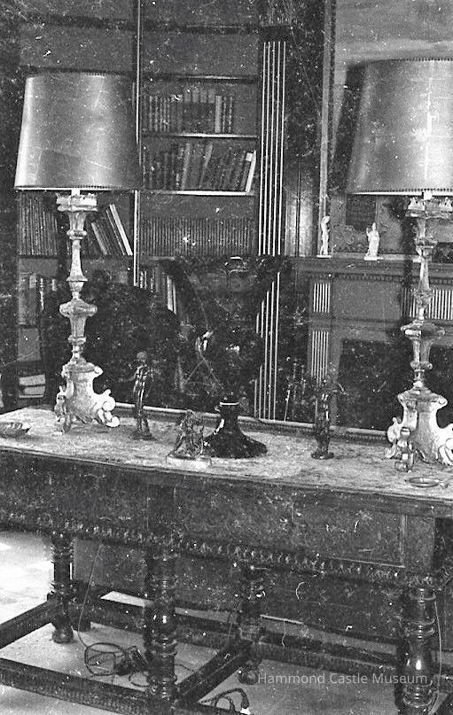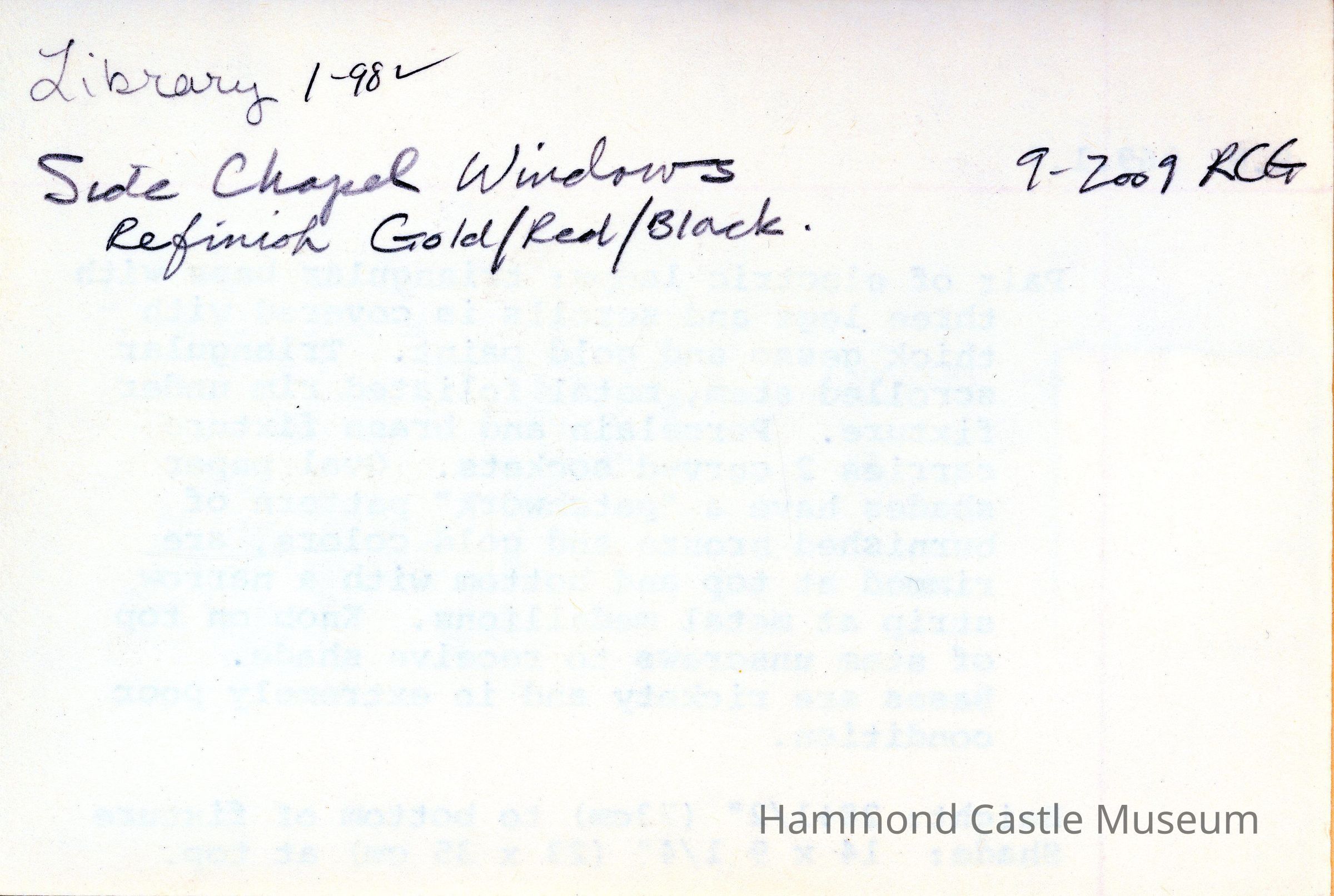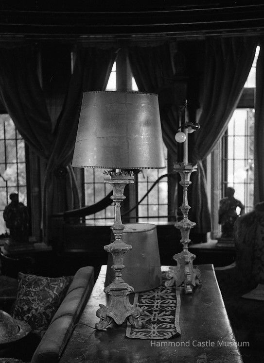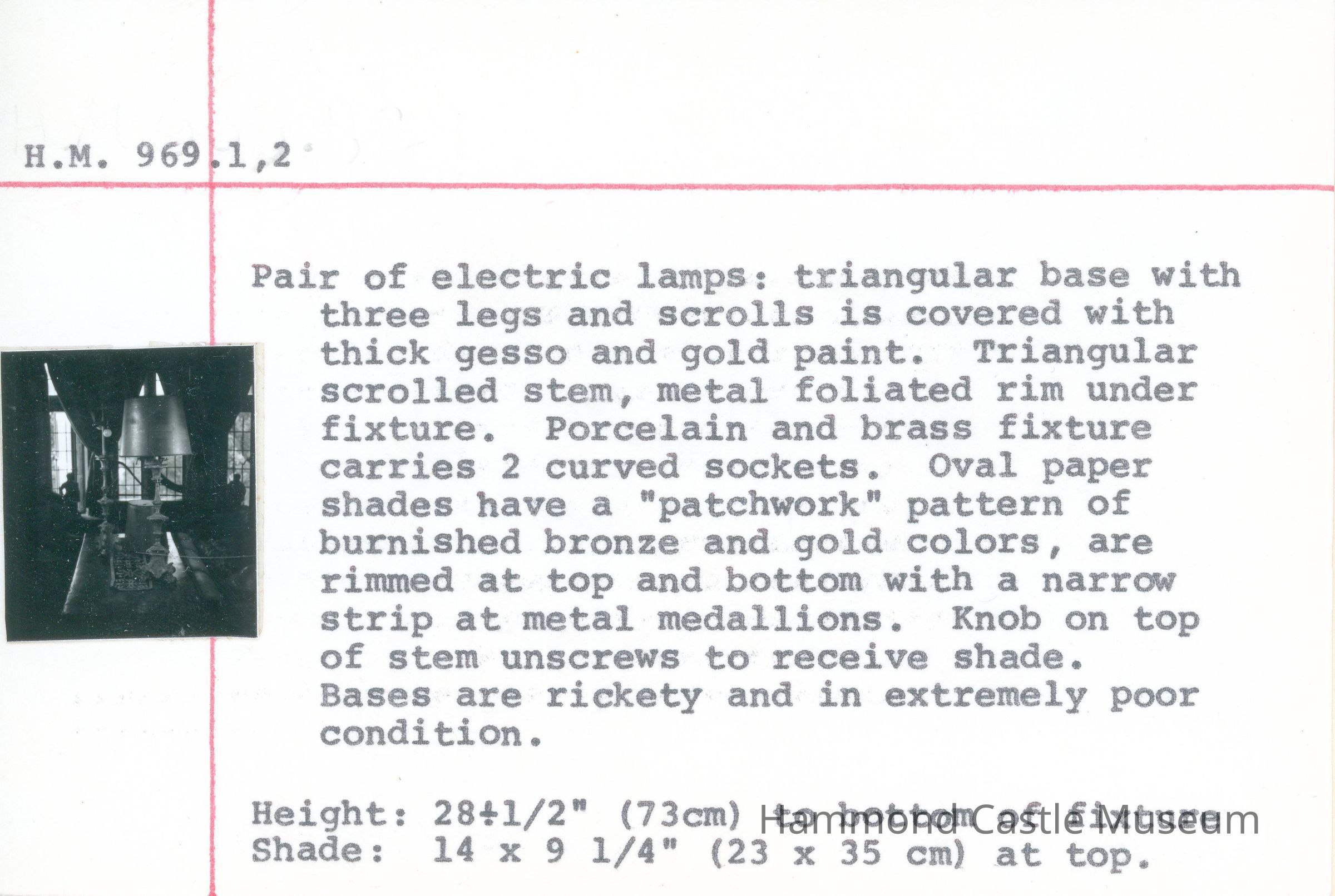Pair of electric lamps; triangular base with three legs and scrolls is covered with thick gesso and gold paint. Triangular scrolled stem, metal foliated rim under fixture. Porcelain and brass fixture carries 2 curved sockets. Oval paper shades have a "patchwork" pattern of burnished bronze and gold colors, are rimmed at top and bottom with a narrow strip at metal medallions. Knob on top of stem unscrews to receive shade. Bases are rickety and in extremely poor condition.