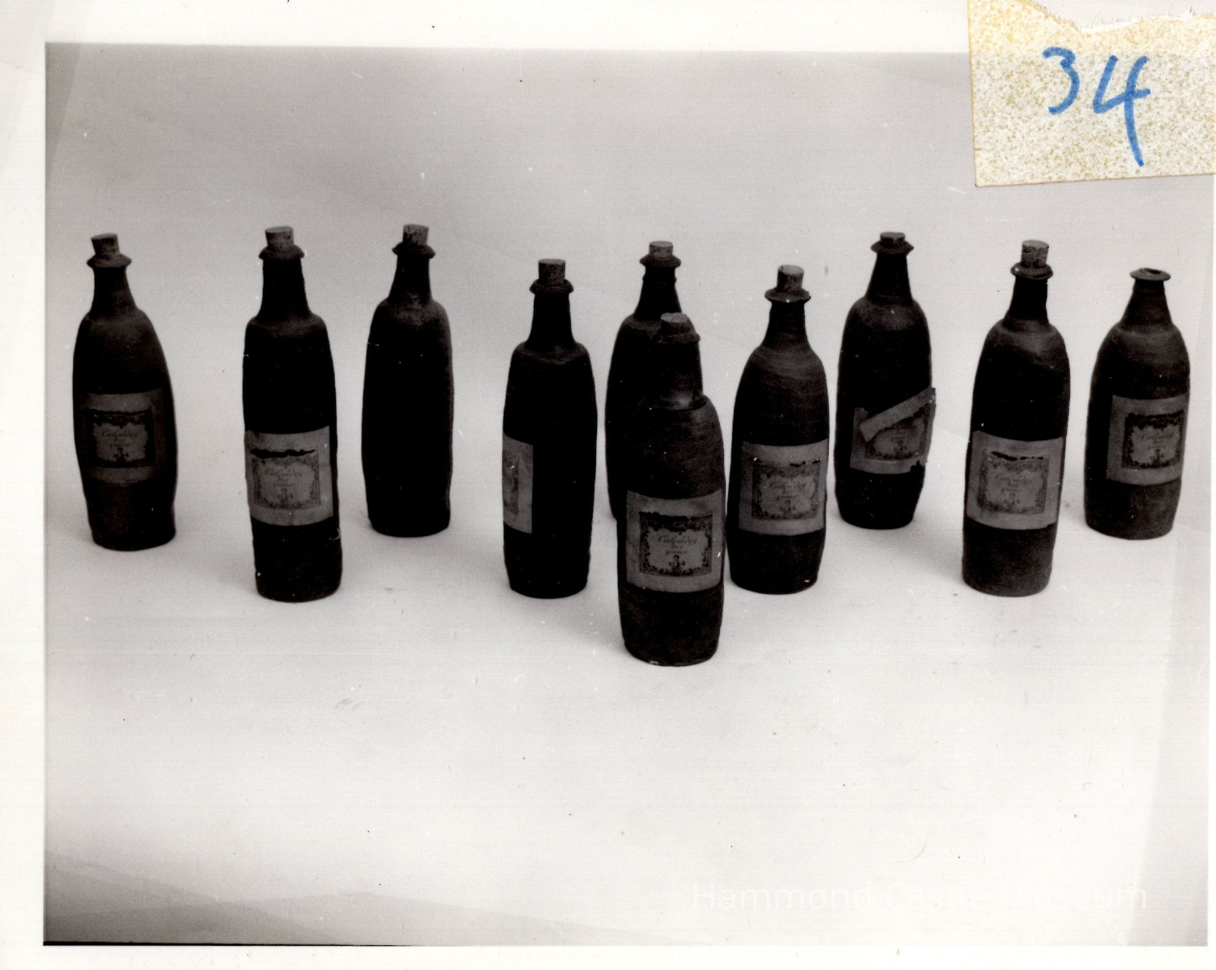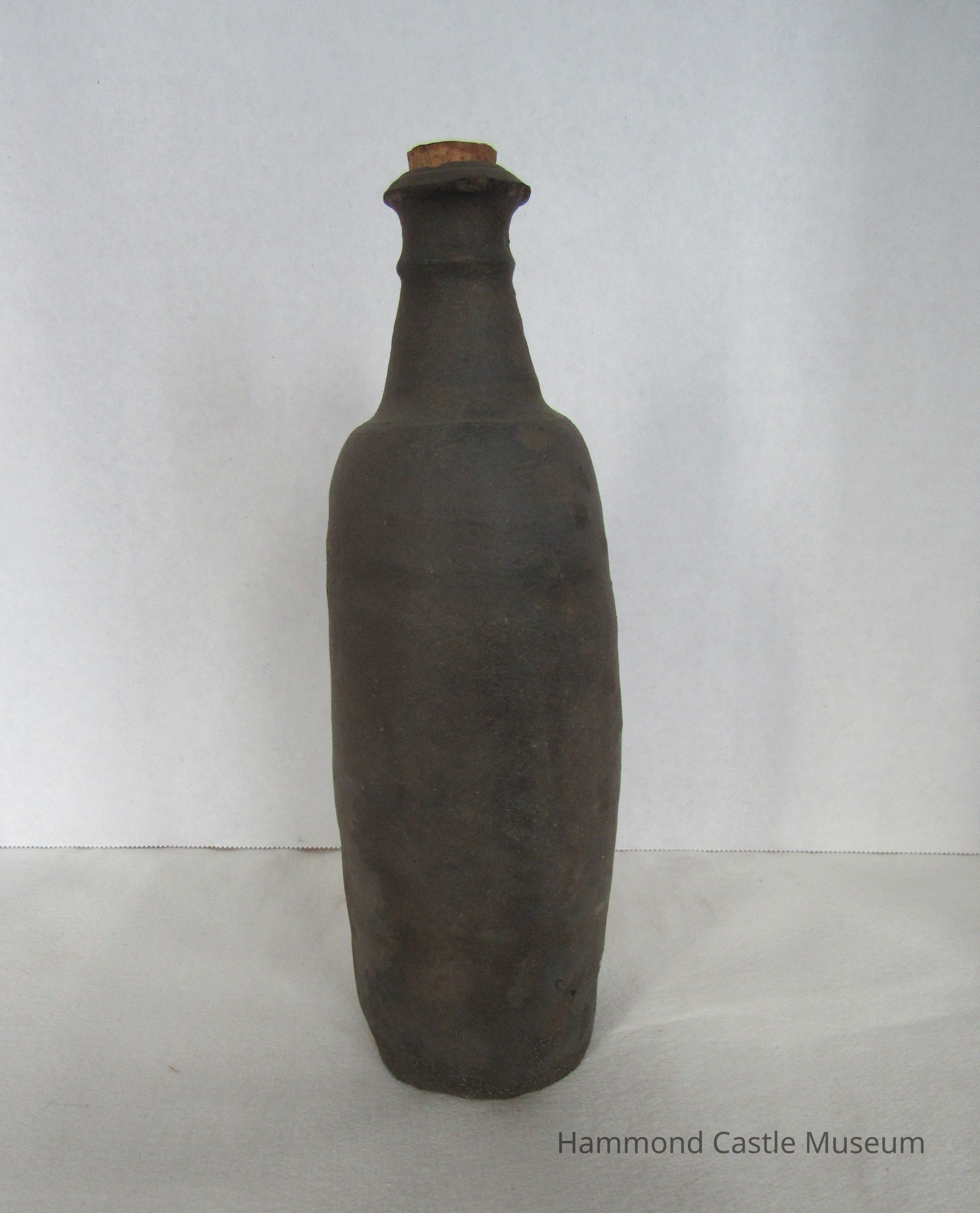 Liquor bottle, sienna and green in color. "Calvados tres Vieux" on label. Unglazed brown and black. 1 of 10.