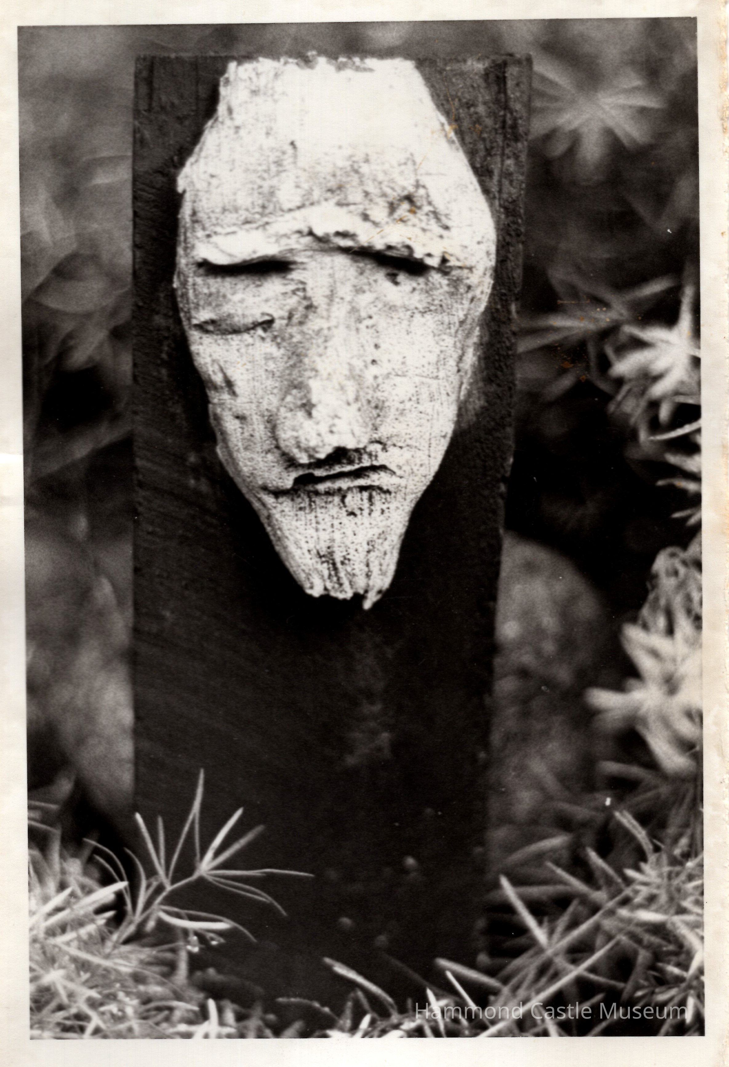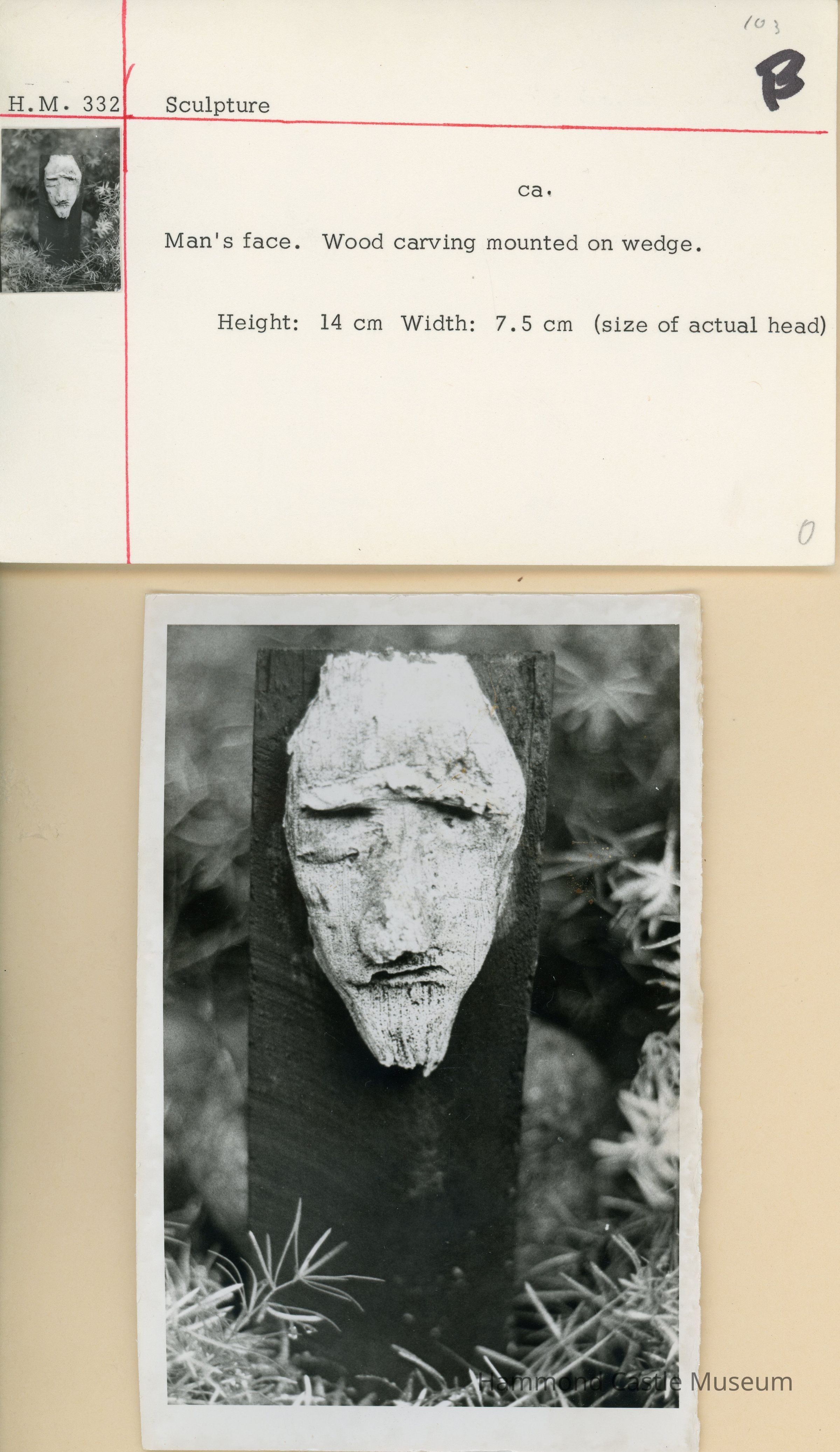 Sculpture of man's face. Wood carving mounted on wedge.Collection