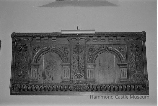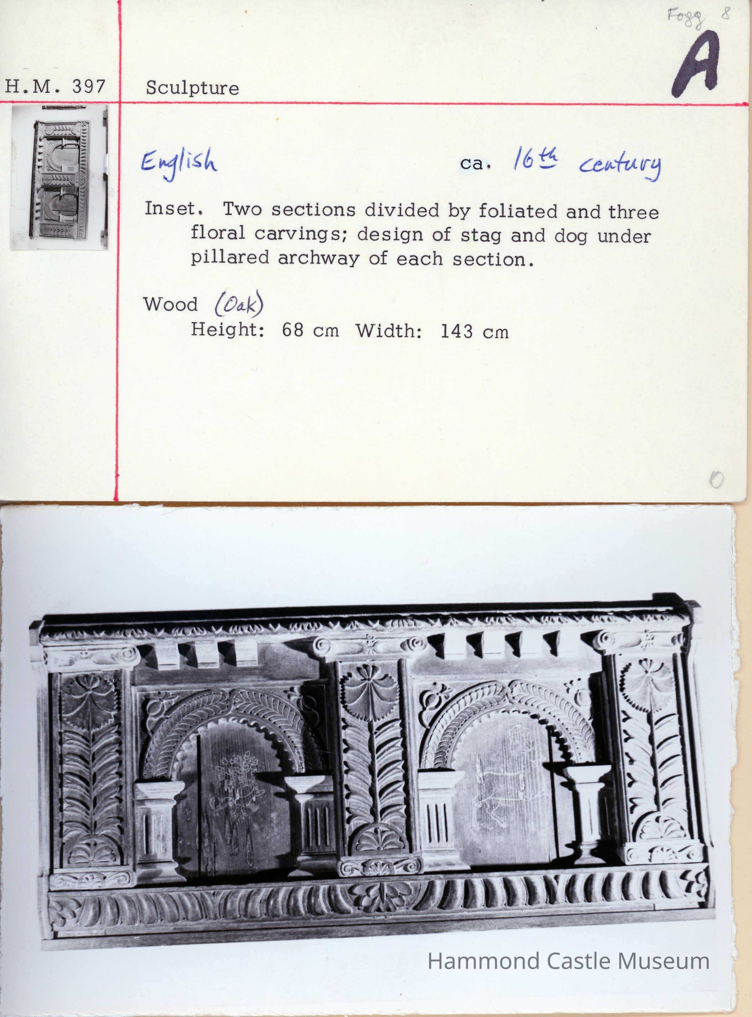 Carved wooden panel with 2 inset sections divided by foliated and three floral carvings; design of stag and dog under pillared archway of each section.