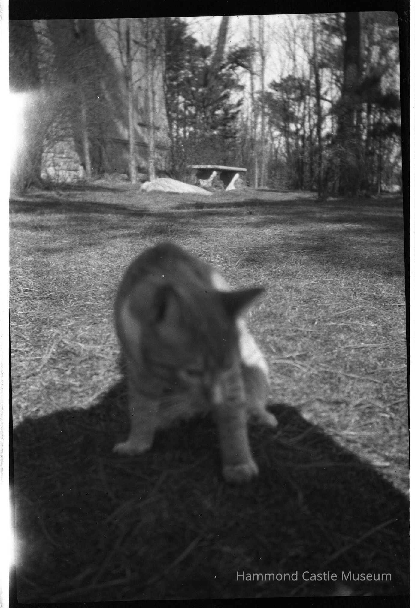 Negative of cat on ocean lawn