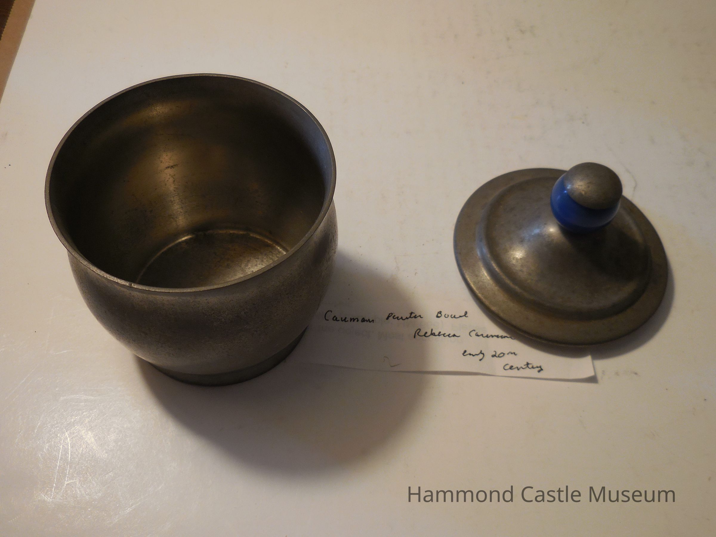 Pewter sugar bowl set. (a) creamer, (b) sugar bowl, (c) sugar bowl lid. Note reads: "Cauman Pewter Bowl Rebecca Cauman early 20th century"