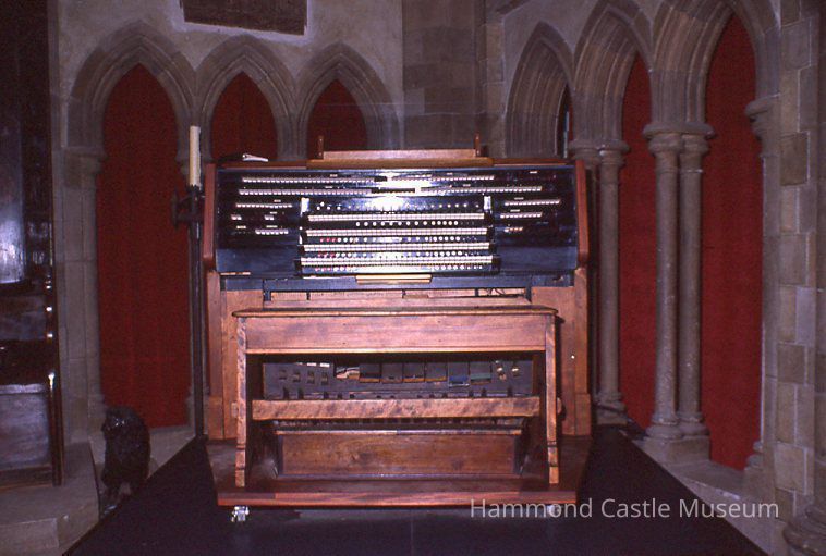 The year Virgil Fox lived in the castle, he had the console moved downstairs and had the case of the console replaced with a light colored wood. The stops and keyboards etc. were still the originals.