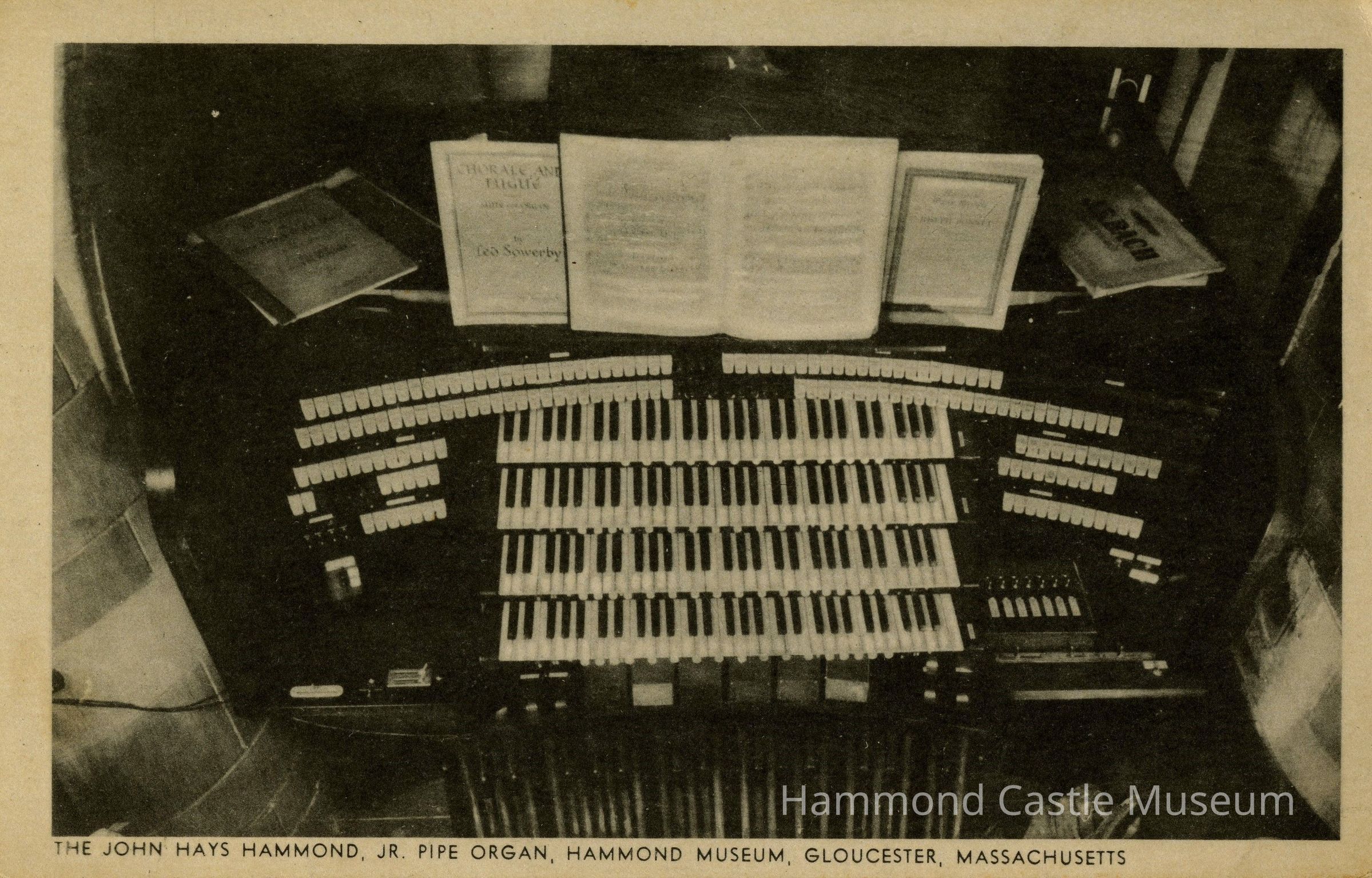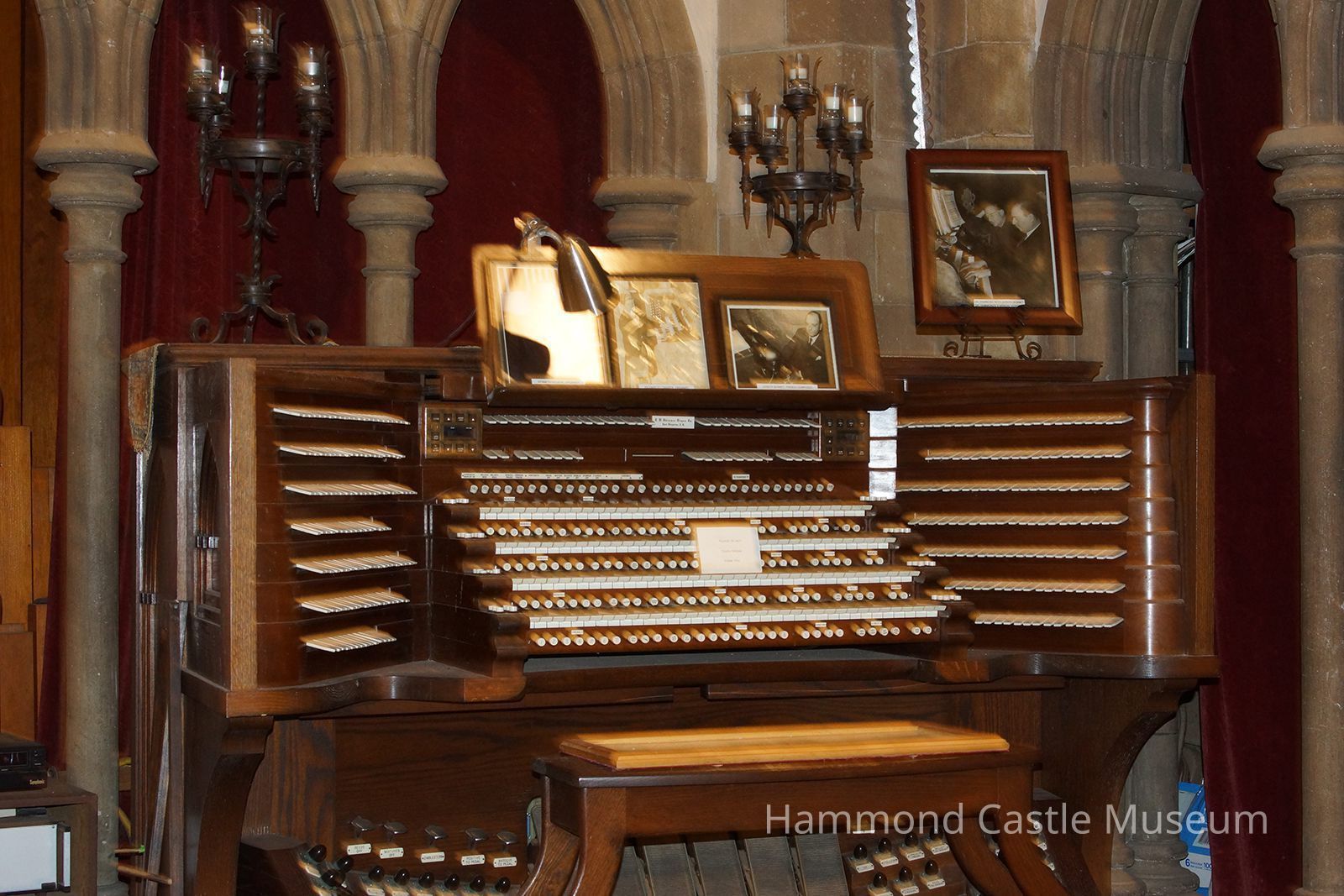 This console was built by Austin in the 1920s, then bought by Hammond for the castle from a church. It was then modified in 1947 by Austin to be a 4 manual with new stops.