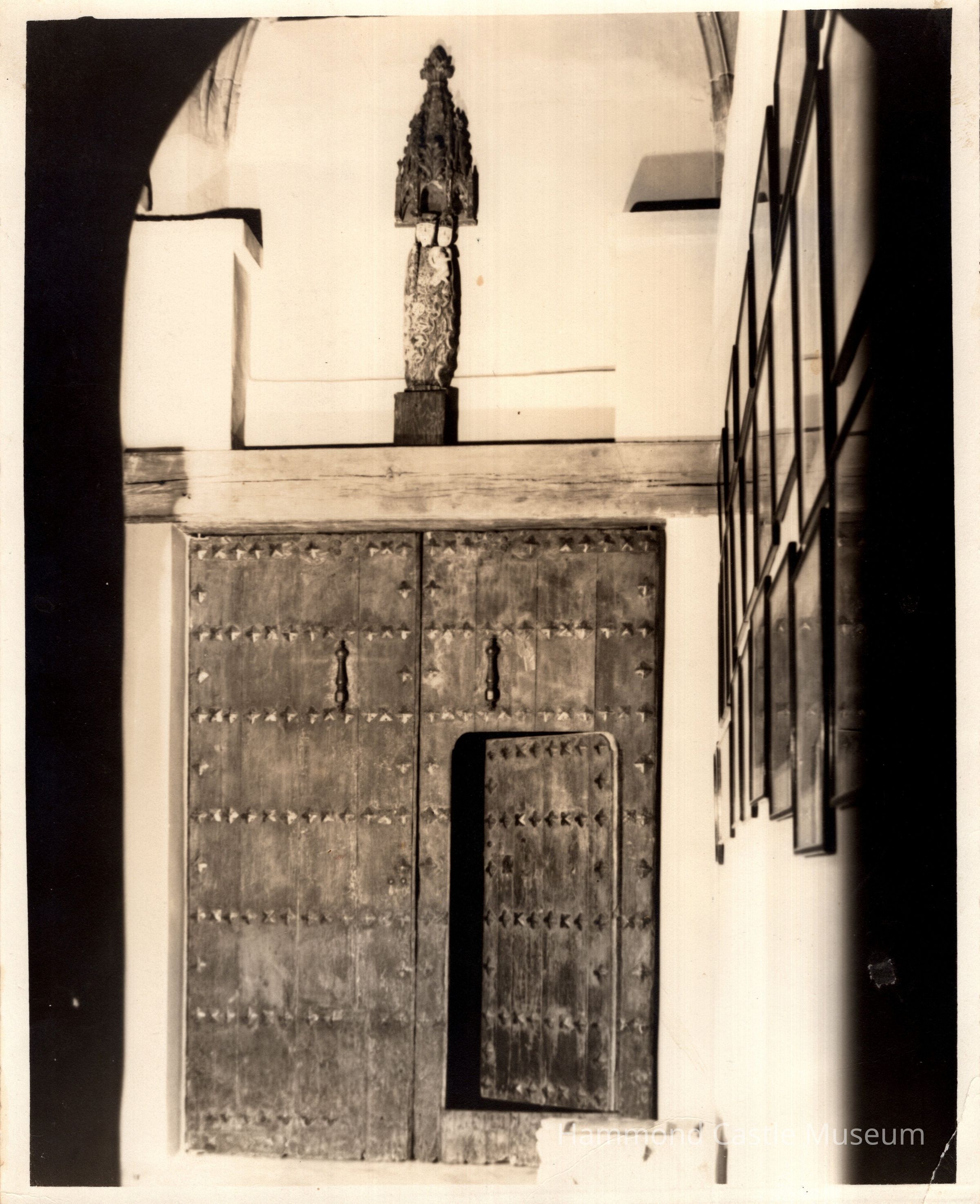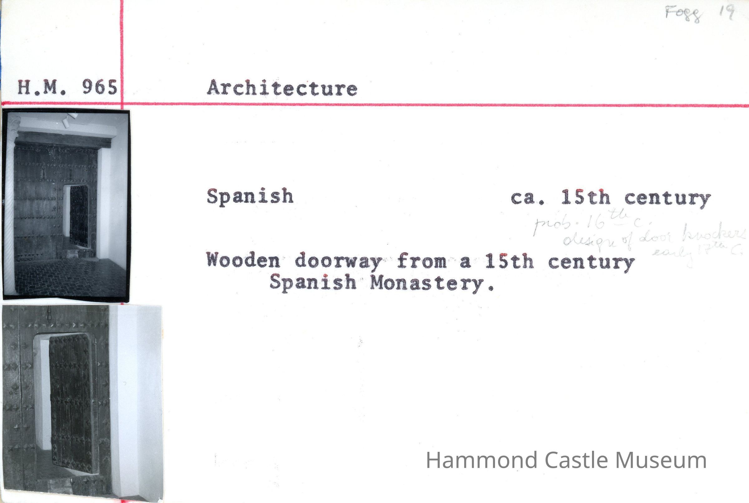 Wooden doorway from 15th-century Spanish monastery. Smaller door opening on one side.