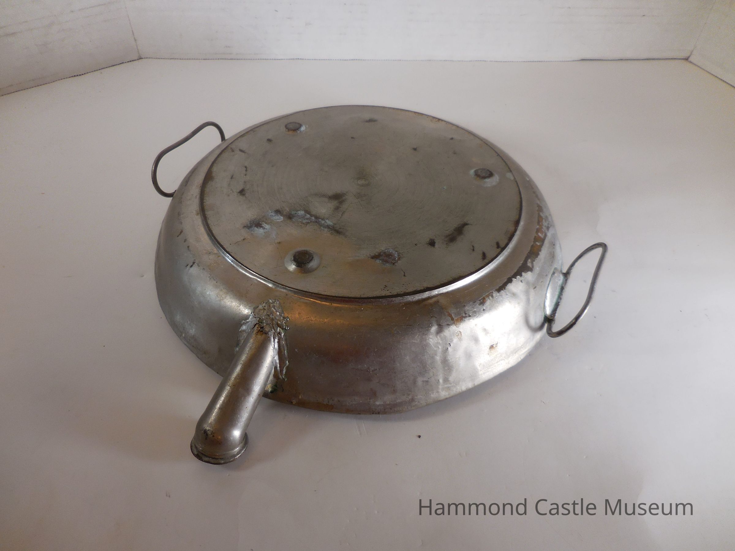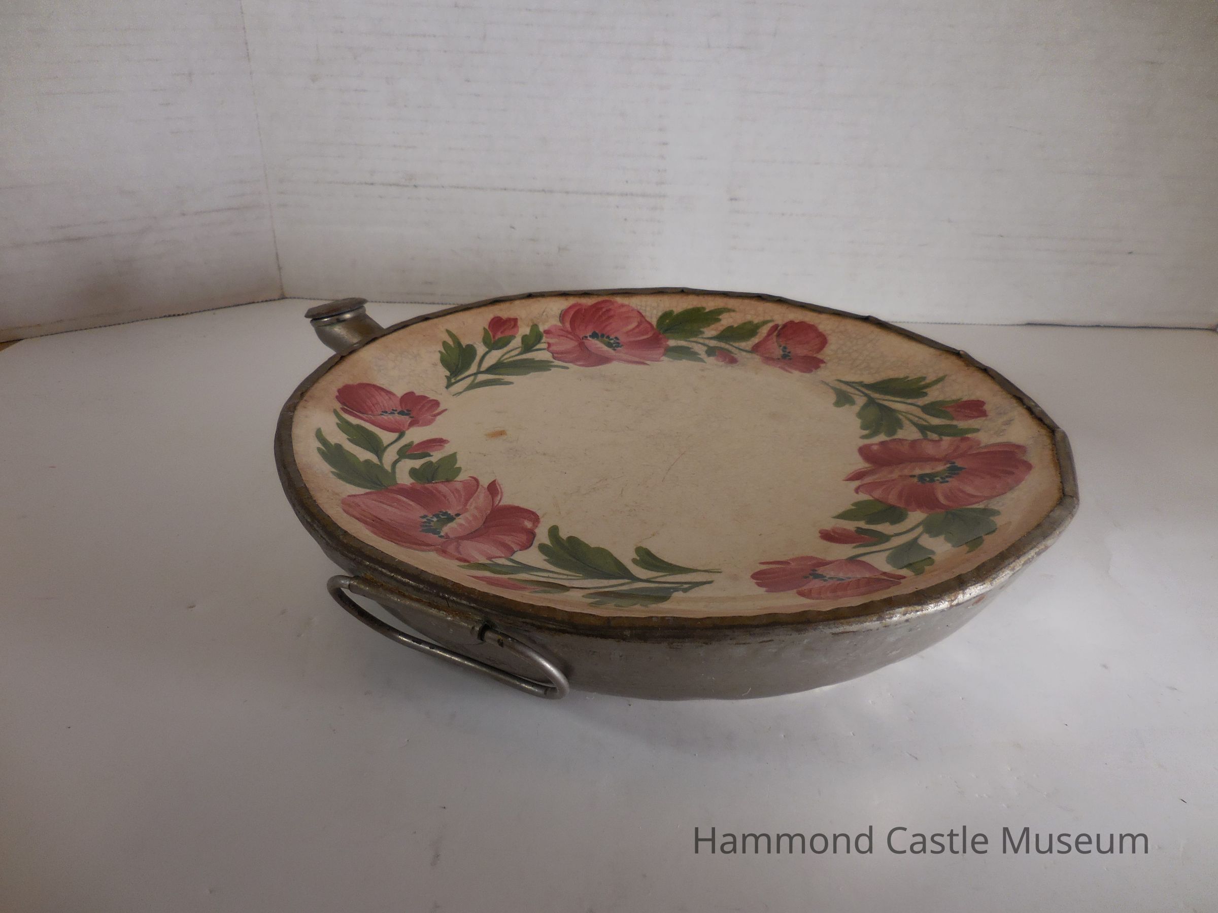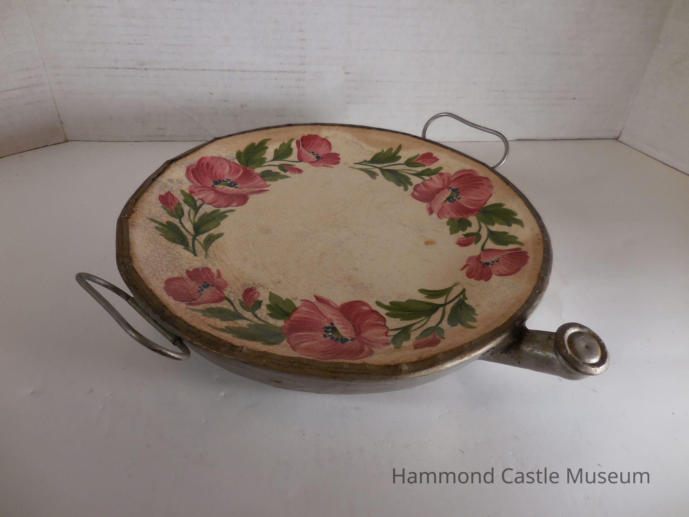 Ceramic warming dish with painted flowers, a metal bottom and metal handles. Has a spout that one could pour hot water into to keep the food on it warm.