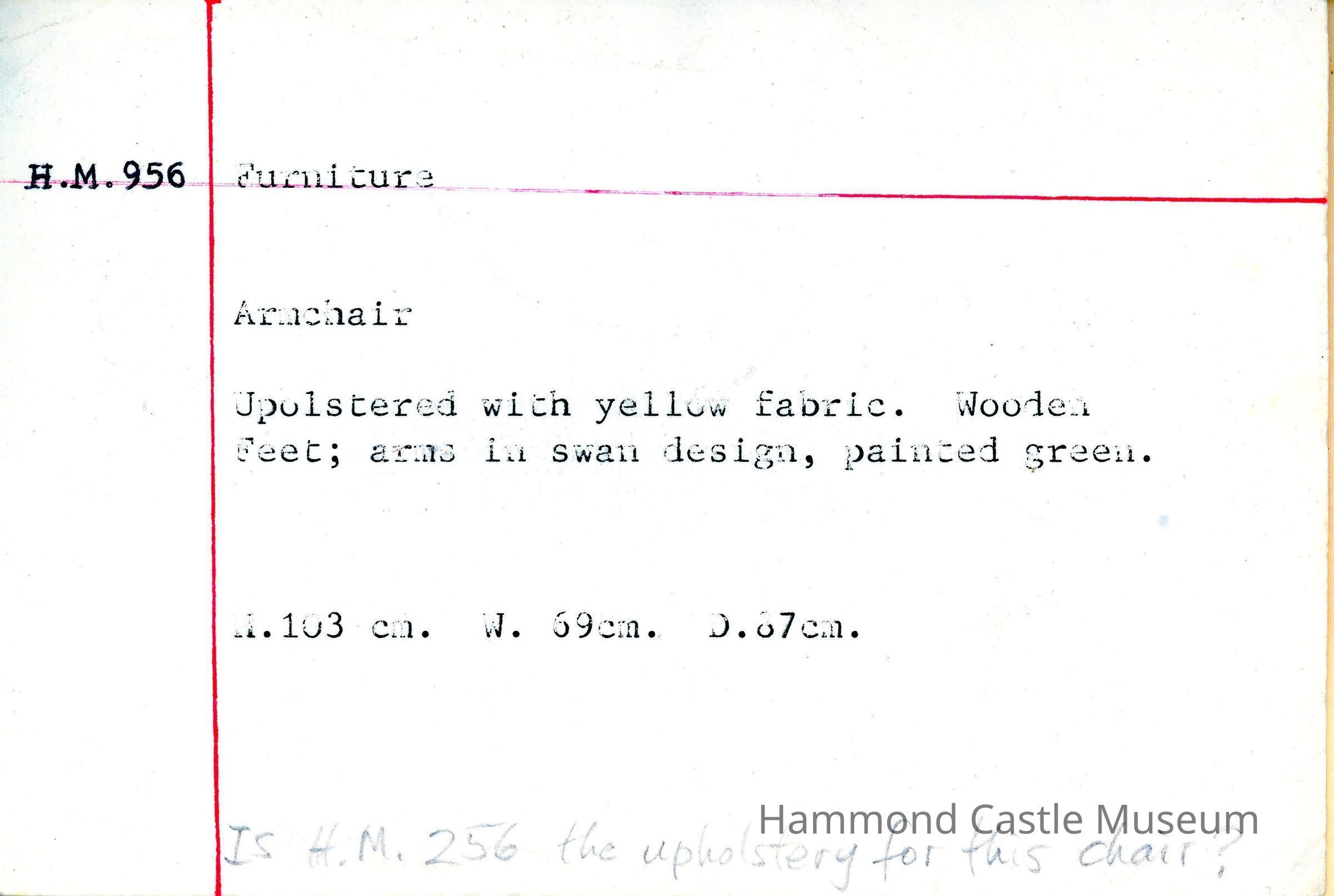 Upholstered with yellow fabric Wooden feet; arms in swan design, painted green 1987 sent to Jefferson warehouse