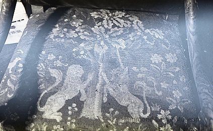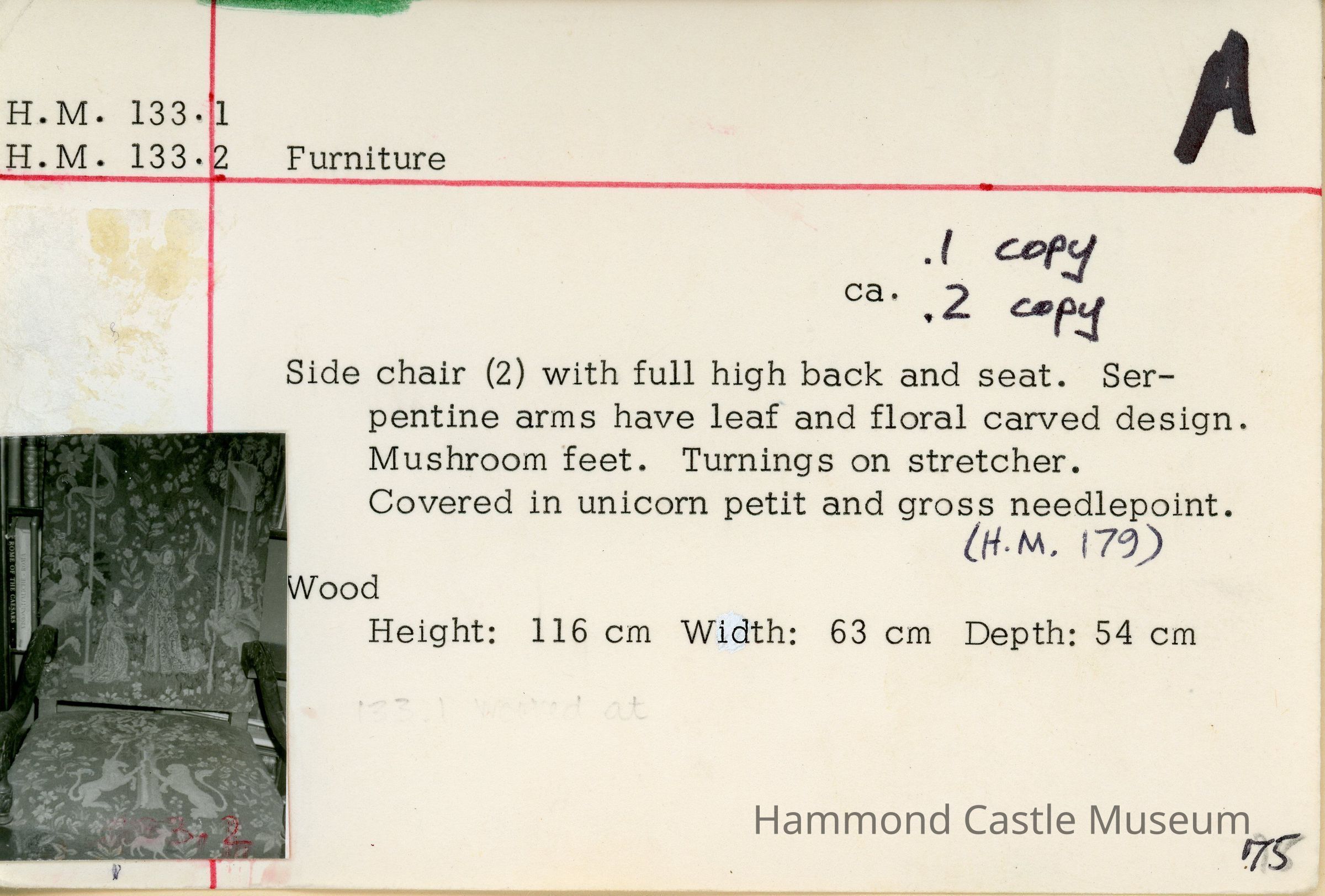 HM133. 1&2 carved chairs w HM179 unicorn needlepoint (1983 condition report)Note Type