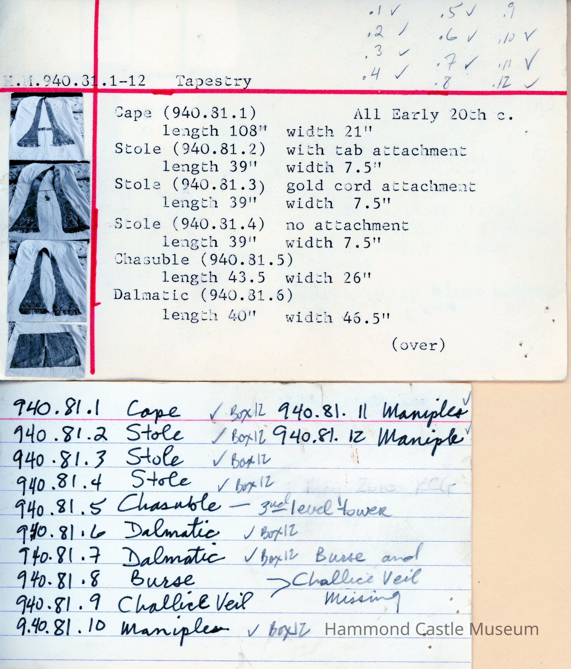 Part of a matched set. Gold and red brocade. Angel in mandorla and leaf pattern. Matching trim and gold fringes. Magenta linings. Loaned by Rev. Ronald Gagne M.S. LaSalette Shrine Ipswich, MA 01938 June, 1981