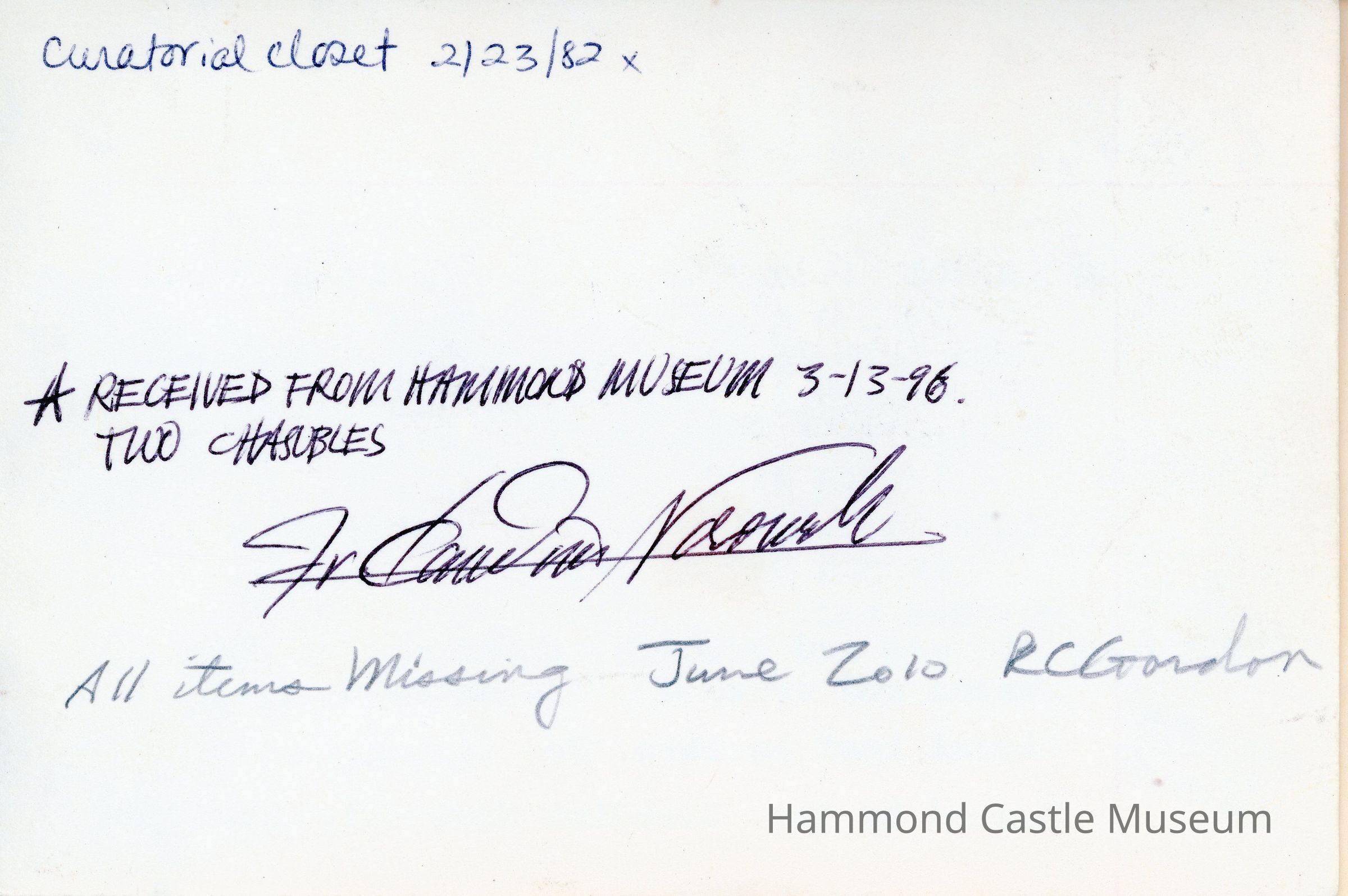 Matching set of gold and red brocade, intertwining wheat, grapes and cross motifs. Matching trim, floral leaf pattern. Red lining. Loaned by Rev. Claudius Nowinski, June 1978.