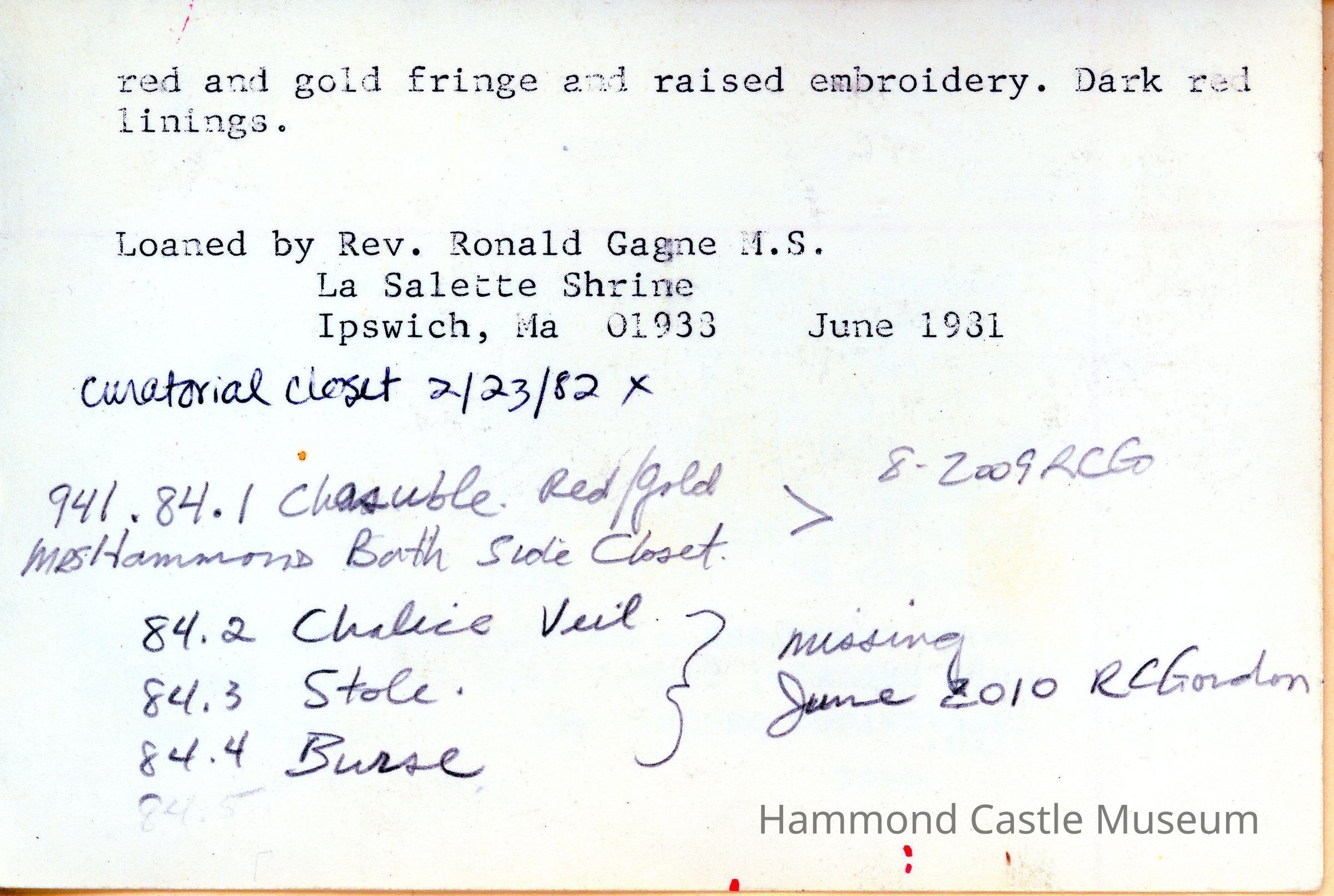 Part of a matched ecclesiastical set. Dark red and gold brocade; floral leaf pattern. Matching intertwined pattern edging and trim. some with red and gold fringe and raised embroidery. Dark red linings. Loaned by Rev. Ronald Gagne M.S. LaSalette Shrine Ipswich, MA 01938 June, 1981