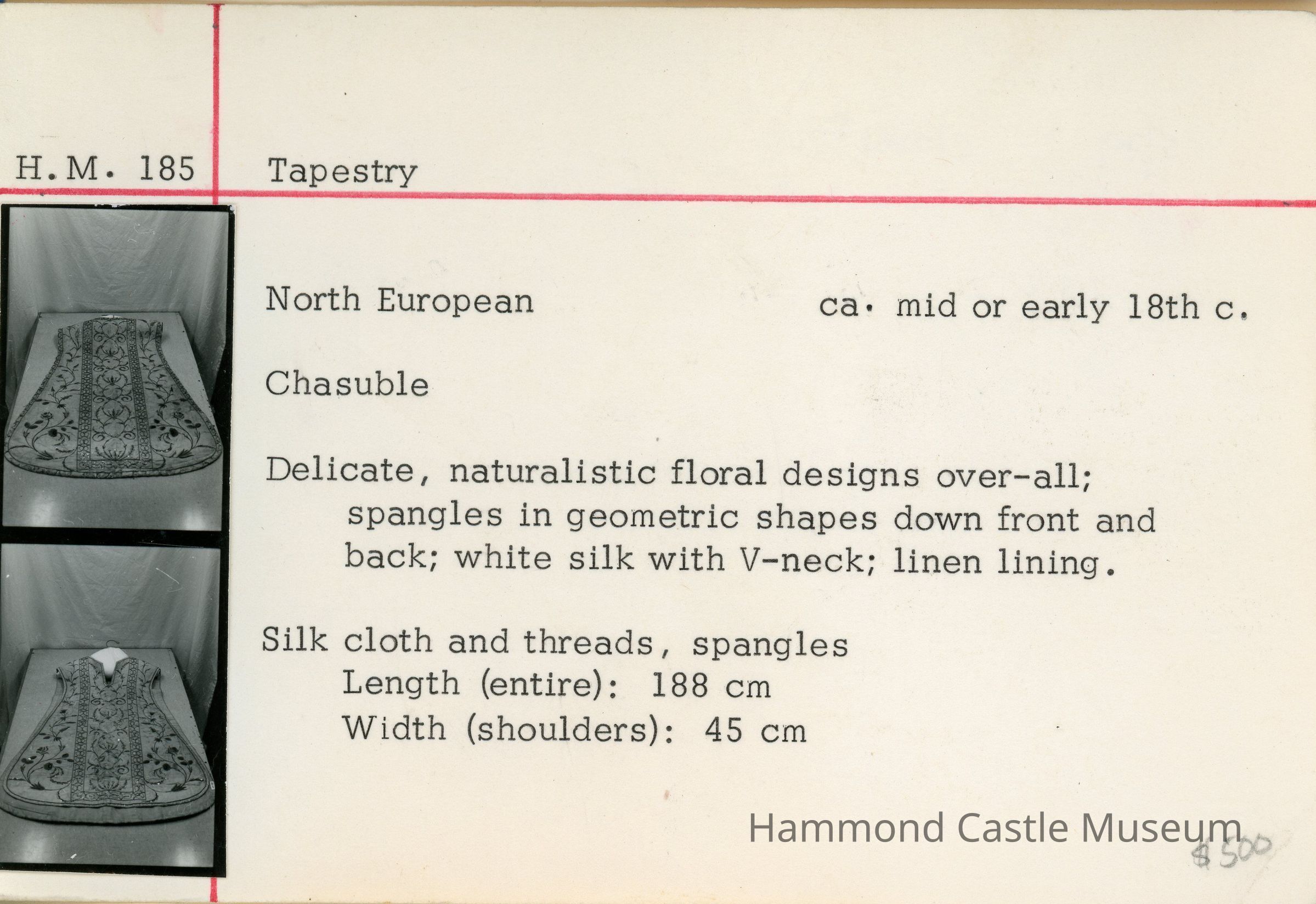 Delicate, naturalistic floral designs overall; spangles in geometric shapes down front and back; white silk with V-neck; linen lining.