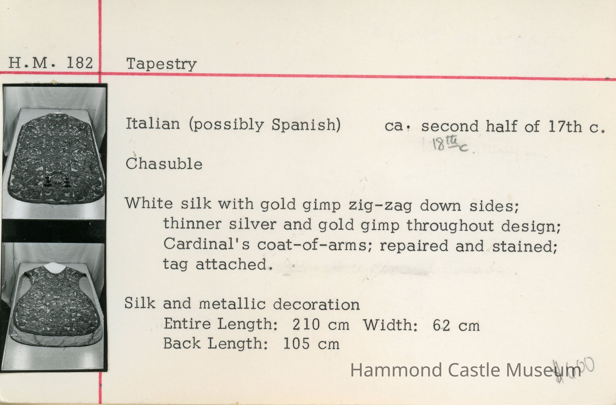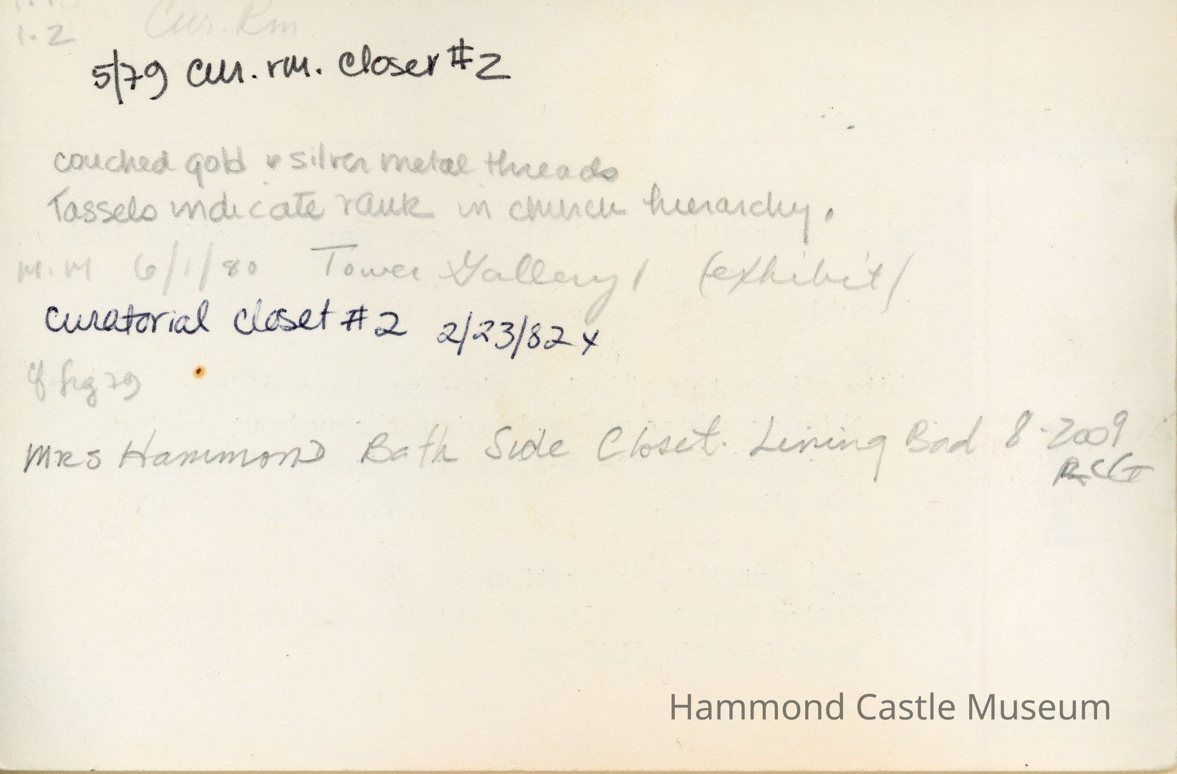 White silk with gold gimp zig-zag down sides; thinner silver and gold gimp throughout design; Cardinal's coat-of-arms; repaired and stained; tag attached.