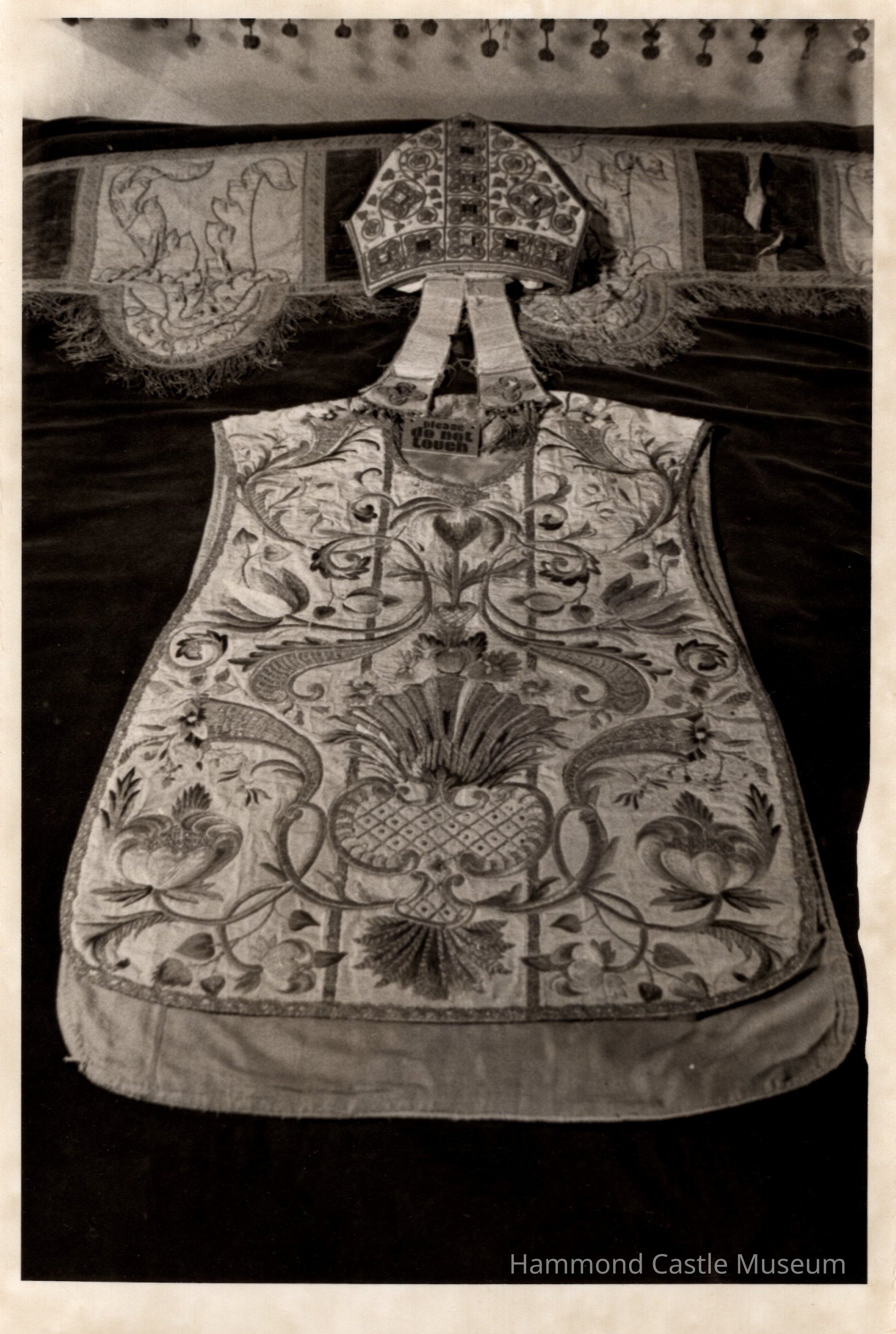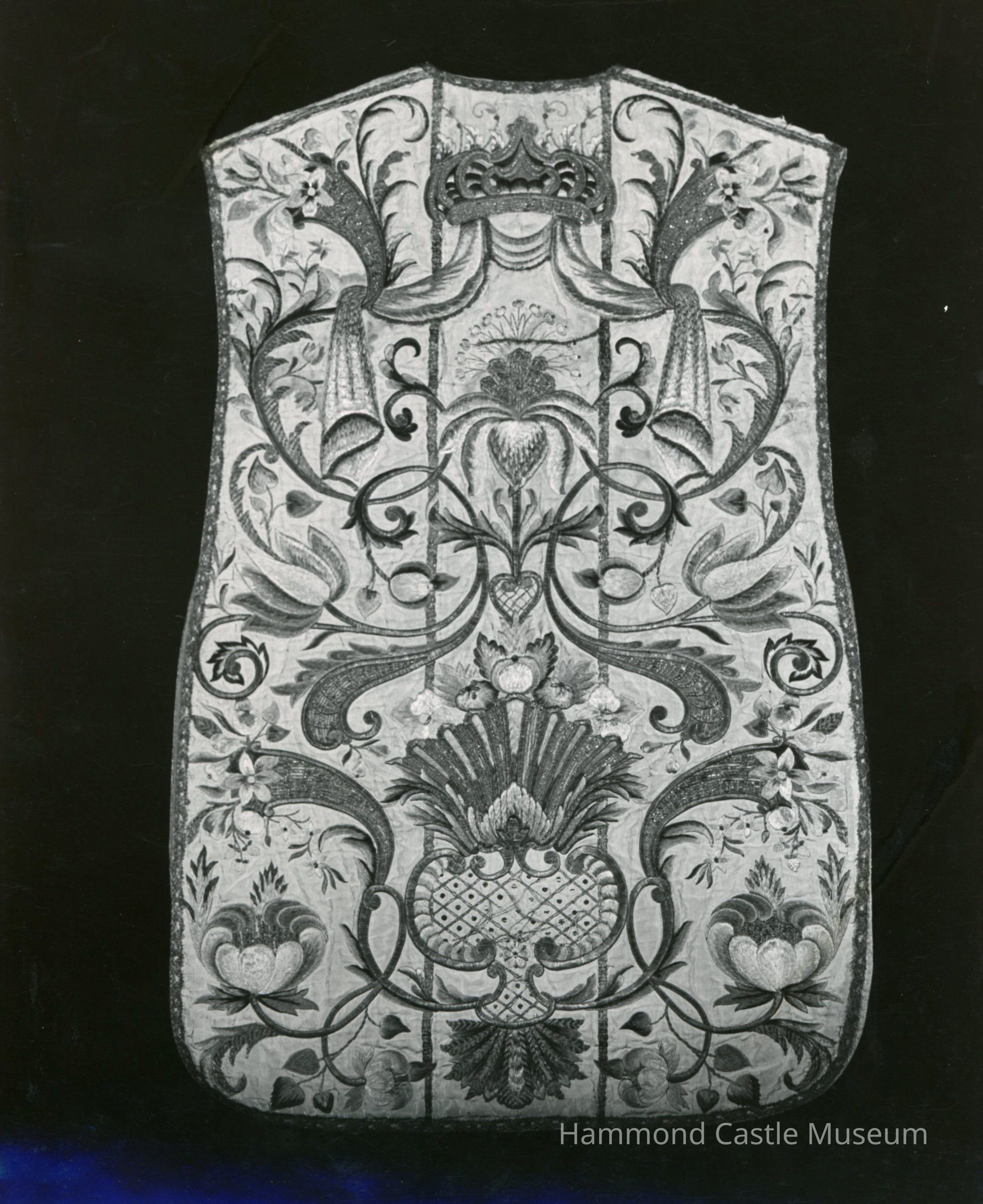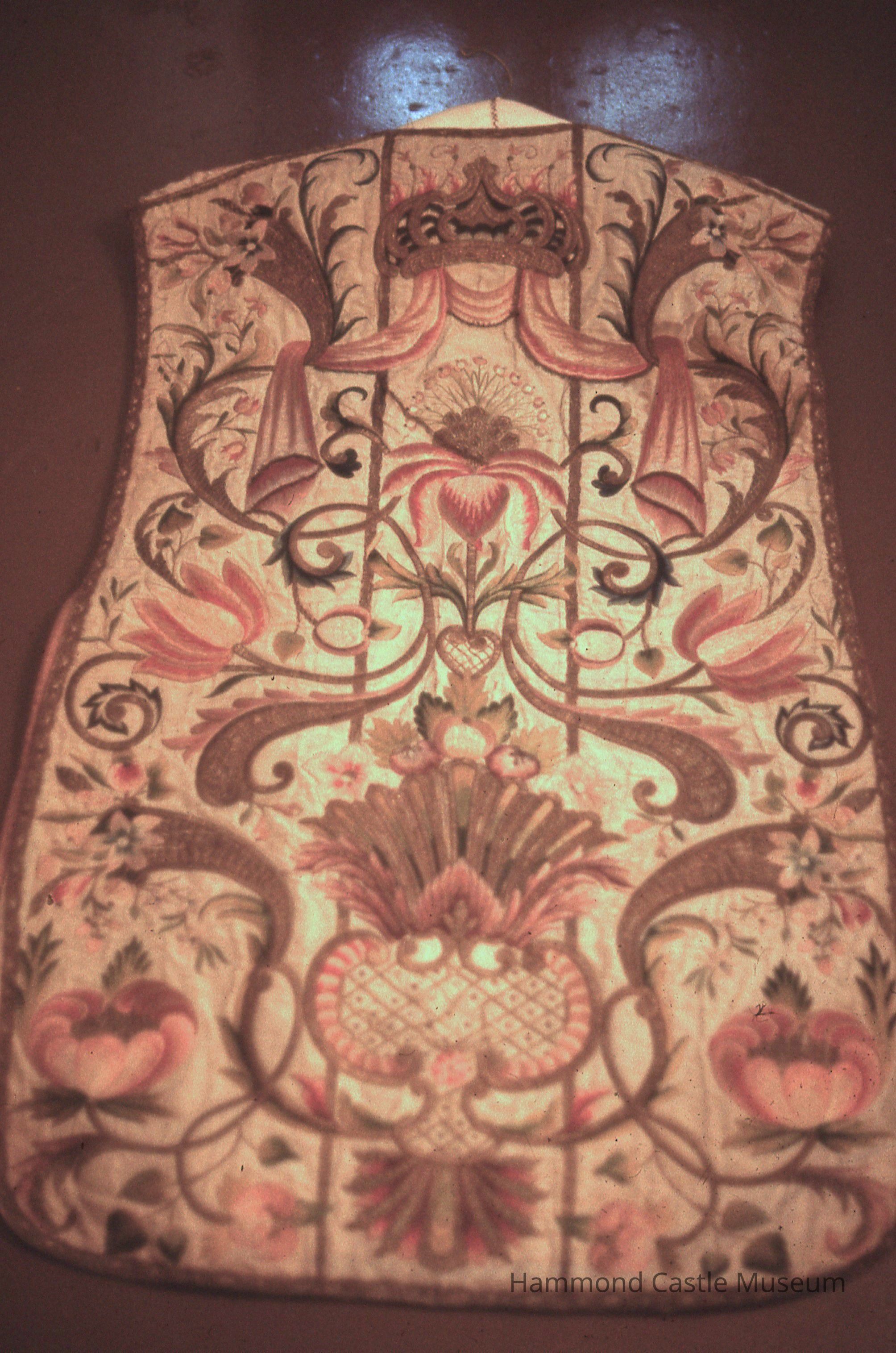"The chasuble is of wide cut, of plain weave white silk (white was used for church festivals) decorated with luxurious floral and pomegranate designs. These multi-colored embroidered designs are complemented by gold threads couched in stem-like patterns. The edges of the chasuble are trimmed with strips of gold metallic lace."