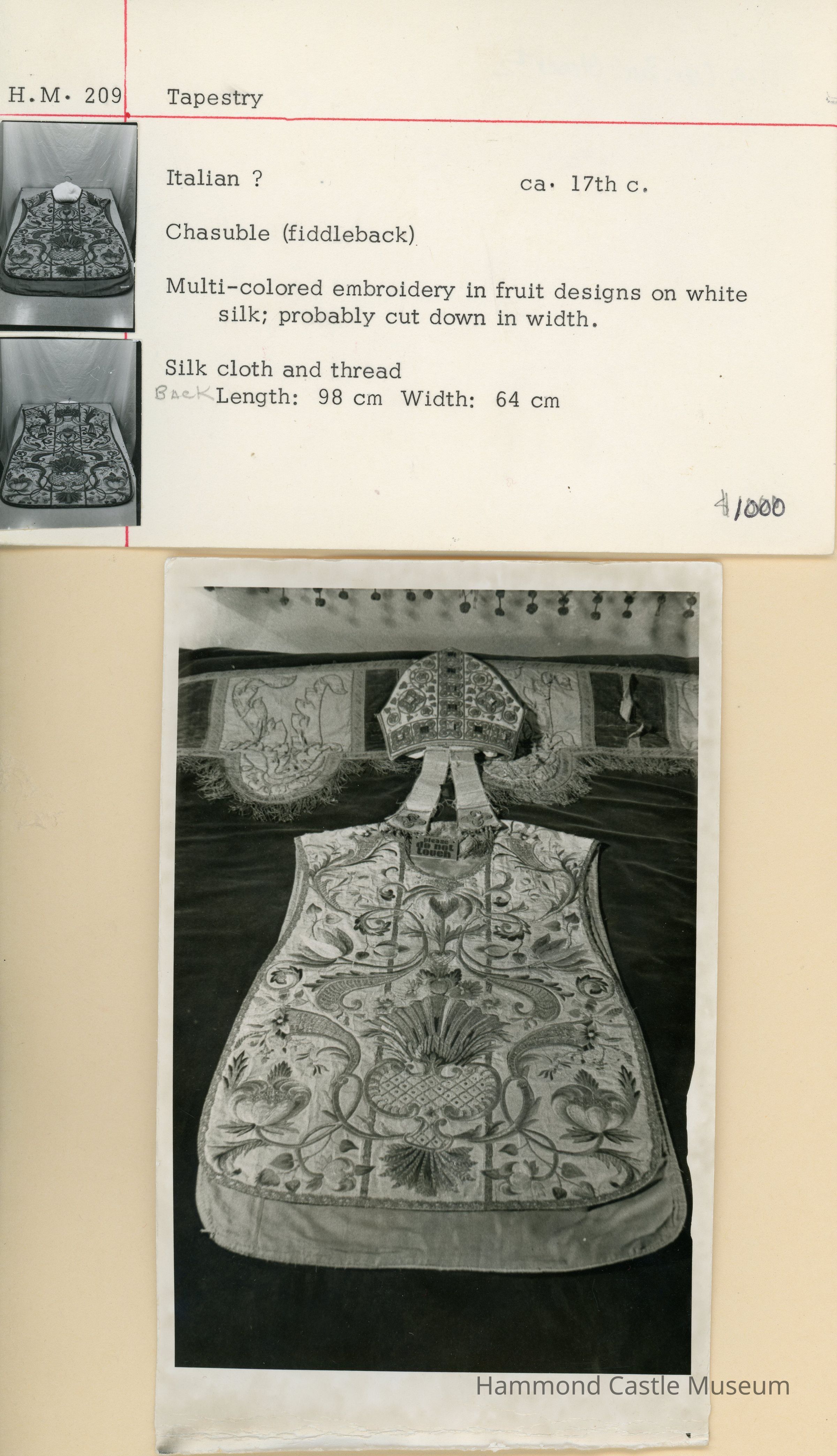 Fiddleback chasuble; Multi-colored embroidery in fruit designs on white silk; probably cut down in width