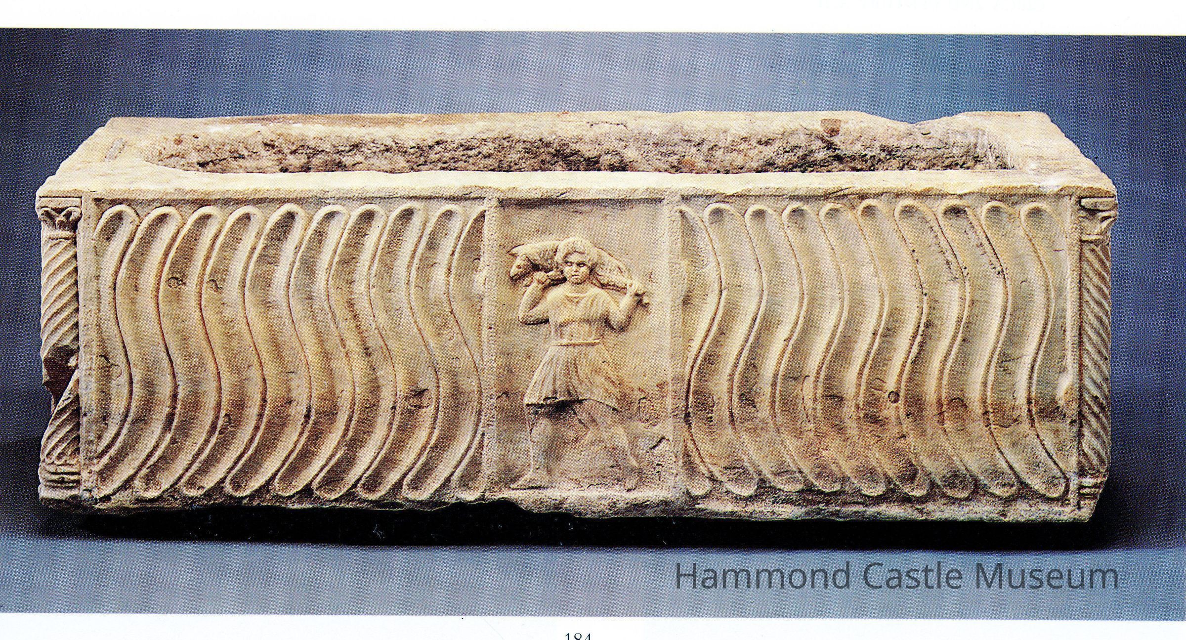 A forger recarved the original plain or scarcely decorated sarcophagus chest in the 1920s. The framed Good Shepherd figure is in the center of the front of the strigillated sarcophagus; columns with spiral fluting are in the corners, and a lion-griffin (according to Christie's 1994) is on each narrow side.