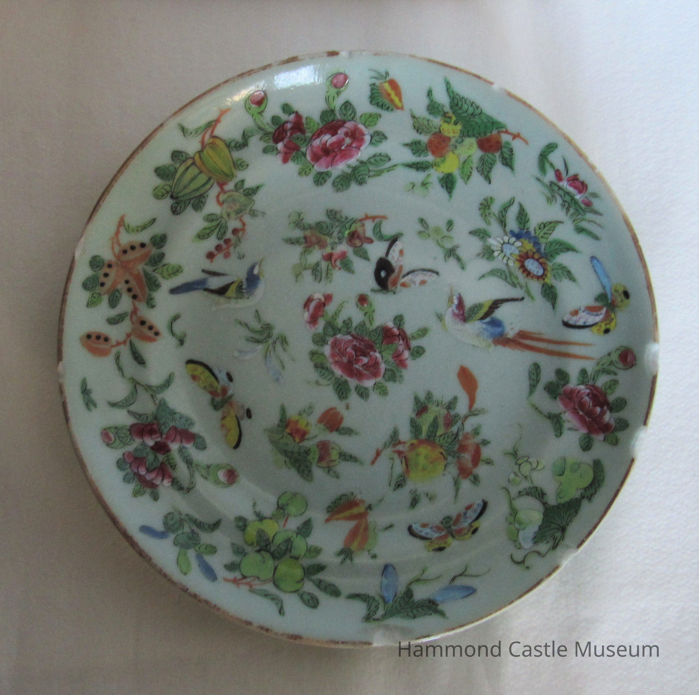 Celadon, Canton Famille Rose with hummingbird and rose famille pattern decoration.
