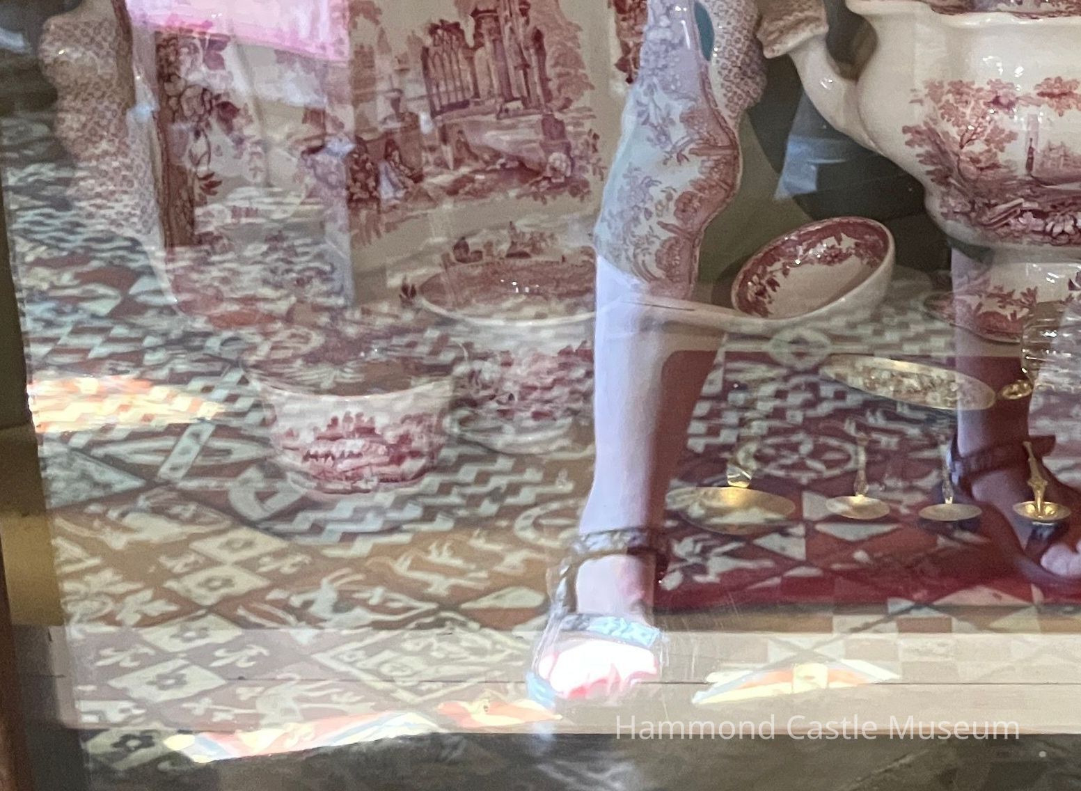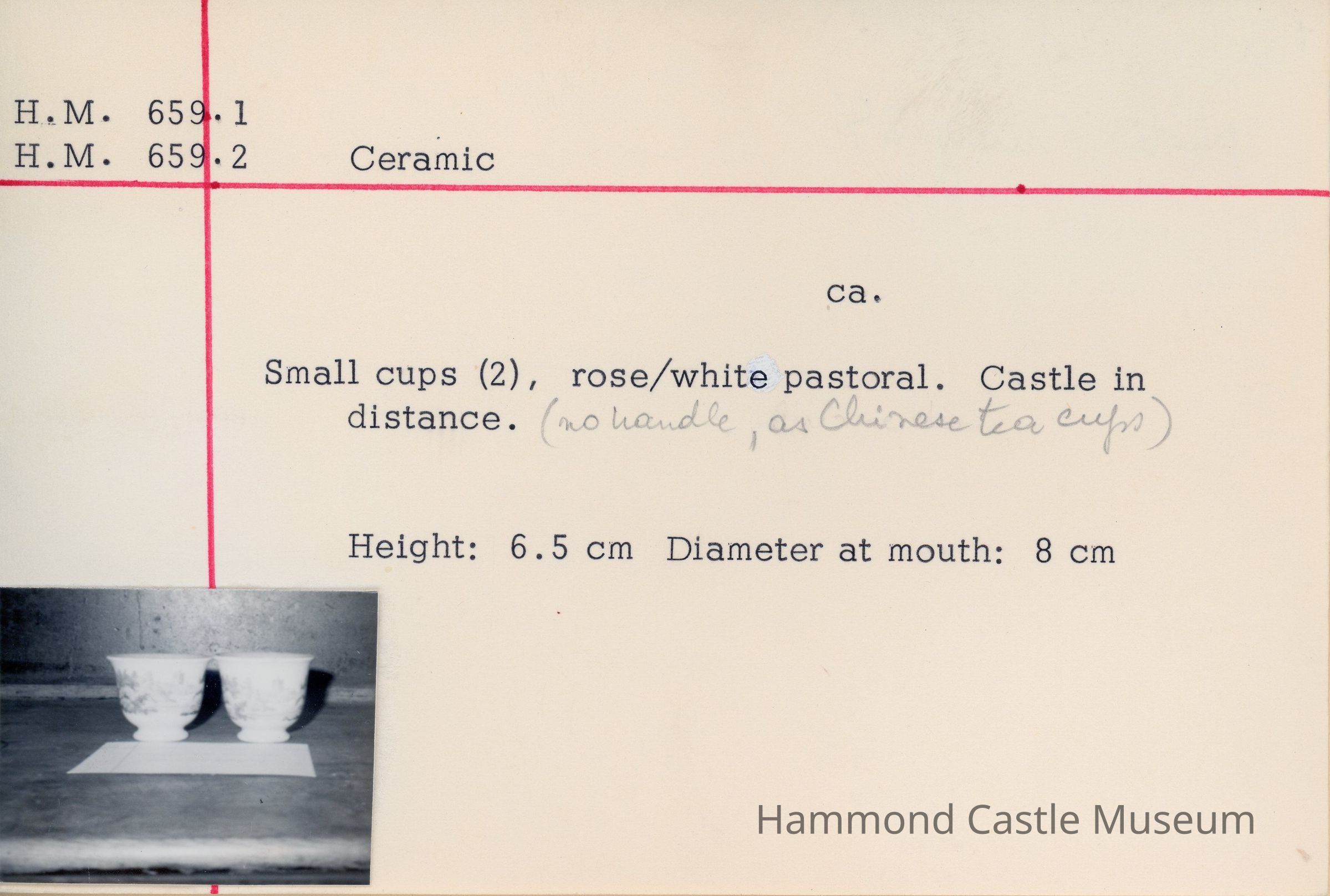Small ceramic cup. Rose/white pastoral. Castle in distance. No handle, as Chinese-style cup.