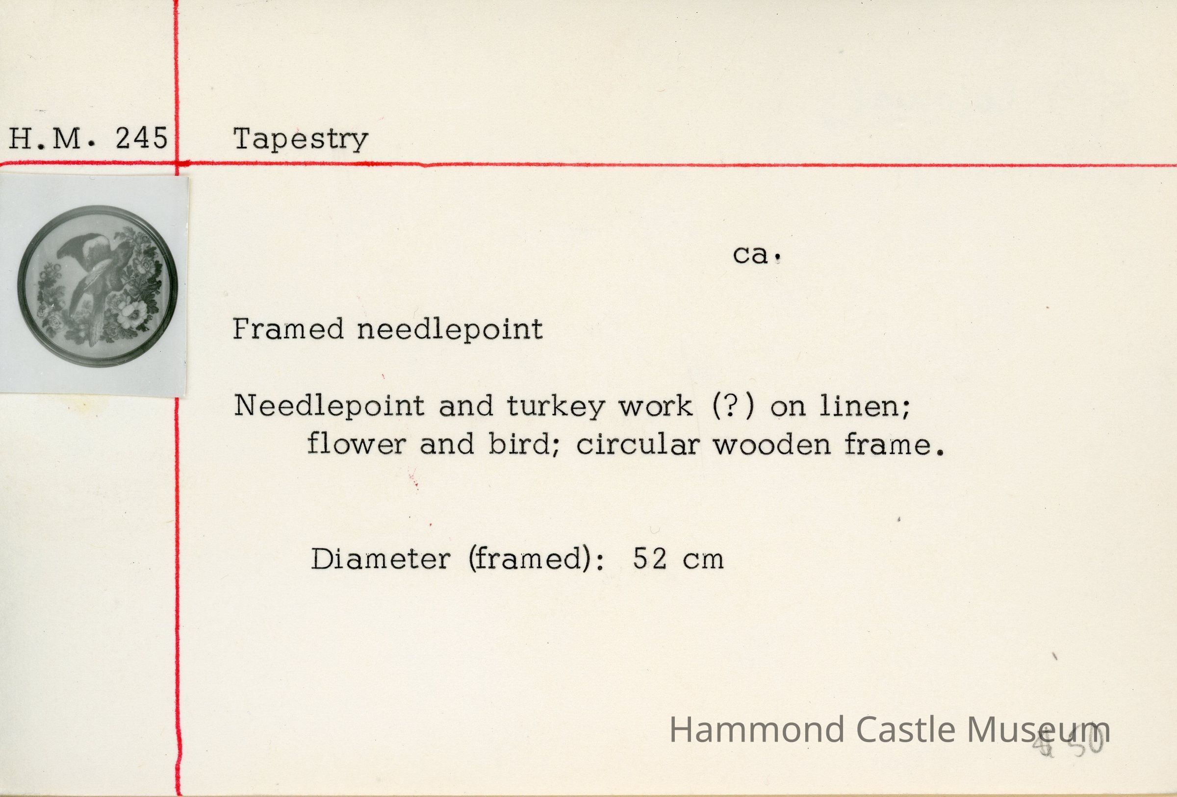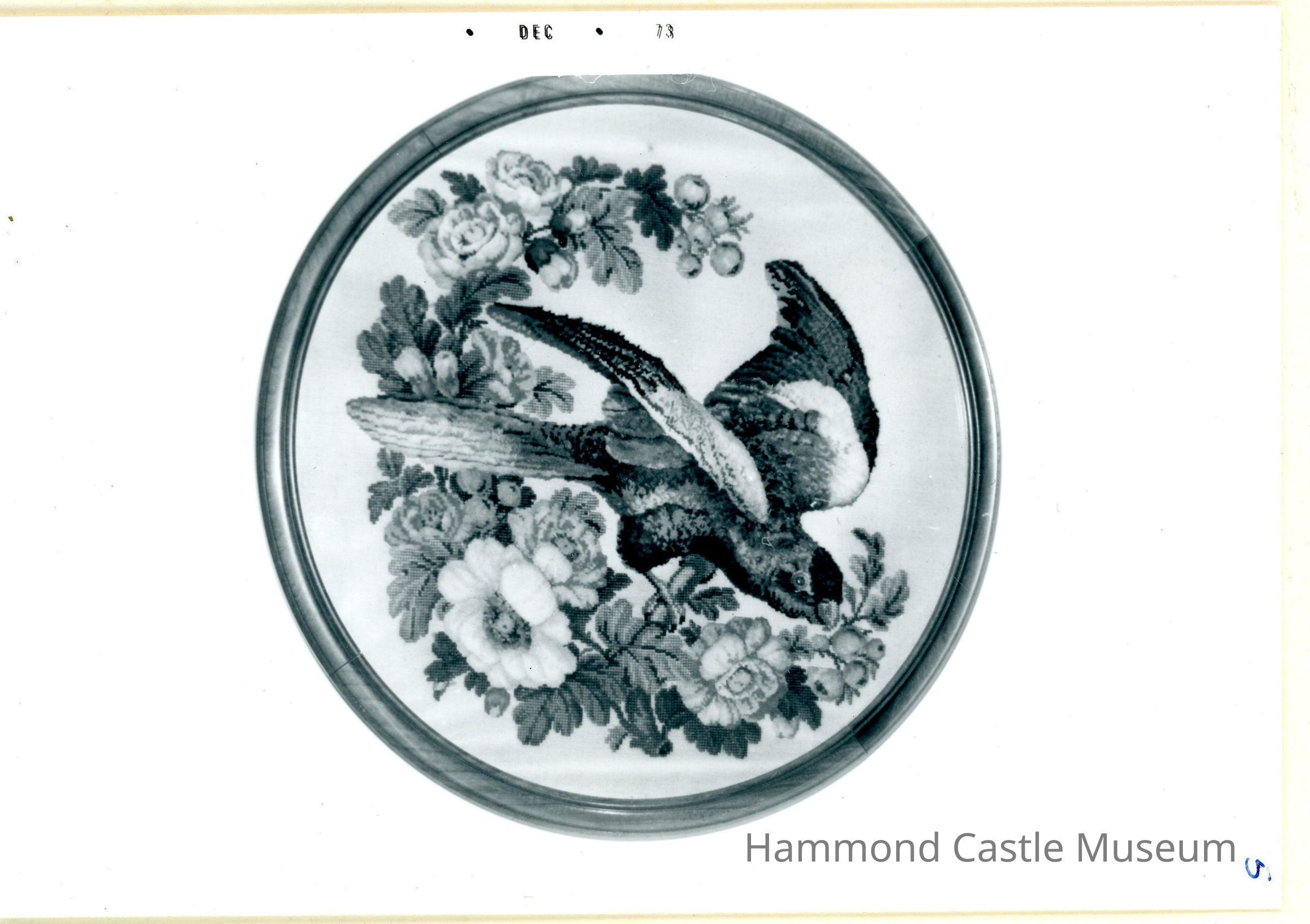 Framed needlepoint Turkey work (?) on linen; flower and bird; circular wooden frame 1965 Probate Inventory - Lower Guestroom