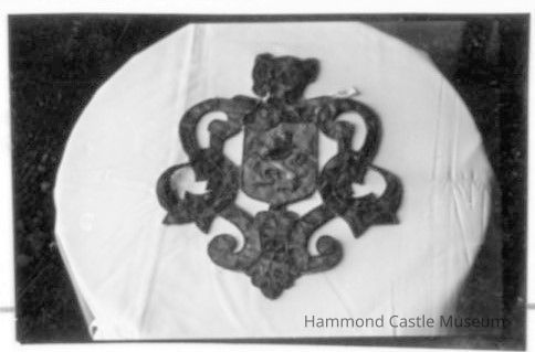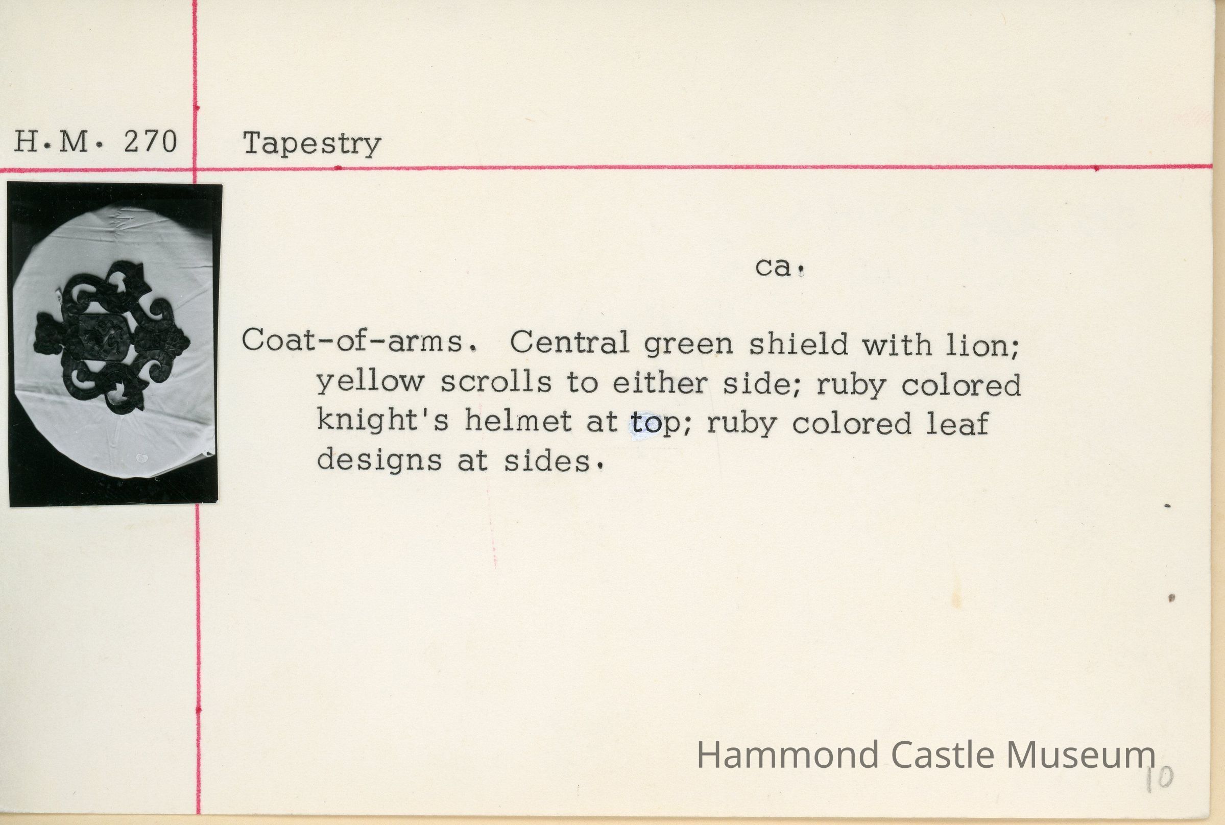 Coat-of-arms Central green shield with lion; yellow scrolls to either side; ruby colored knight's helmet at top; ruby colored leaf designs at sides