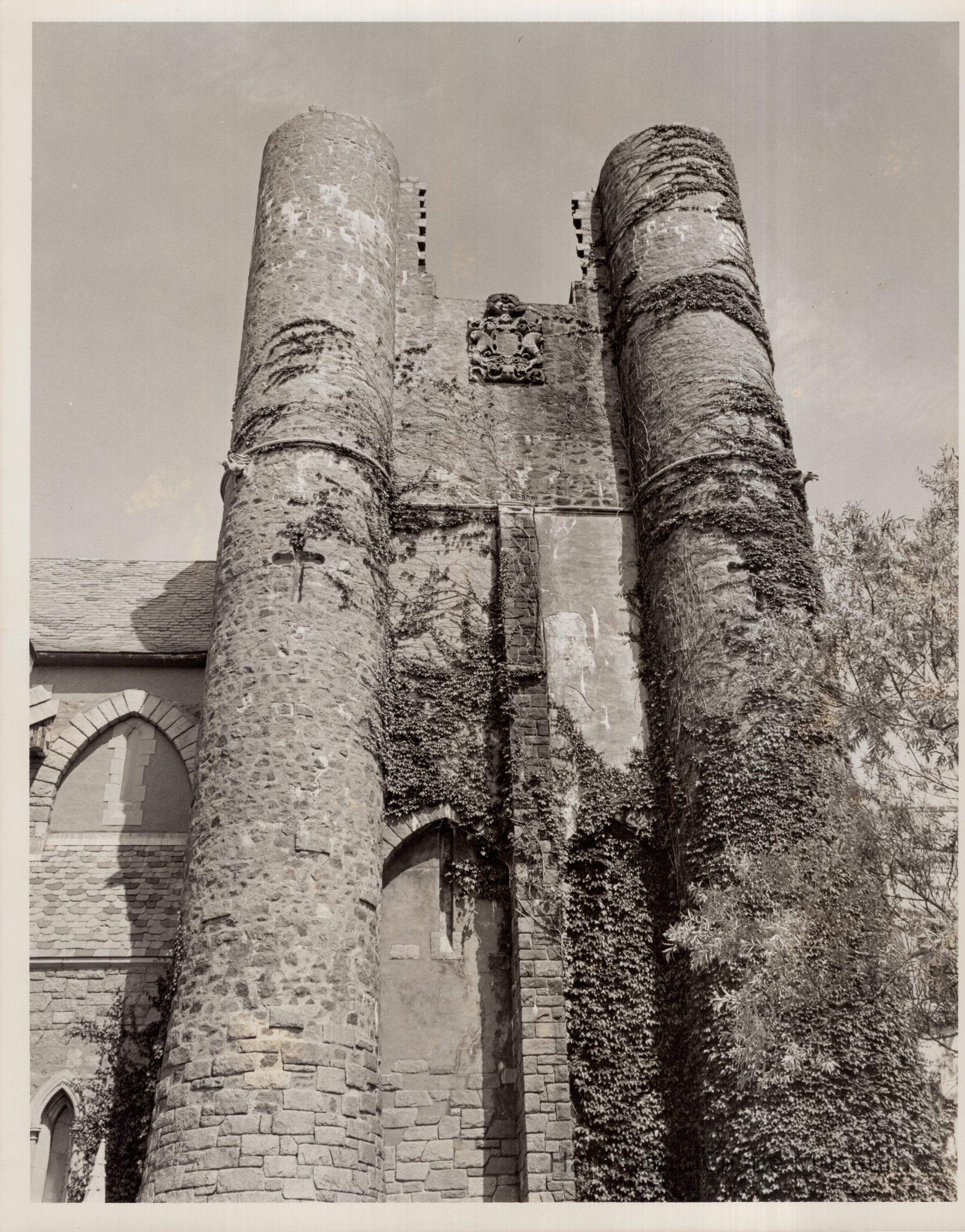 stone coat of arms plaque at top of tower wall on oceanside