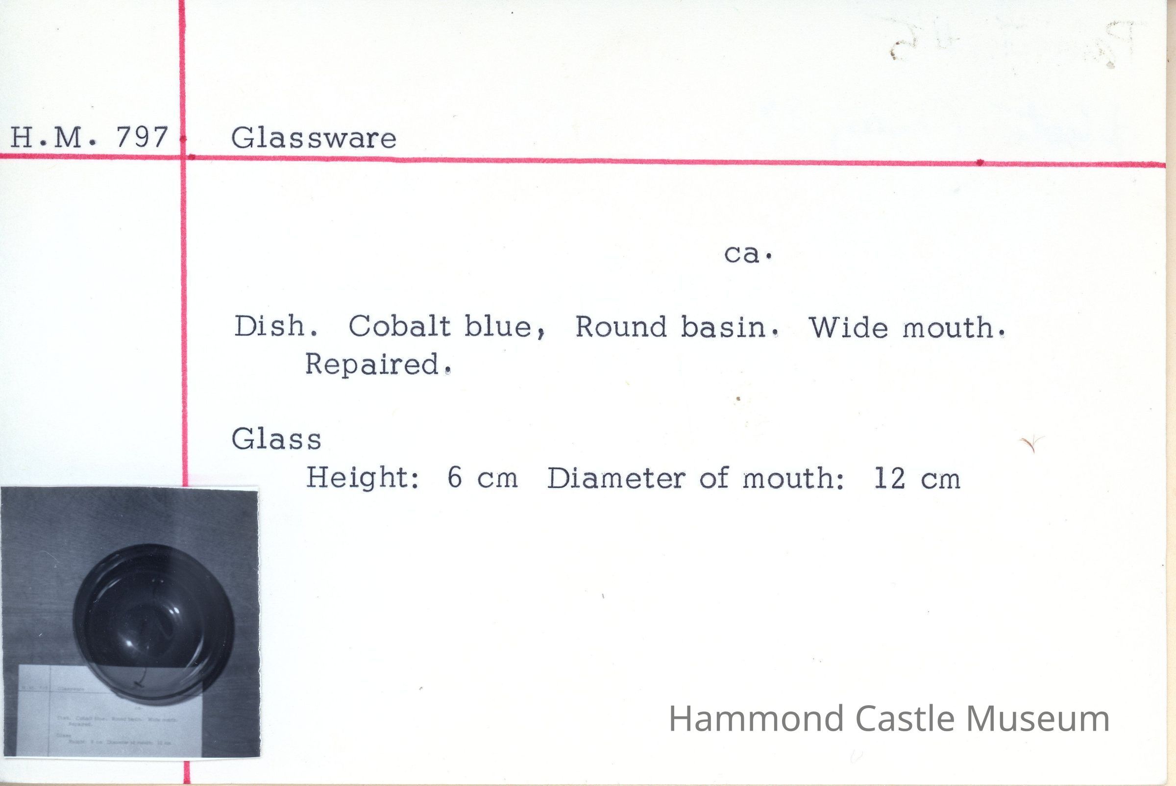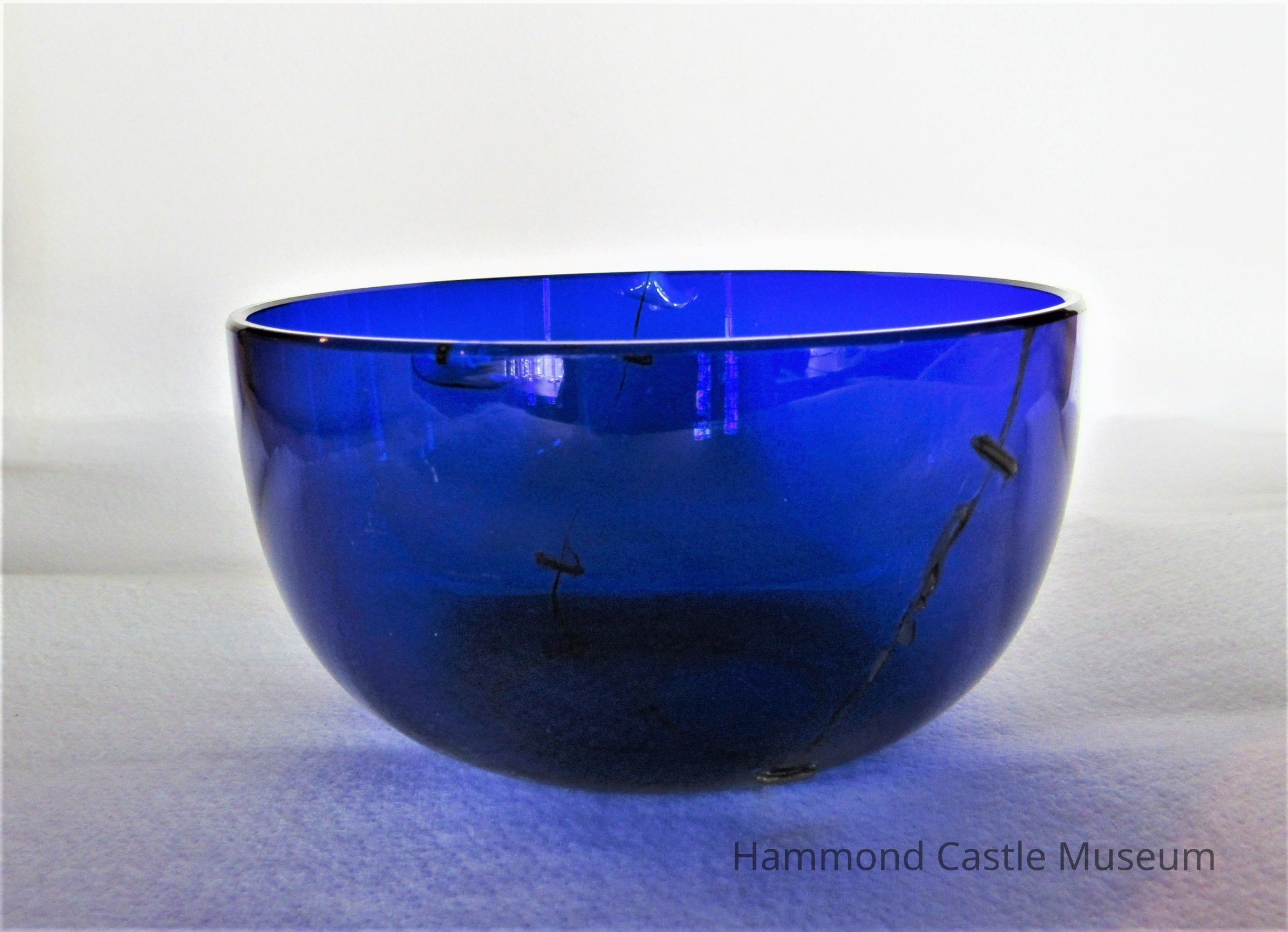 Dish. Cobalt blue. Round basin. Wide mouth. Repaired.