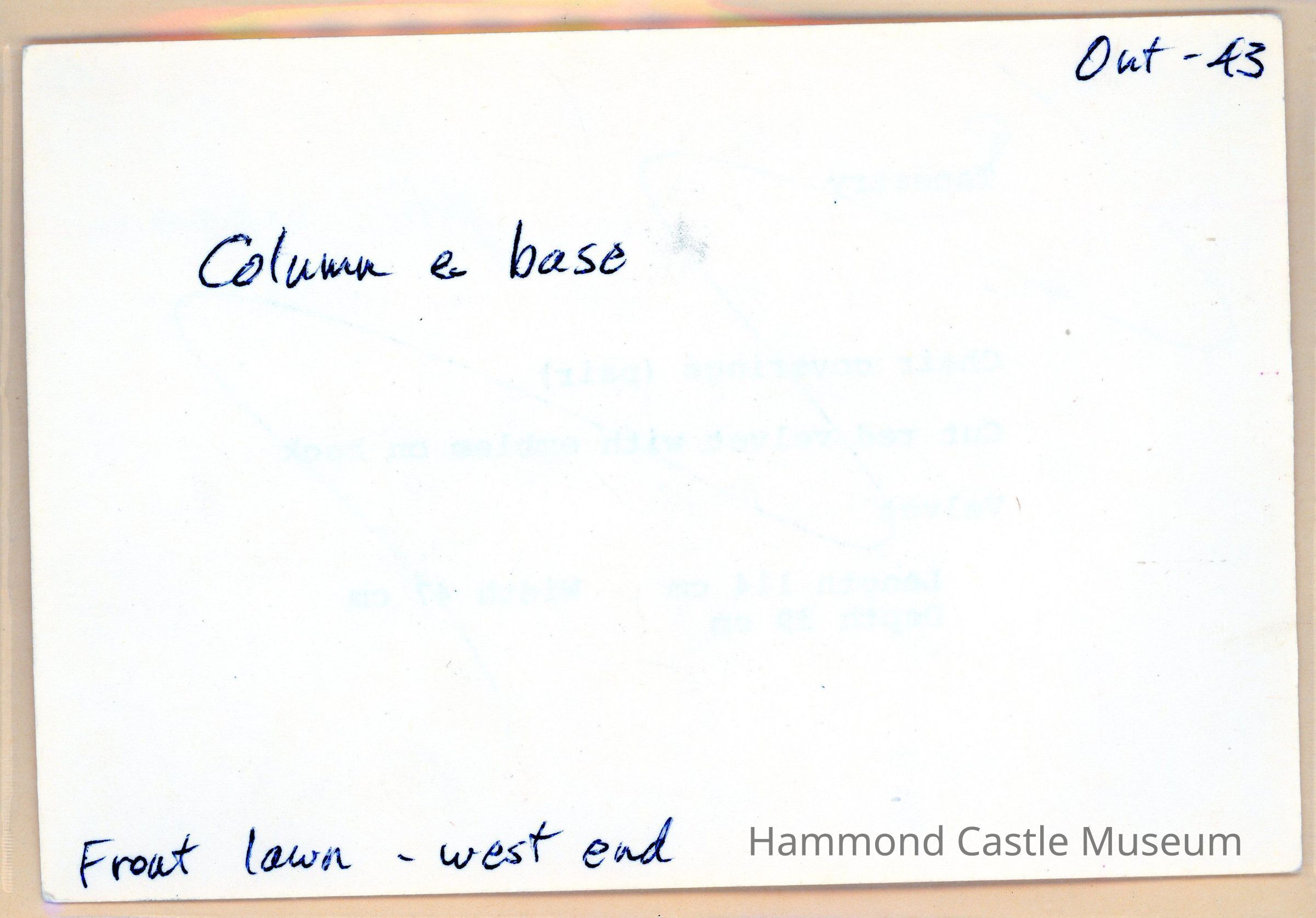 Column & base on west end of ocean lawn Currently broken and laying in undergrowth *2024 2 columns originally part of bell tower arches added to same location