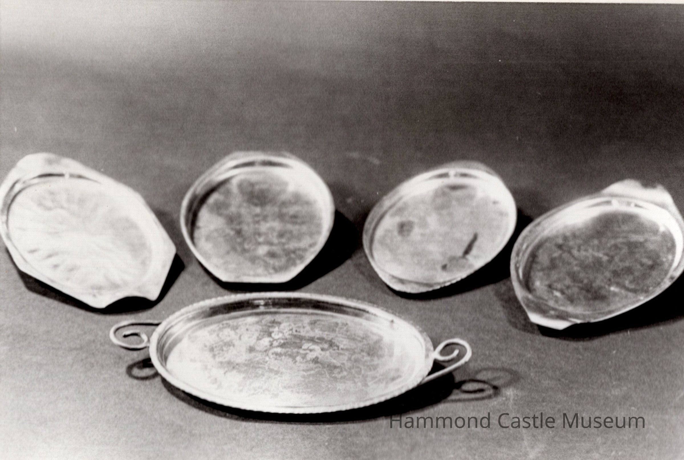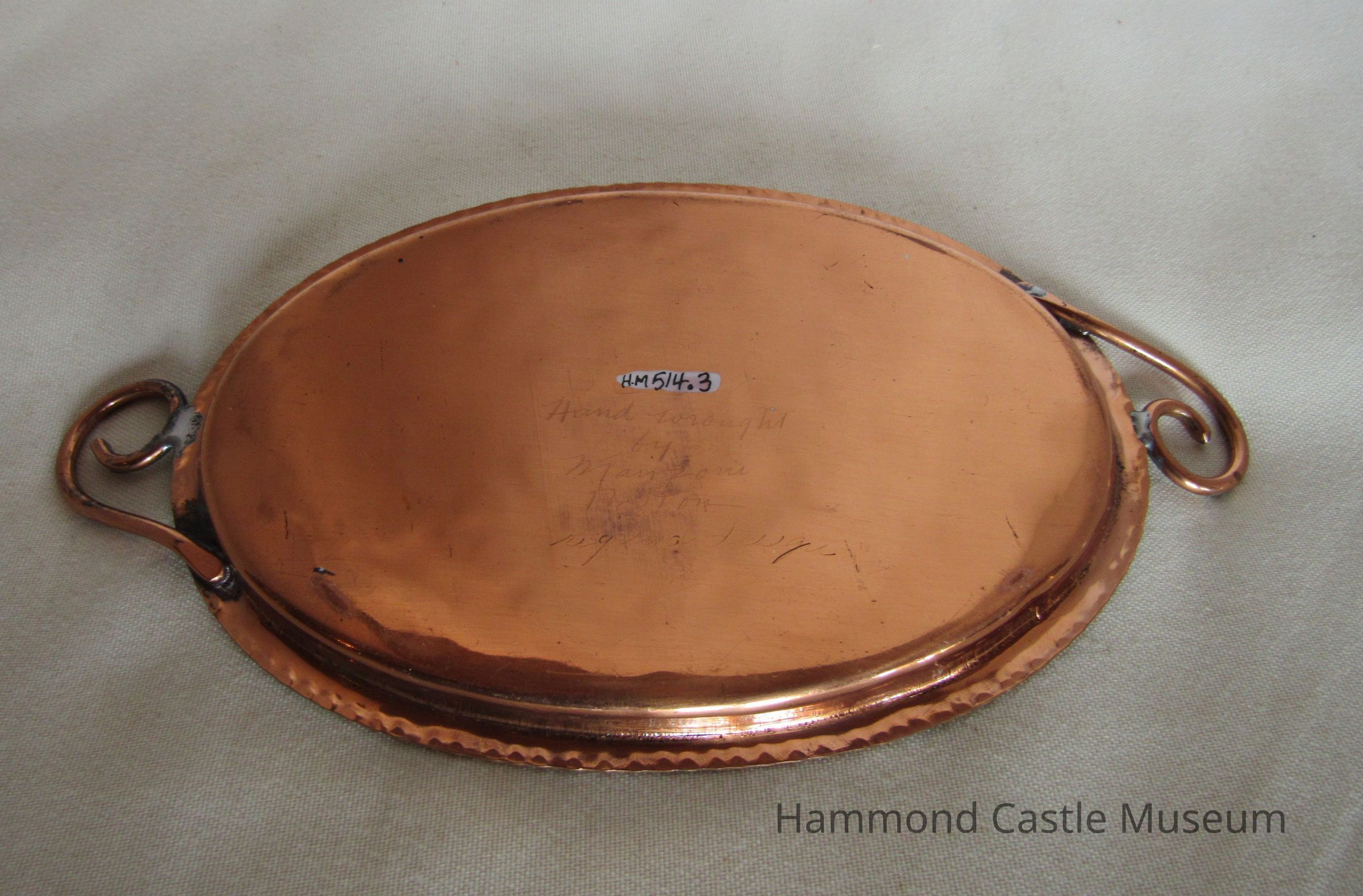 Set of 5 oval trays, slightly varying in handle design. Each signed in script on the bottom: "Hand wrought by Manzoni, Boston, original design".